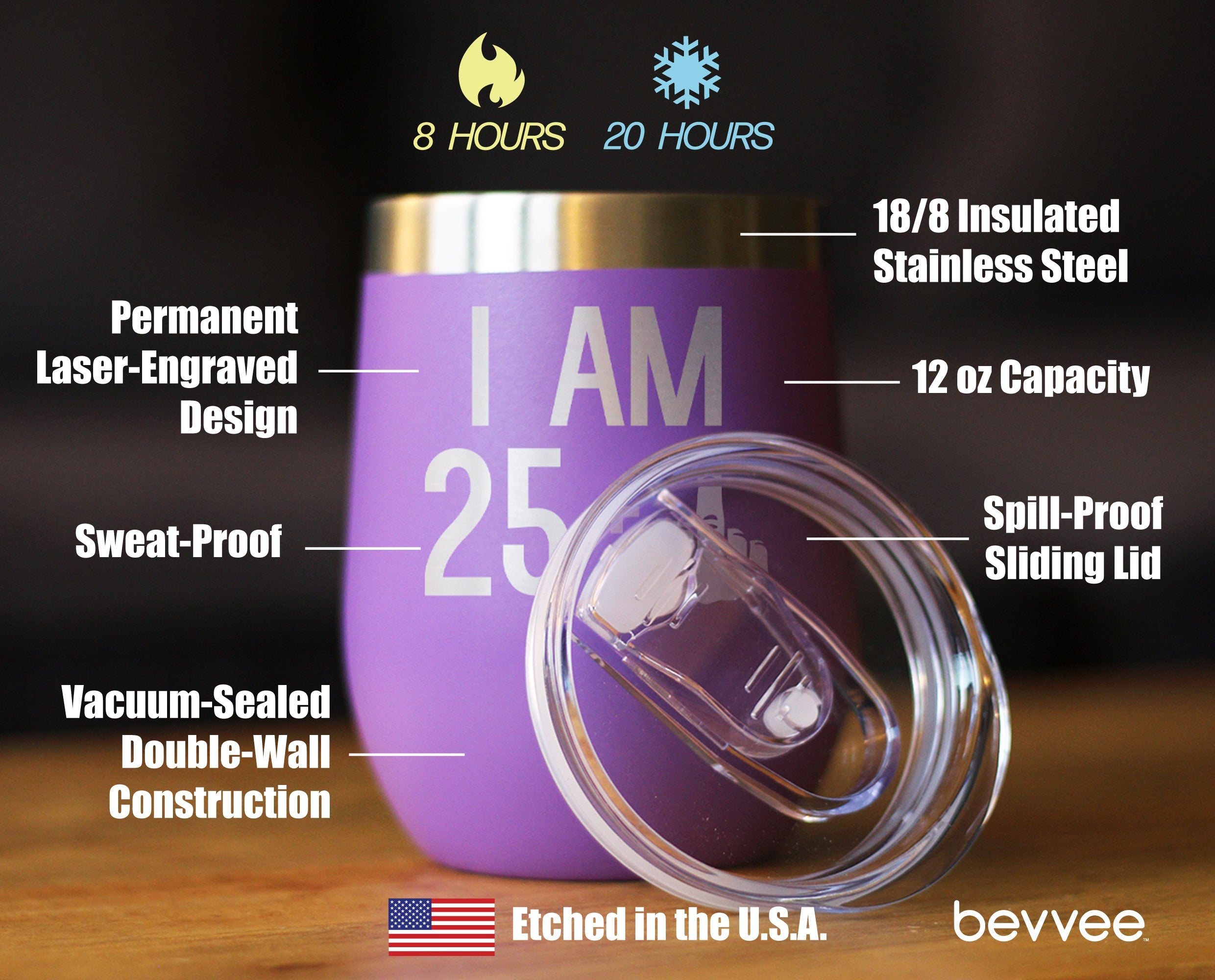 Make your favorite 25 year old bust out laughing with this hilarious birthday wine tumbler! Eye catching text meticulously etched (not printed) into the powder coating so that it never wears off. This cup makes the ultimate birthday gift for men & women turning twenty five with a sense of humor.