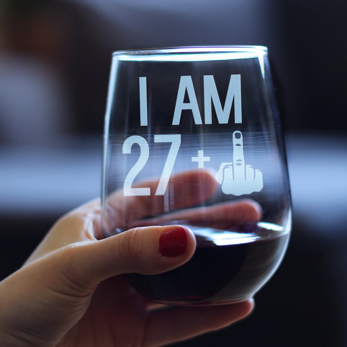 27 + 1 Middle Finger Funny Stemless Wine Glass, Large 17 Ounce Size, Etched Sayings, 28th Birthday Gift for Women Turning 28