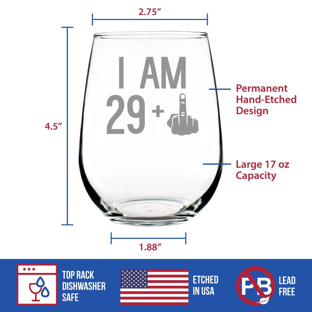 29 + 1 Middle Finger - 30th Birthday Stemless Wine Glass for Women & Men - Cute Funny Wine Gift Idea - Unique Personalized Bday Glasses for Best Friend Turning 30 - Drinking Party Decoration