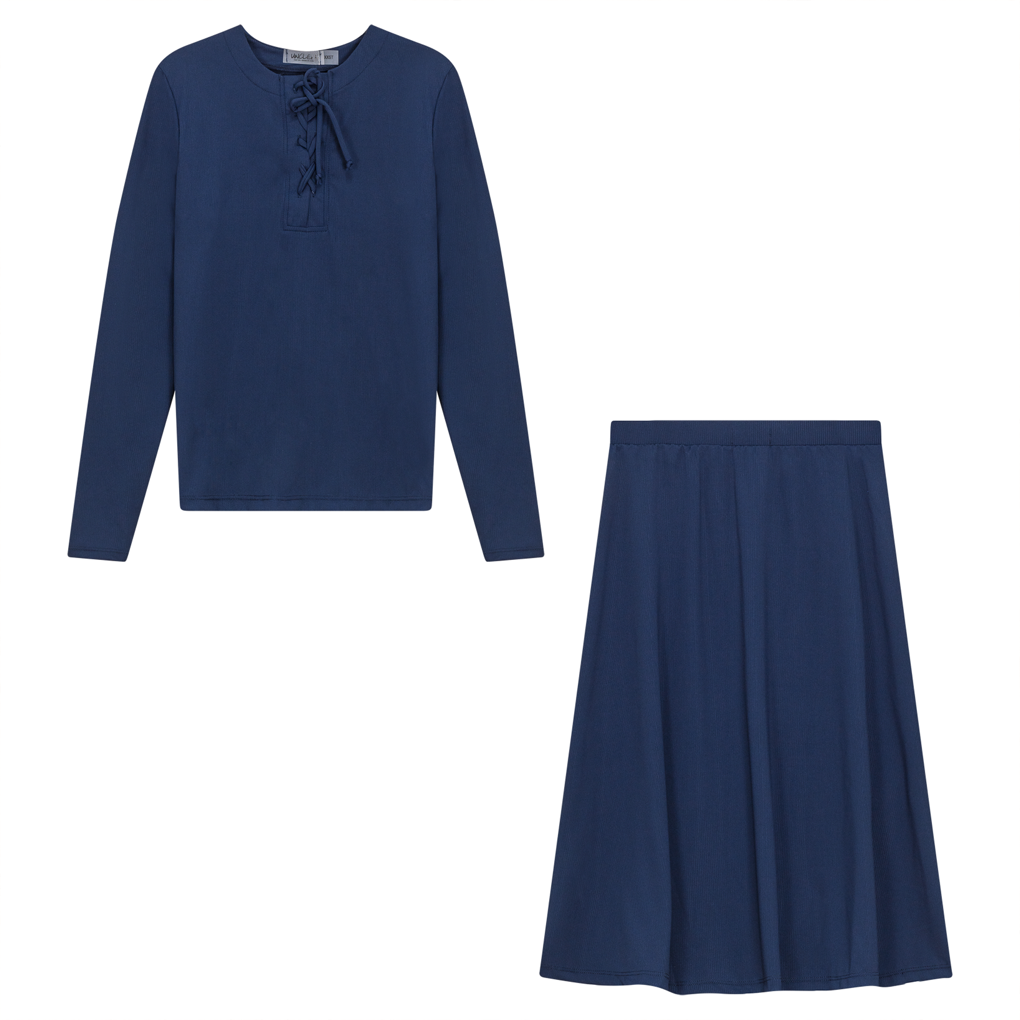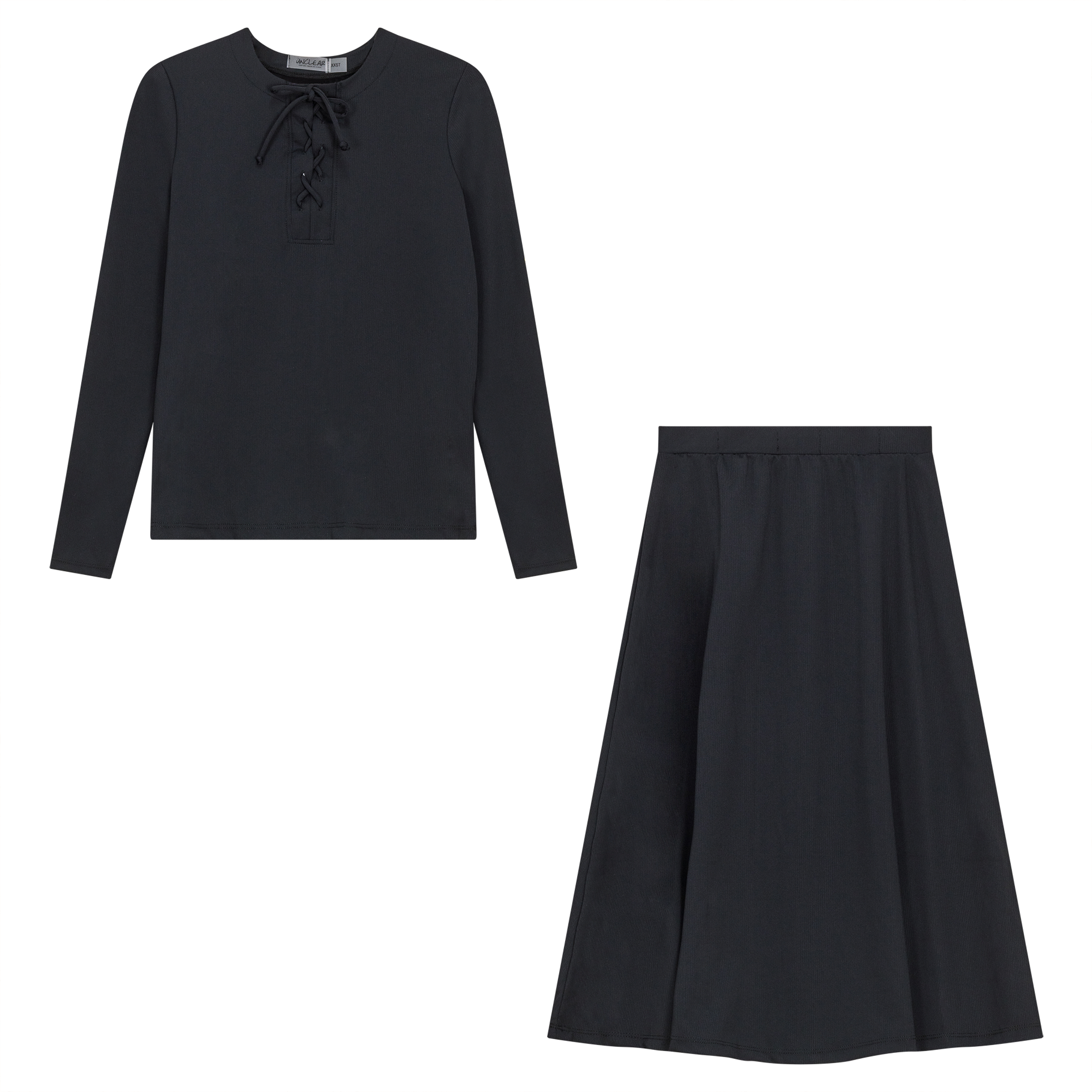 Teen 2 piece swim set. Long sleeve top with tubular straps with fake opening at center front. Matching a-line skirt with covered elastic waistband. ֲ