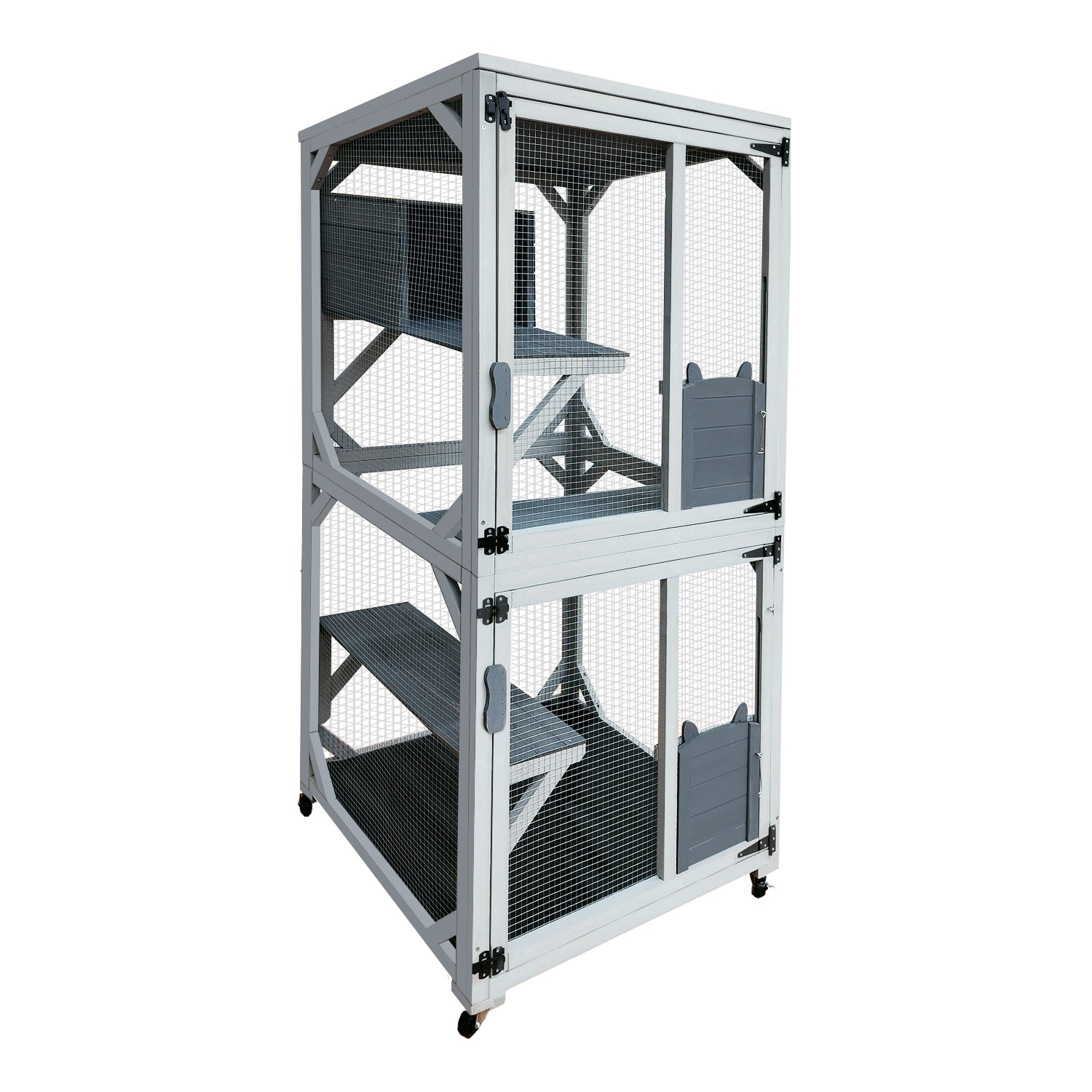 30.7' Wooden Catio Outdoor Cat Enclosure, Luxury Cat House on Wheels with Napping House, 4 Platforms & Weatherproof Asphalt Roof, Large Kitty Cat Condo Cage Shelter Playpen with Sliding Doors ‐ Default