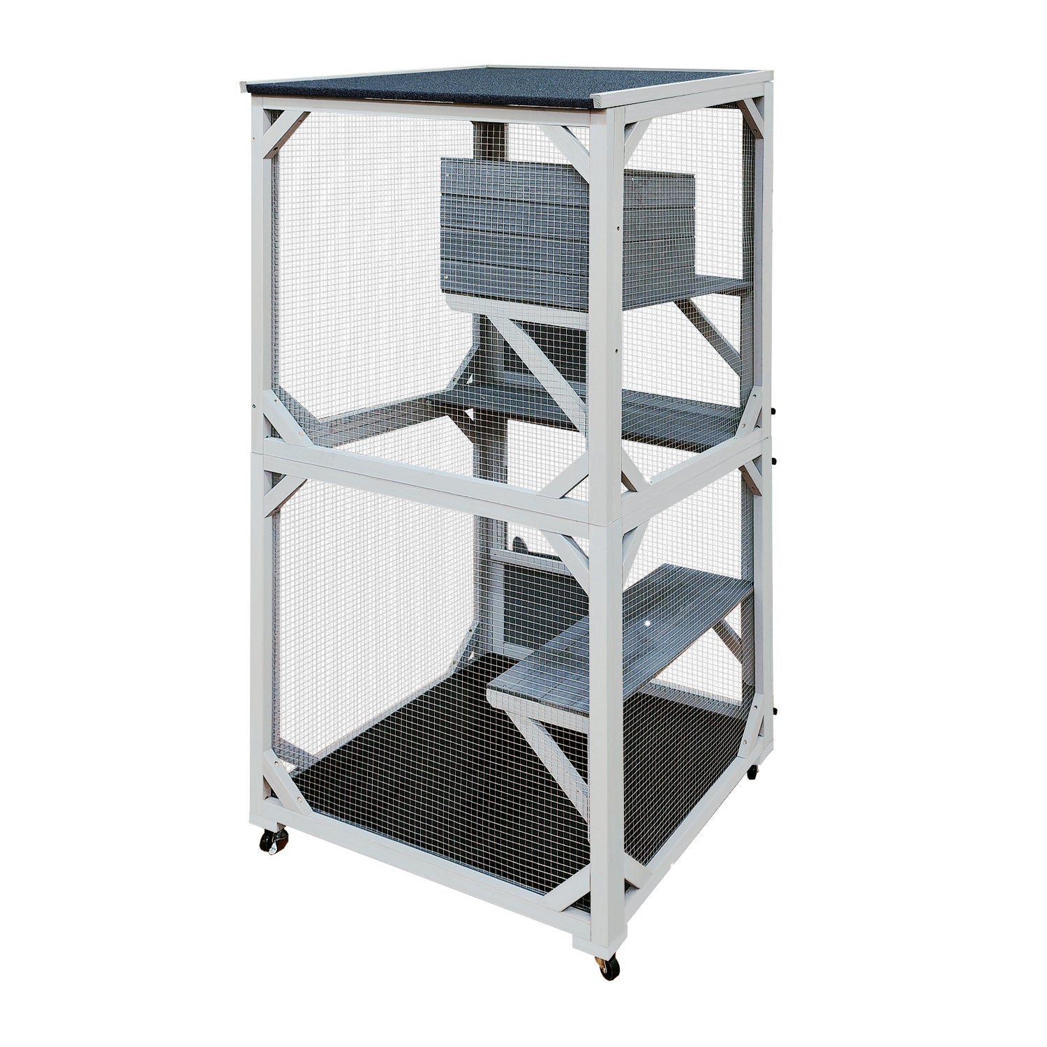 - Durable Construction: Made of solid fir wood with Eco-friendly water-based painting and supported by strong triangle brackets. Moreover, with a waterproof and sun-proof sloping asphalt roof, the cat cage can protect your pets from any bad weather.