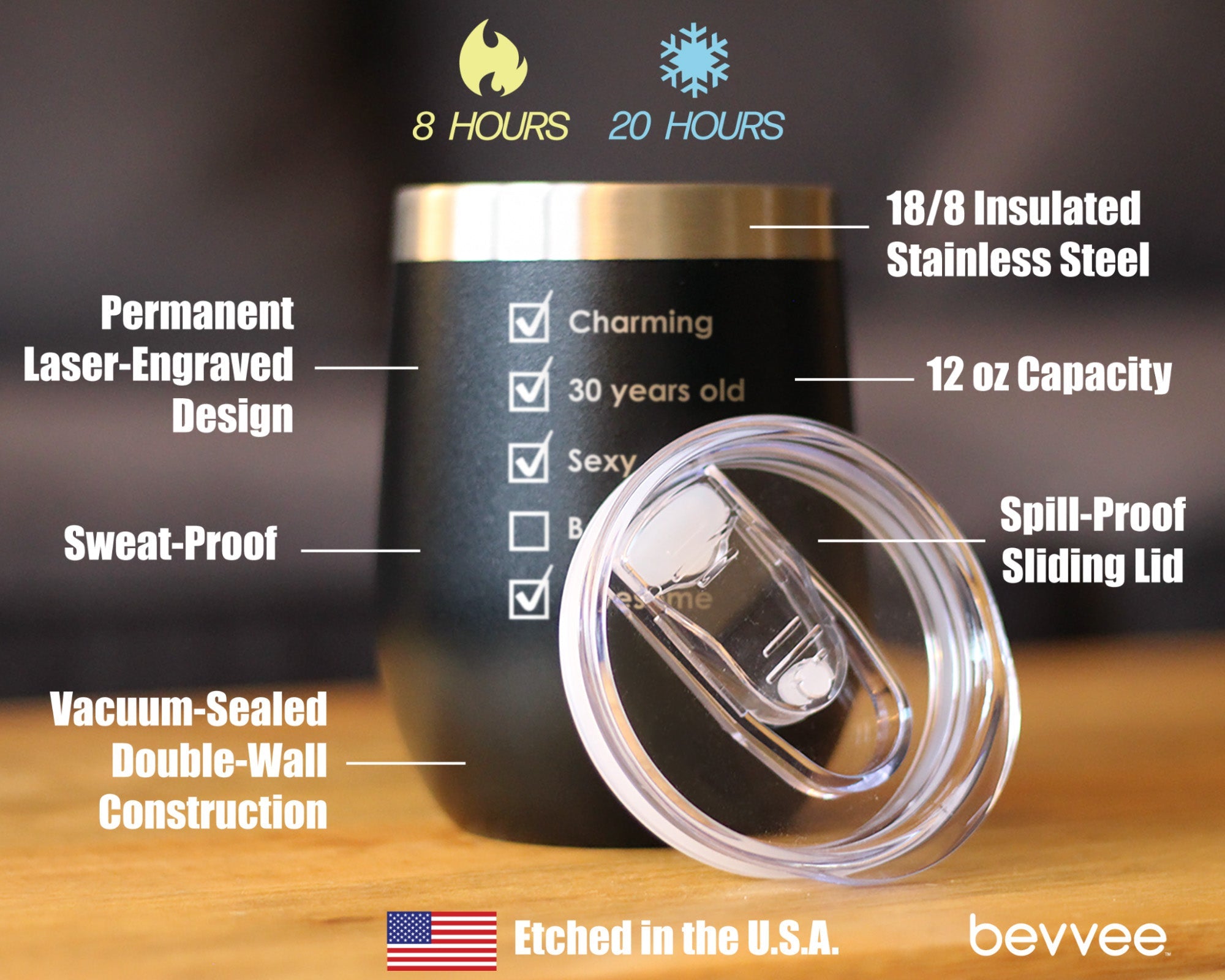 30th Birthday Checklist - Wine Tumbler Cup with Sliding Lid - Stainless Steel Insulated Mug - Funny Gifts for Women and Men Turning 30