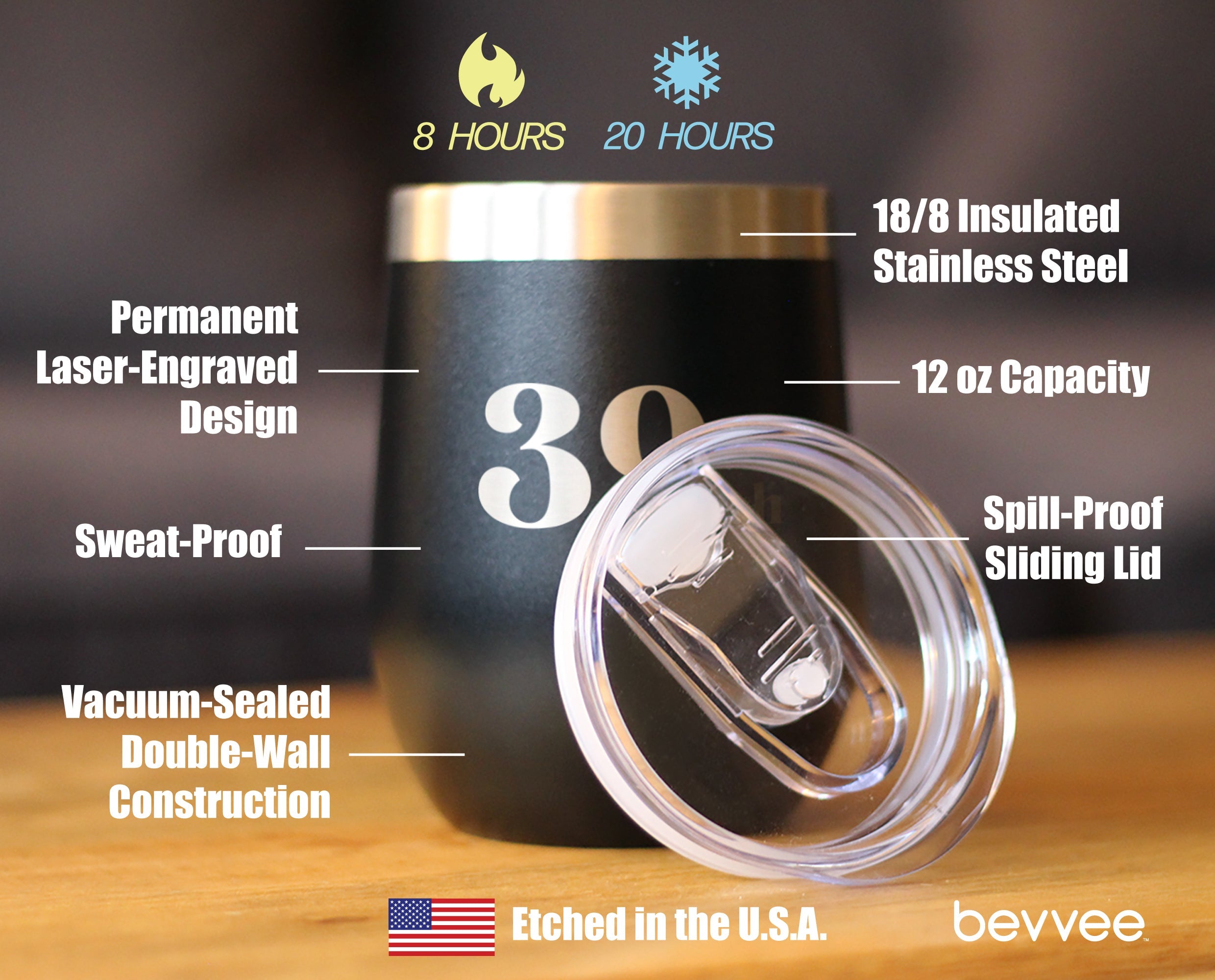 Our 12oz. stemless wine tumblers with sliding lids feature stainless steel double-wall construction, vacuum insulated for 2X cold and heat retention compared to glass or plastic containers! Etched in America.