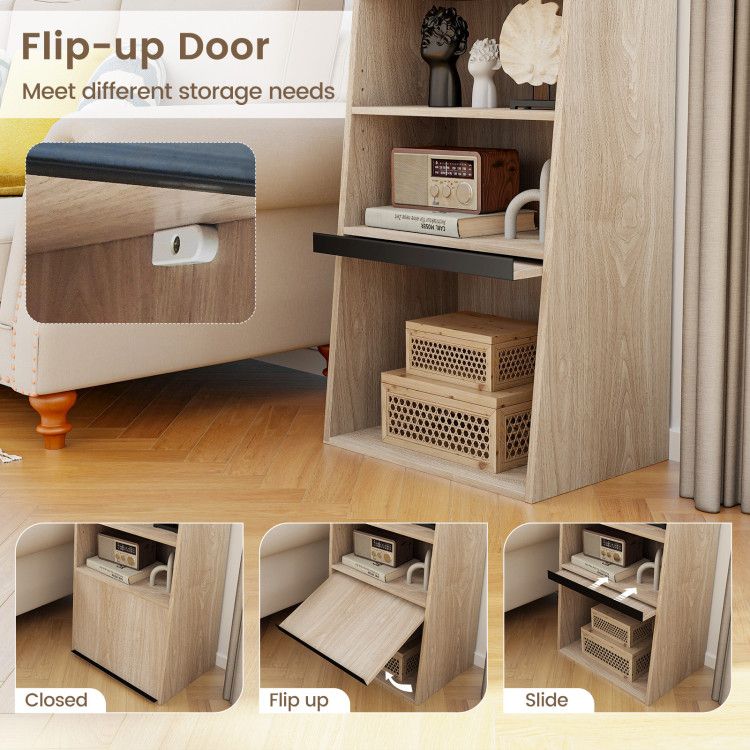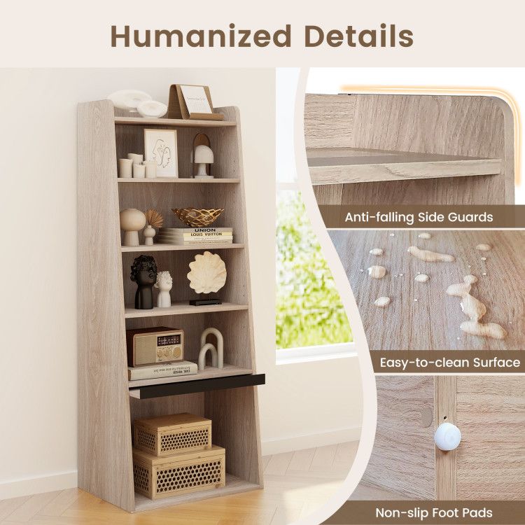 6-Tier Bookcase Freestanding Ladder Bookshelf with 2 Adjustable Shelves and Flip Up Door ‐ Natural