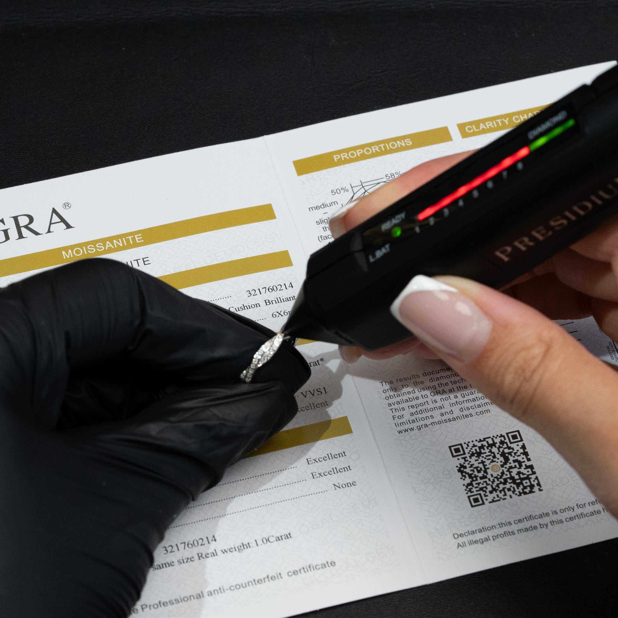 Each ring comes with moissanite certificate report. Our moissanite passes the diamond tester.