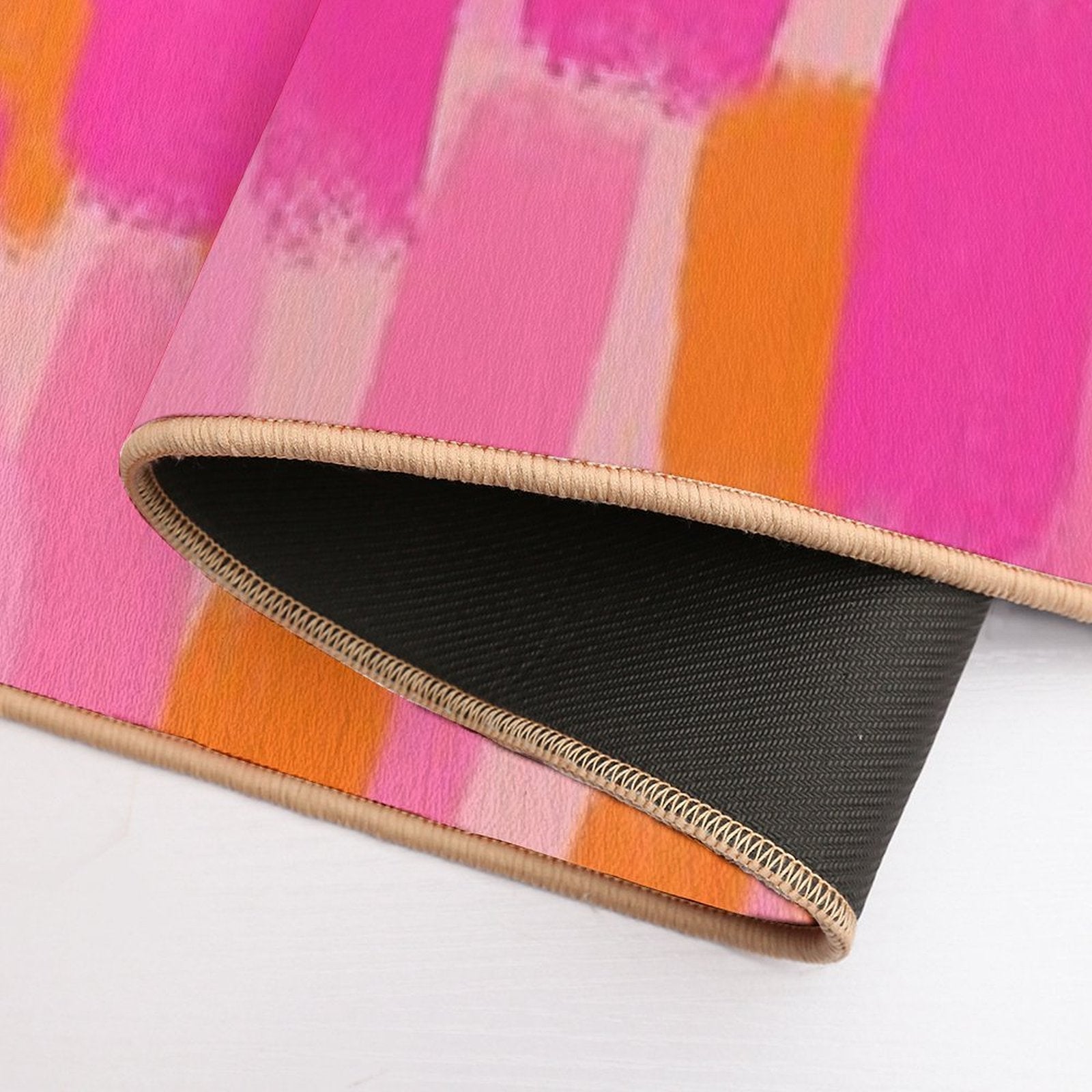 - Non-slip rubber backing grips floors securely, ideal for Abstract, Pink with Orange, Paint Brush Effect Mat placements on tiles, wood, or marble.