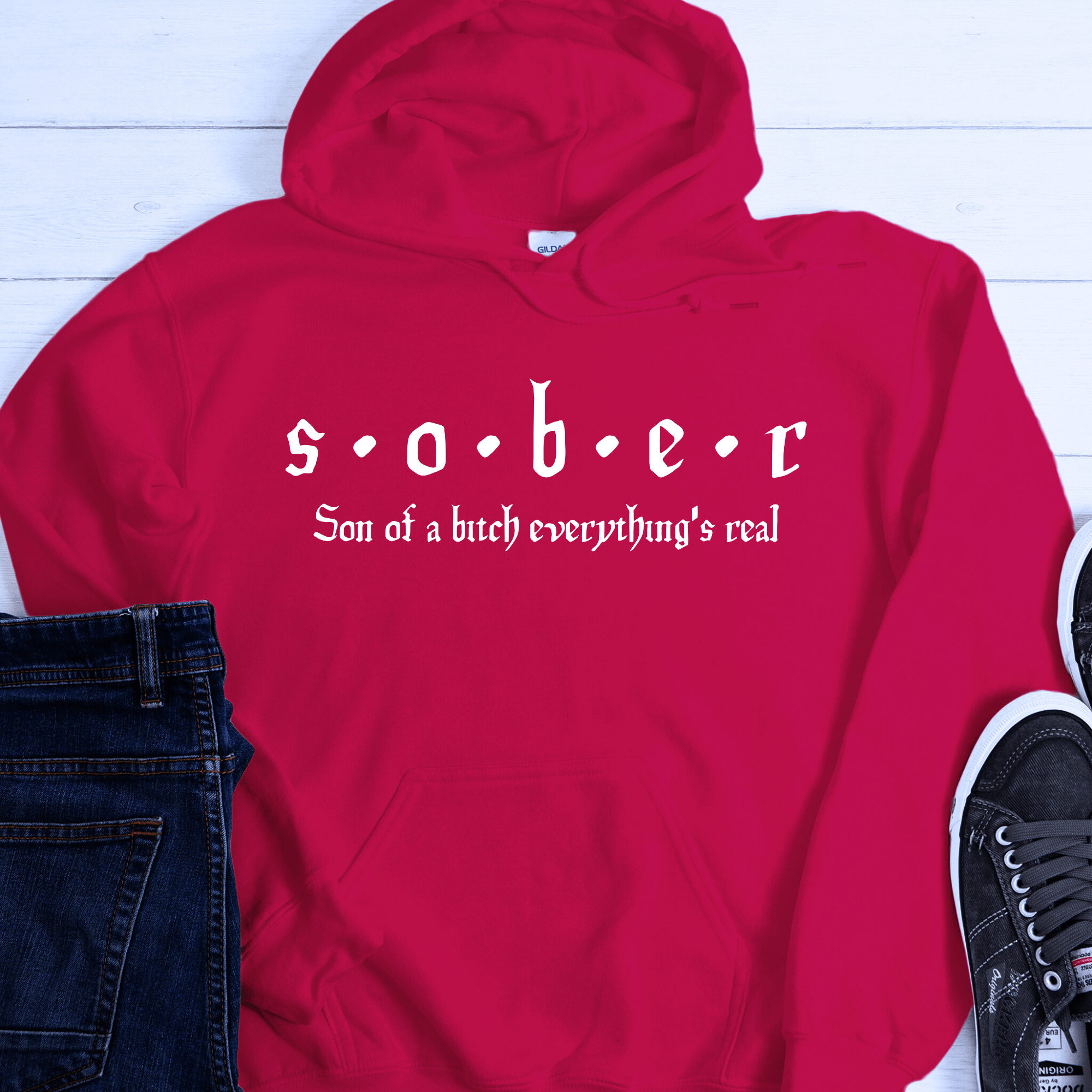 Introducing our Addiction Recovery Hoodie, designed to inspire and support sobriety. Our S.O.B.E.R. acronym (son of a bitch, everything's real) perfectly captures the journey to recovery. Embrace your strength and wear your progress with pride. Stay strong in style.