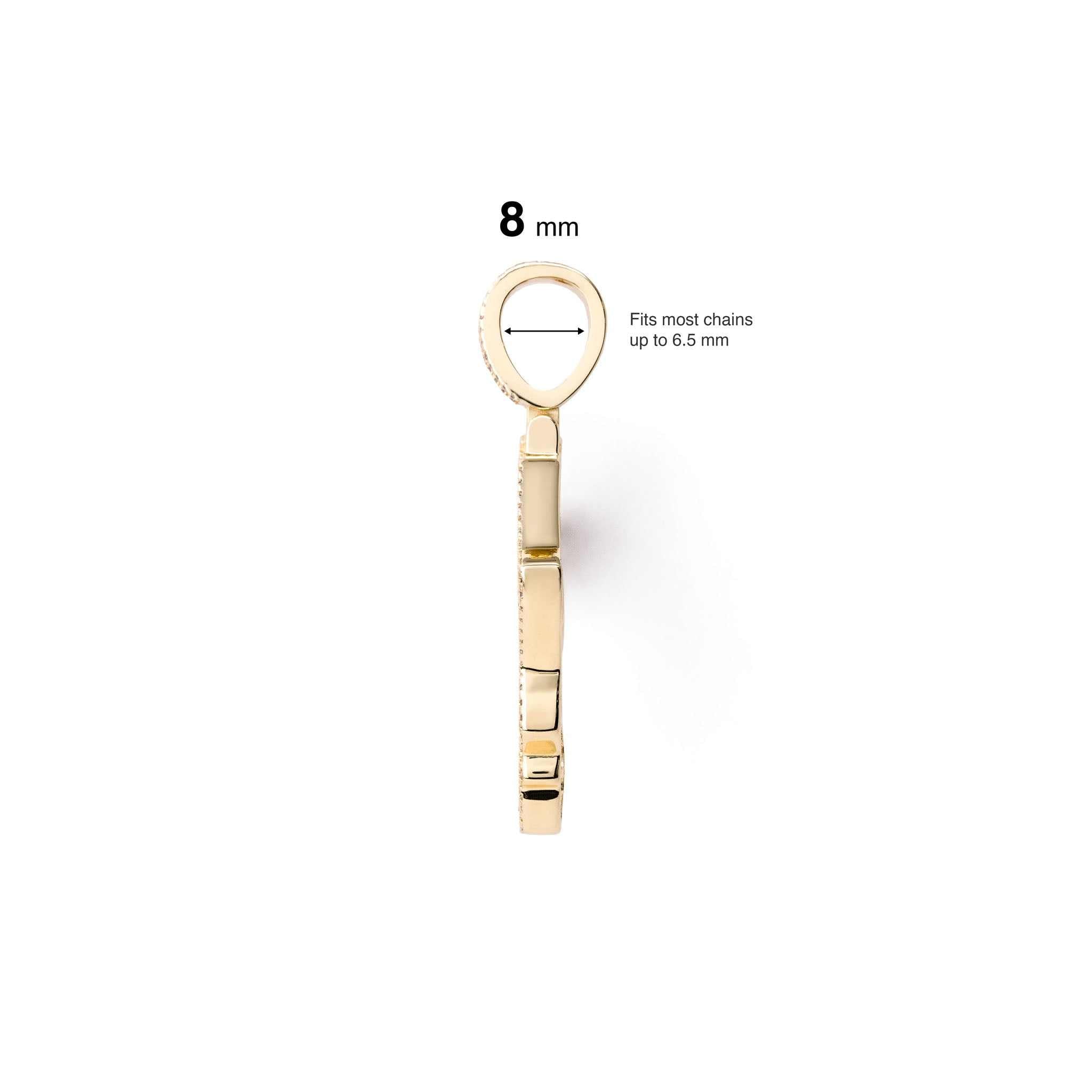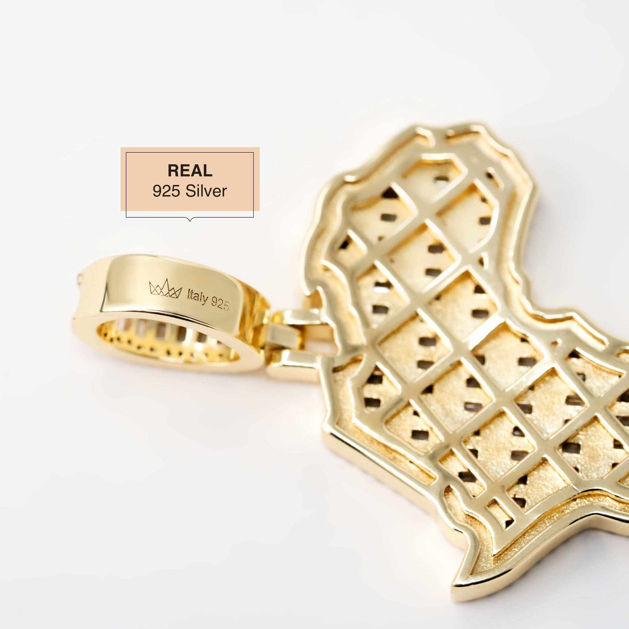 Measuring 1.5" by 1.5" and 2" including the bale, this pendant boasts impressive dimensions that catch the eye. It is designed to effortlessly fit chains up to 3mm thick, offering versatility in styling options. For those seeking opulence, we provide a 14K gold option, where genuine yellow gold is bonded to the natural silver, resulting in a stunning combination of elegance and luxury.