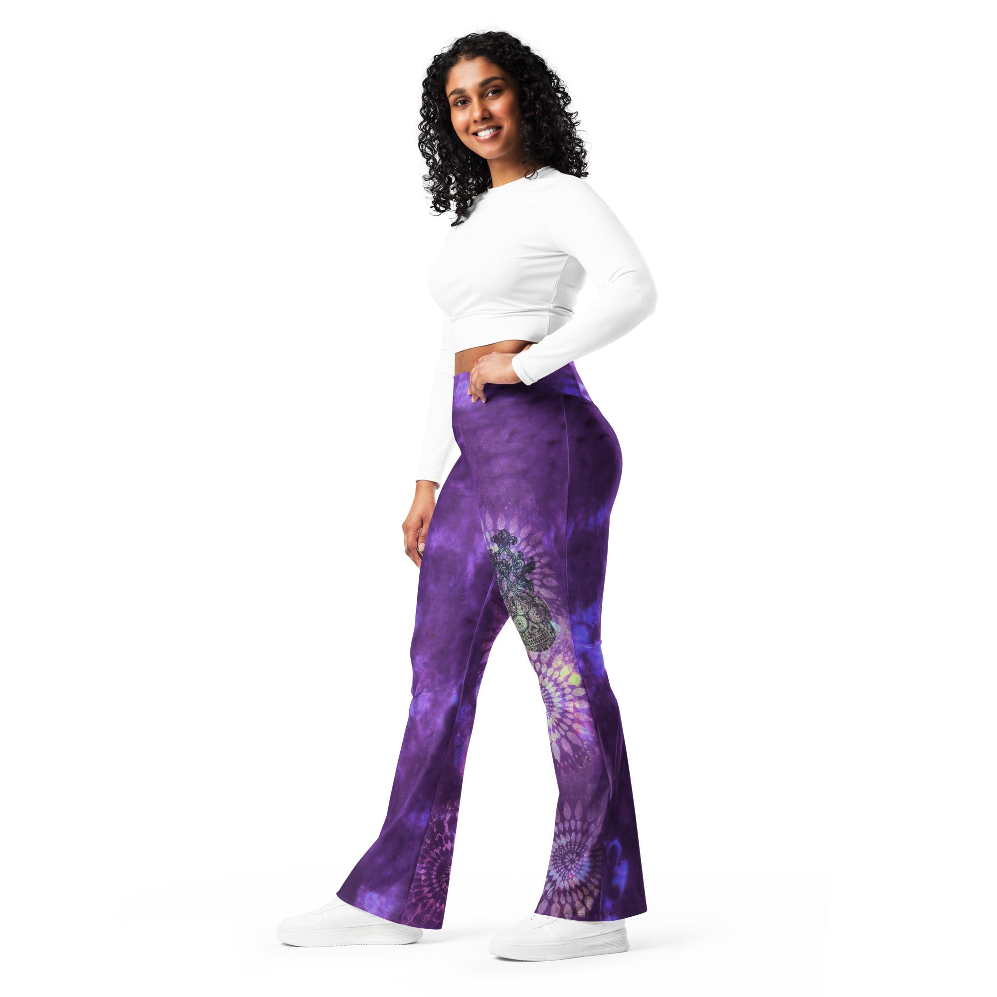 These stylish leggings are designed to enhance your figure with their high waist and butt-lifting cut. The flared leg bottoms not only add a touch of style but also make the leggings comfortable to wear. Whether you're going for a walk, hitting the gym, or styling them up with a bomber jacket or hoodie, these leggings are versatile and trendy."These trendy leggings are designed to enhance your figure with their high waist and butt-lifting cut. The flared leg bottoms not only add a touch of style but also make the leggings comfortable. You can wear them on a walk, to the gym, or style them up with a bomber jacket or hoodie.