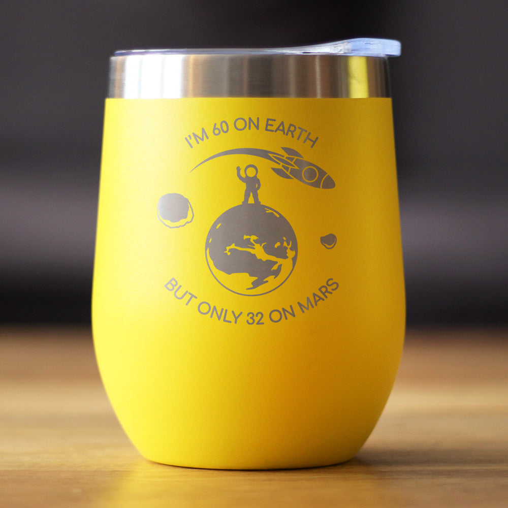 Age on Mars 60 - Wine Tumbler Cup with Sliding Lid - Stainless Steel Insulated Mug - Unique Funny 60th Birthday Gifts for Women and Men ‐ Yellow