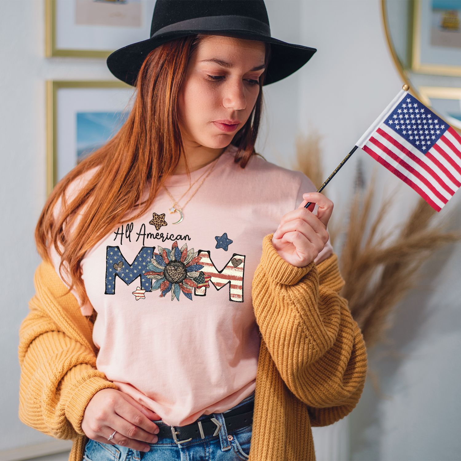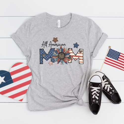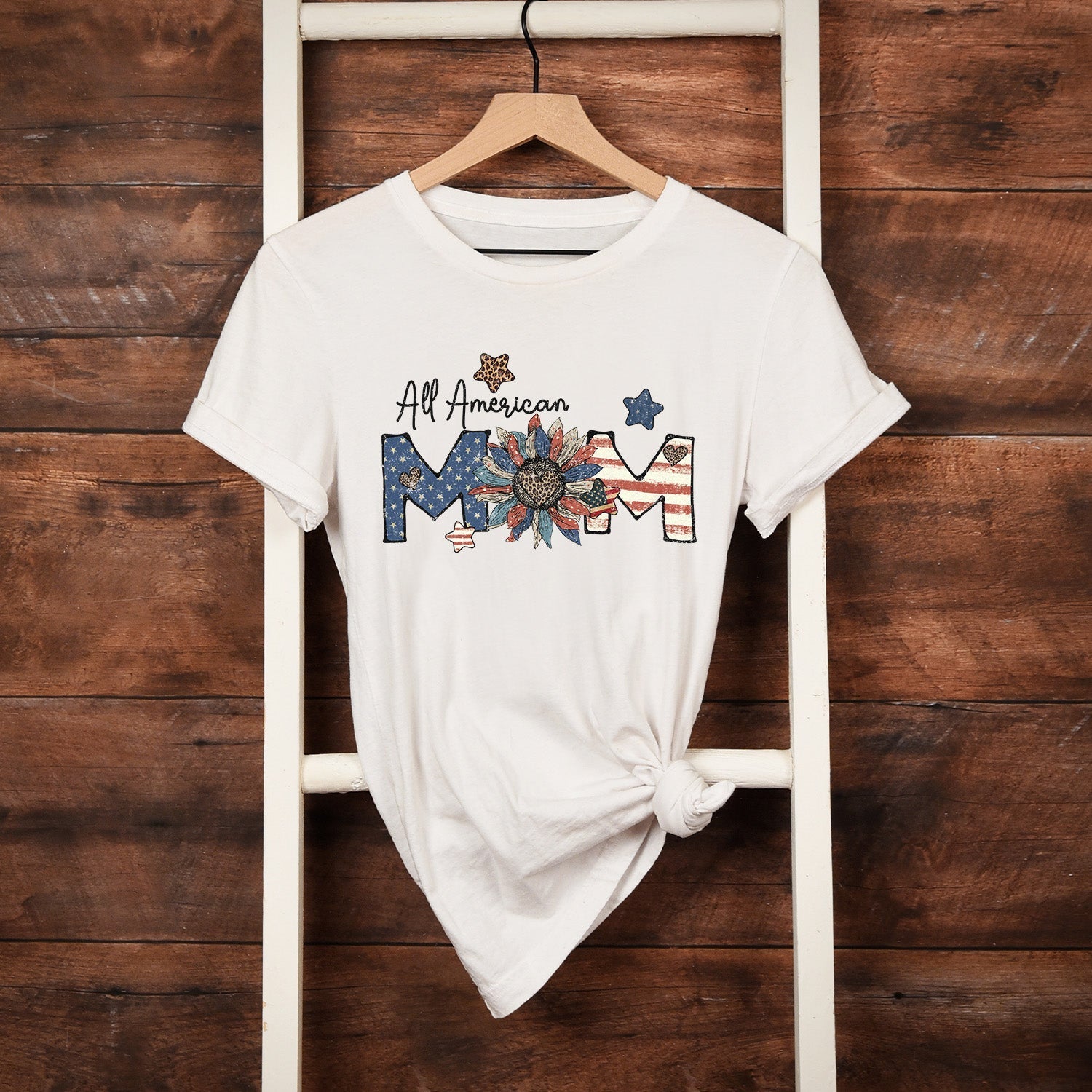 Celebrate the spirit of motherhood and patriotism with our All-American Mom T-Shirt! This stylish and comfortable tee is perfect for moms who proudly wear their love for family and country.