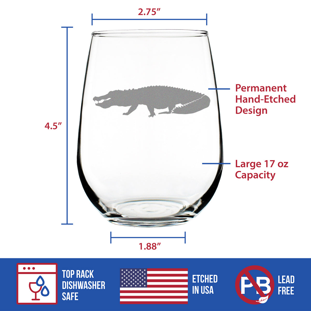 Alligator Stemless Wine Glass - Unique Exotic Animal Gifts for Alligator Lovers - Large 17 Oz Glass