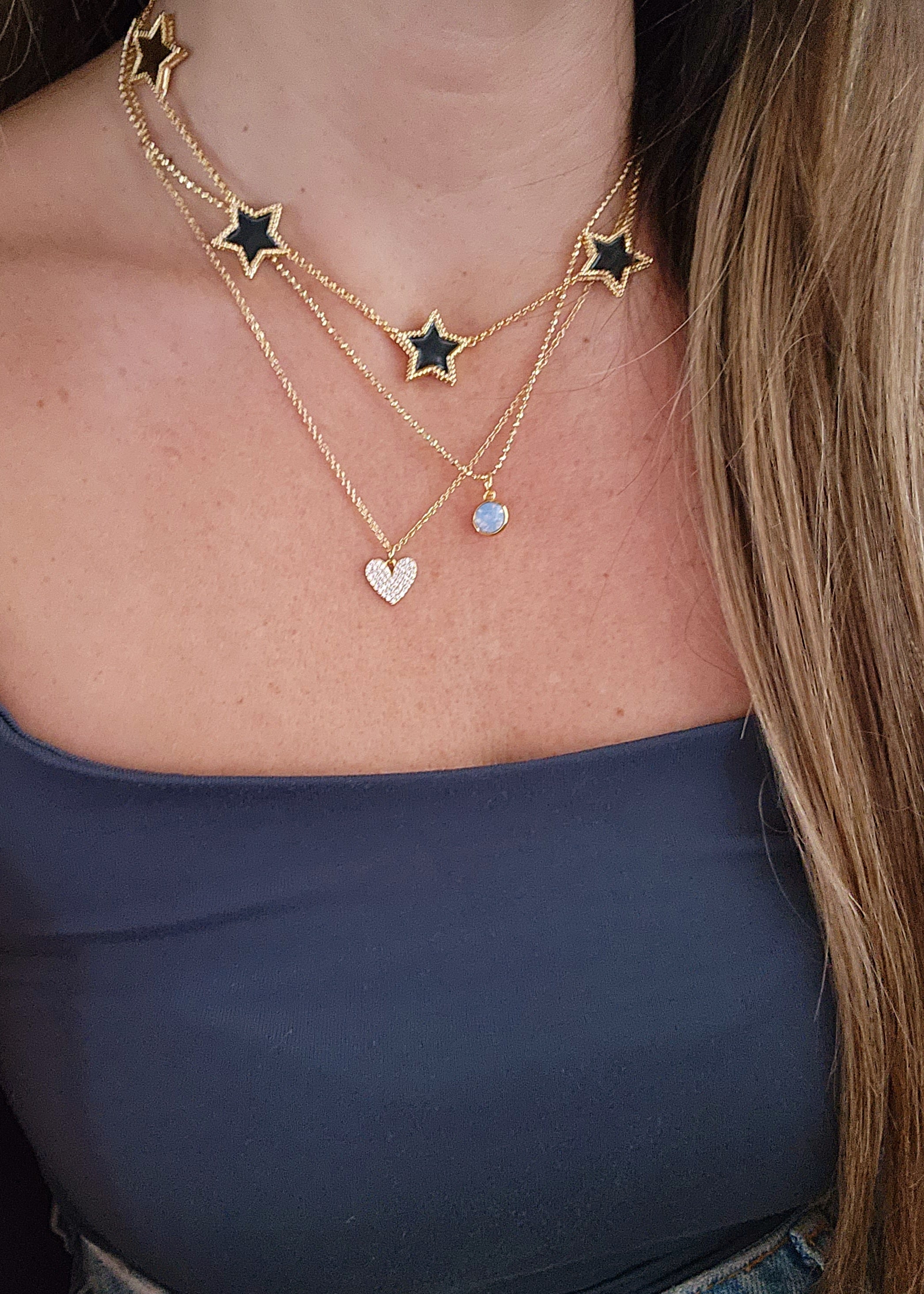 This ANGELAH CHOKER is crafted of 18K gold-filled and enamel and features stunning star charms. The hypoallergenic necklace measures 15" plus 2.5" extension for a perfect fit. A truly unique accessory for any occasion.