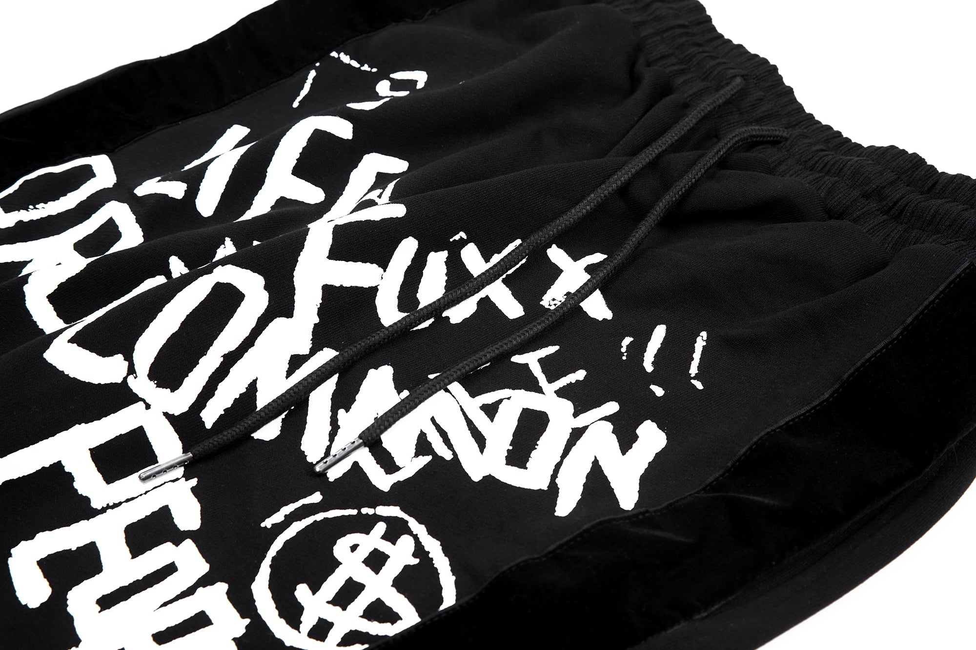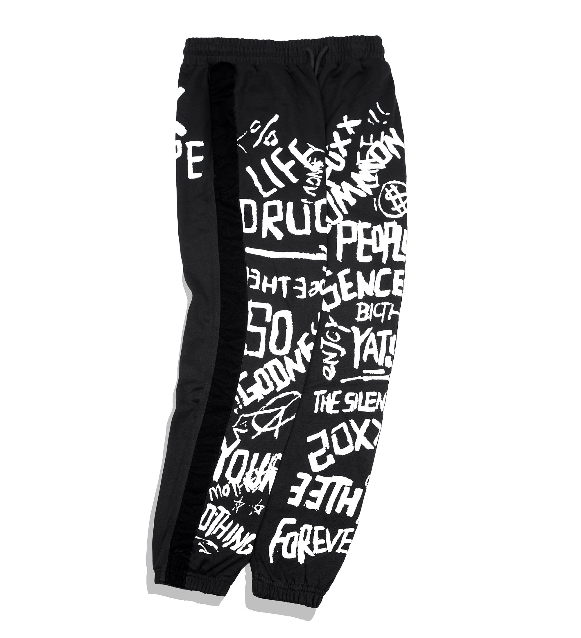 - Graffiti style doodle artwork graphic designs all over the front of the pants