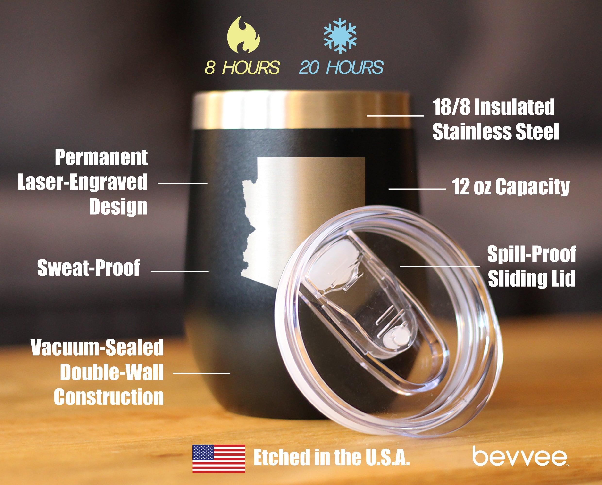Our 12oz. stemless wine tumblers with sliding lids feature stainless steel double-wall construction, vacuum insulated for 2X cold and heat retention compared to glass or plastic containers! Etched in America.