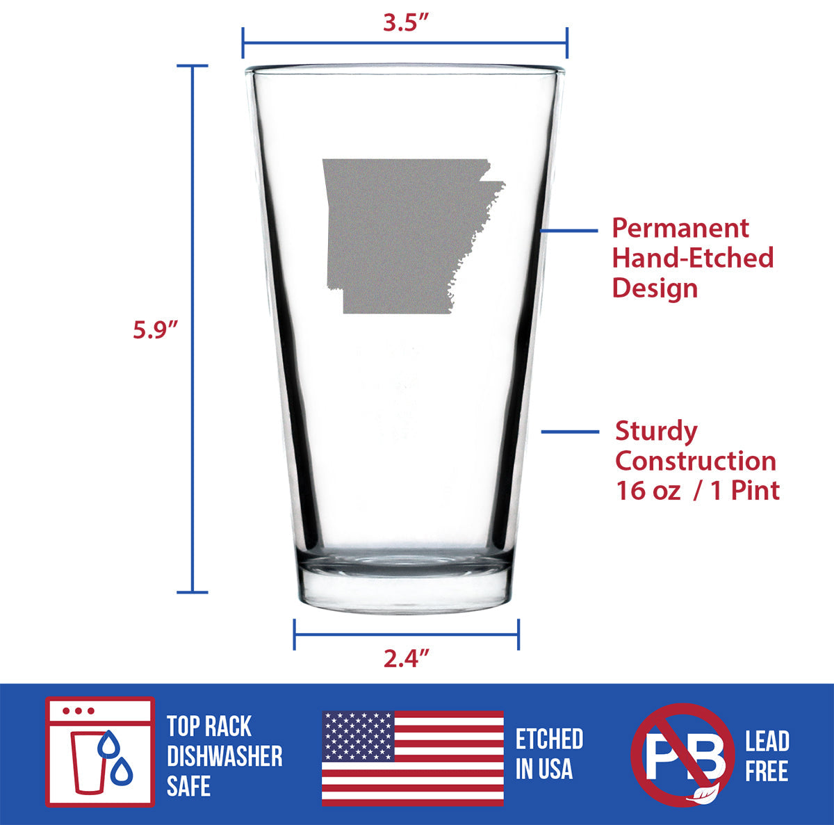 Arkansas State Outline Pint Glass for Beer - State Themed Drinking Decor and Gifts for Arkansans & Arkansawyer Women & Men - 16 Oz Glasses