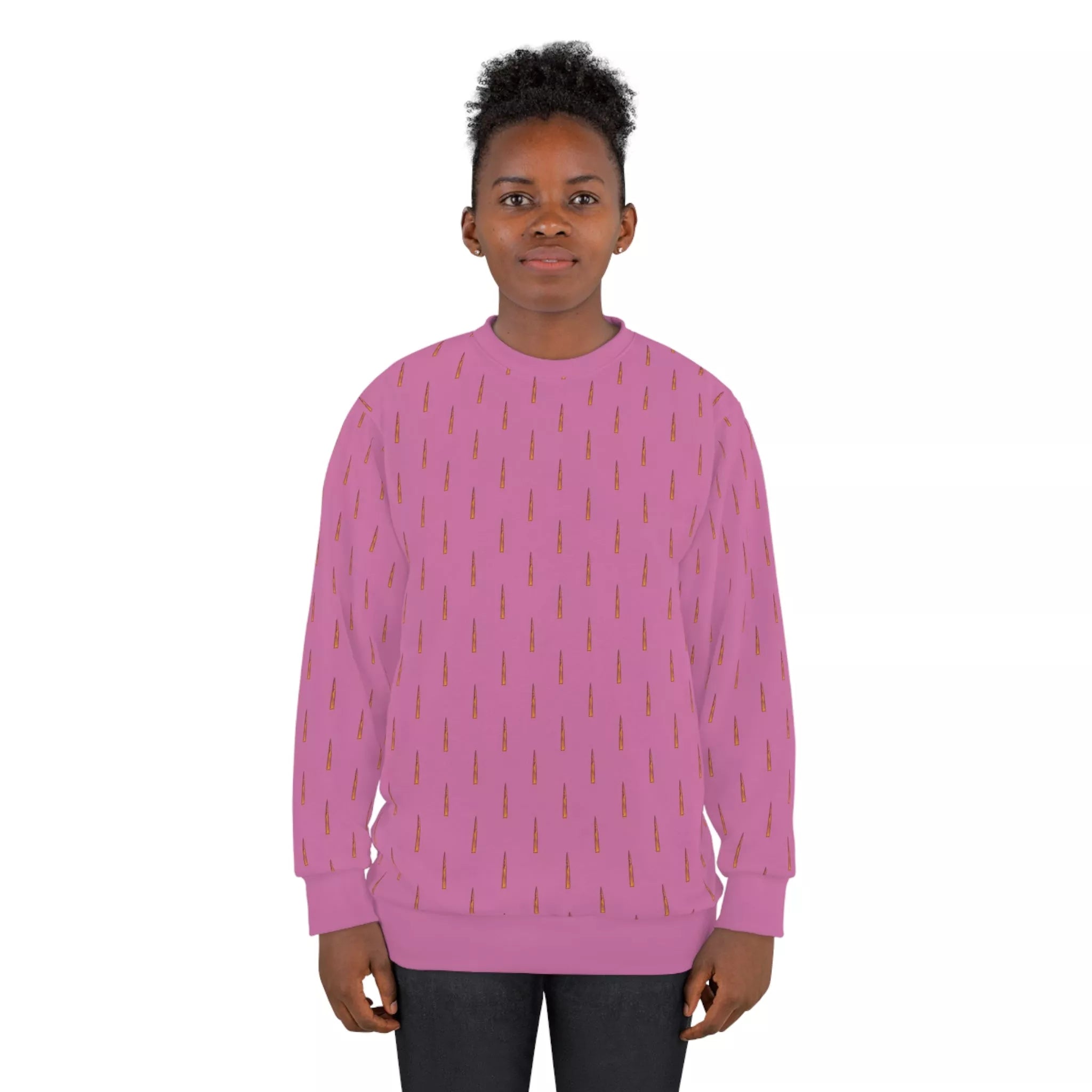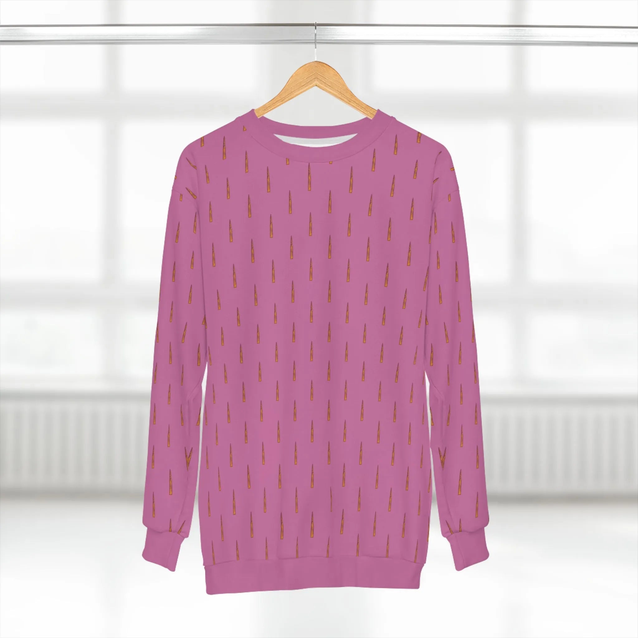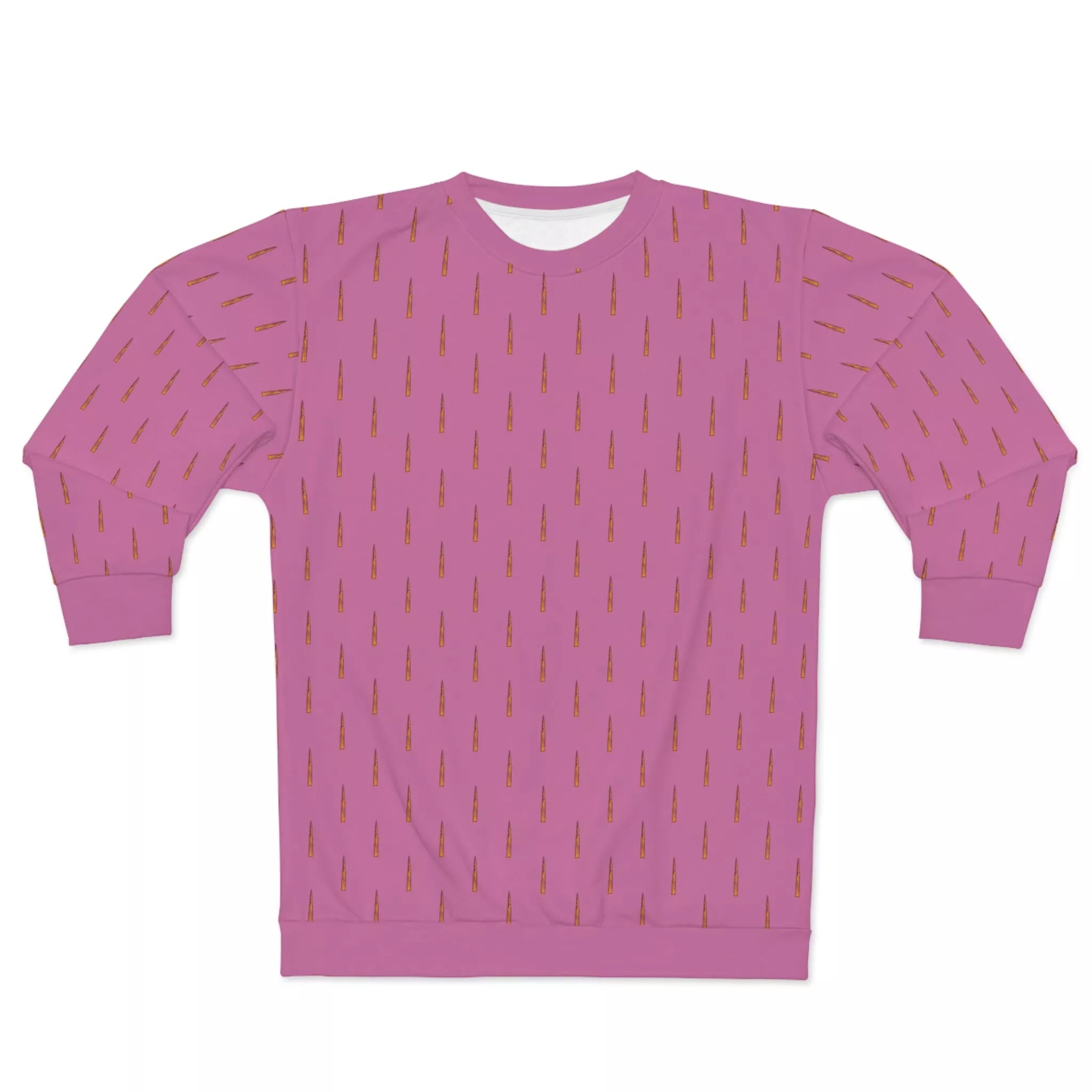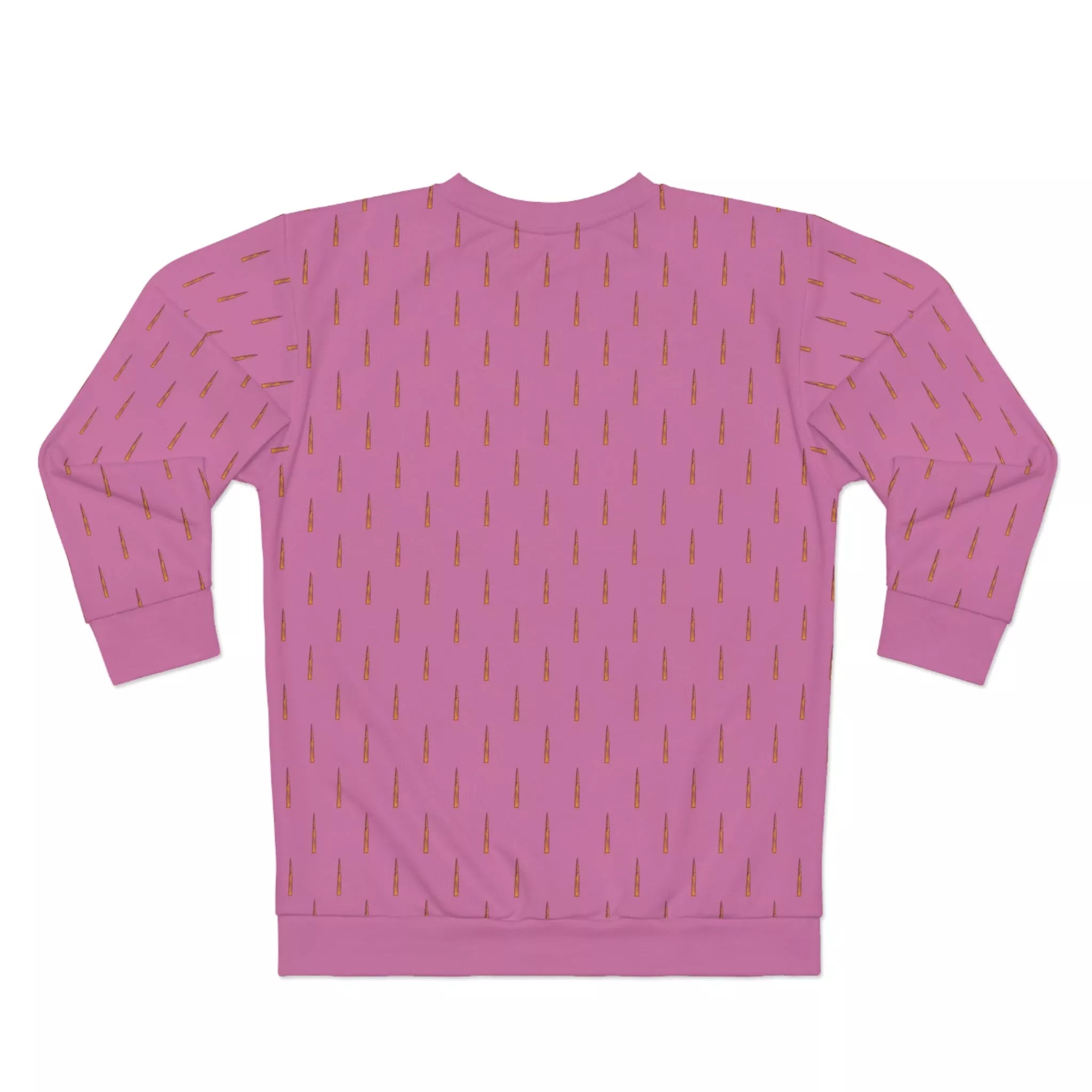 Why blend in when you can stand out? Our sweatshirt bursts onto the fashion scene with a light, rosy hue that says, "I'm delicate but dangerous." Adorned with a whimsical pattern of tiny bullets, this pullover is a wink and a nod to your unapologetically libertarian leanings. It's like sprinkling the Second Amendment on a cloud of cotton candy!