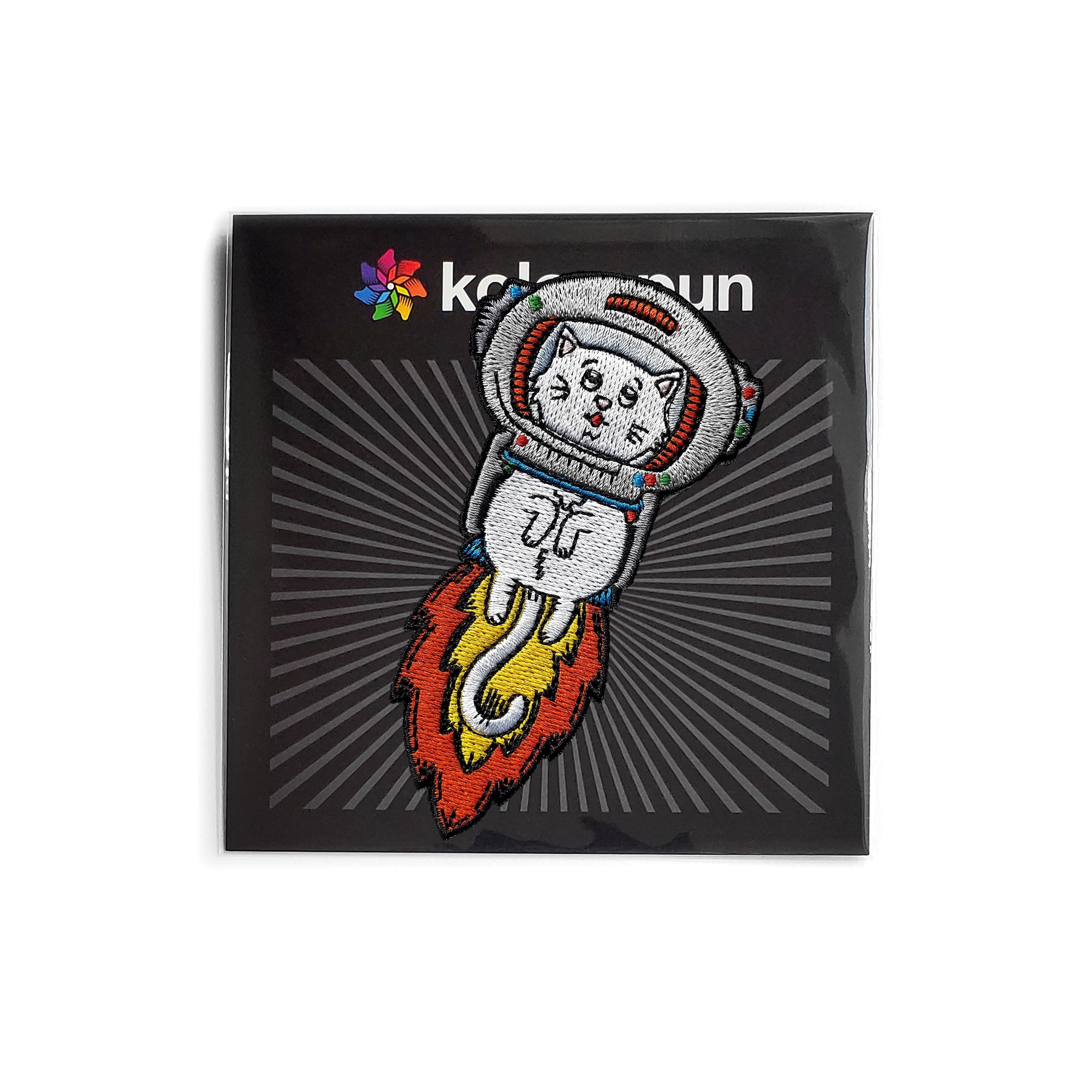 This embroidered patch features a cat dressed as an astronaut flying into outer space.