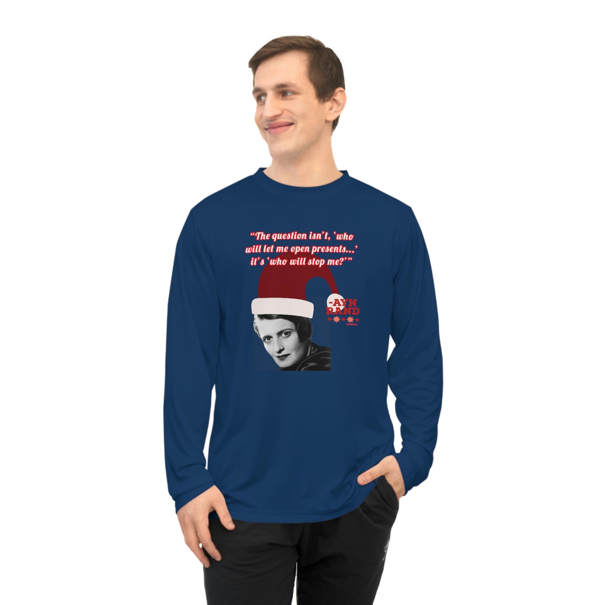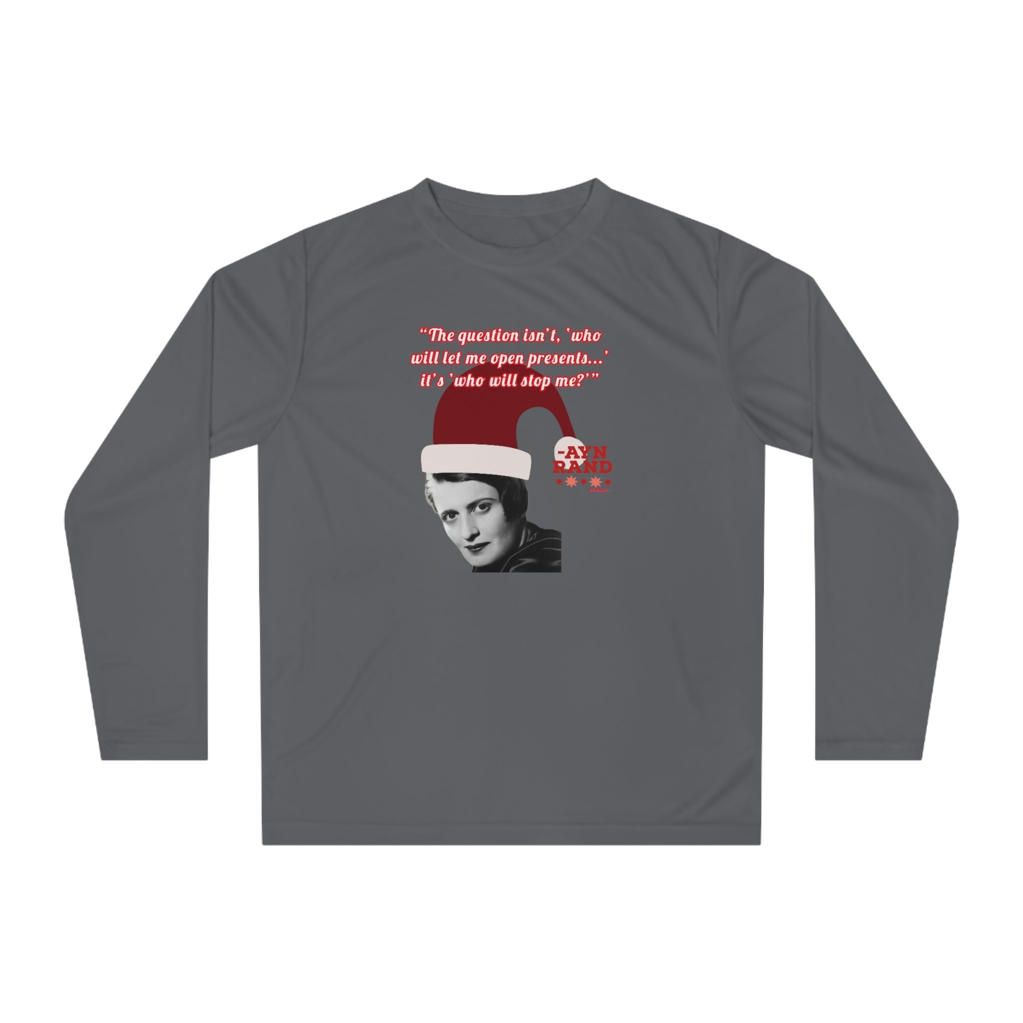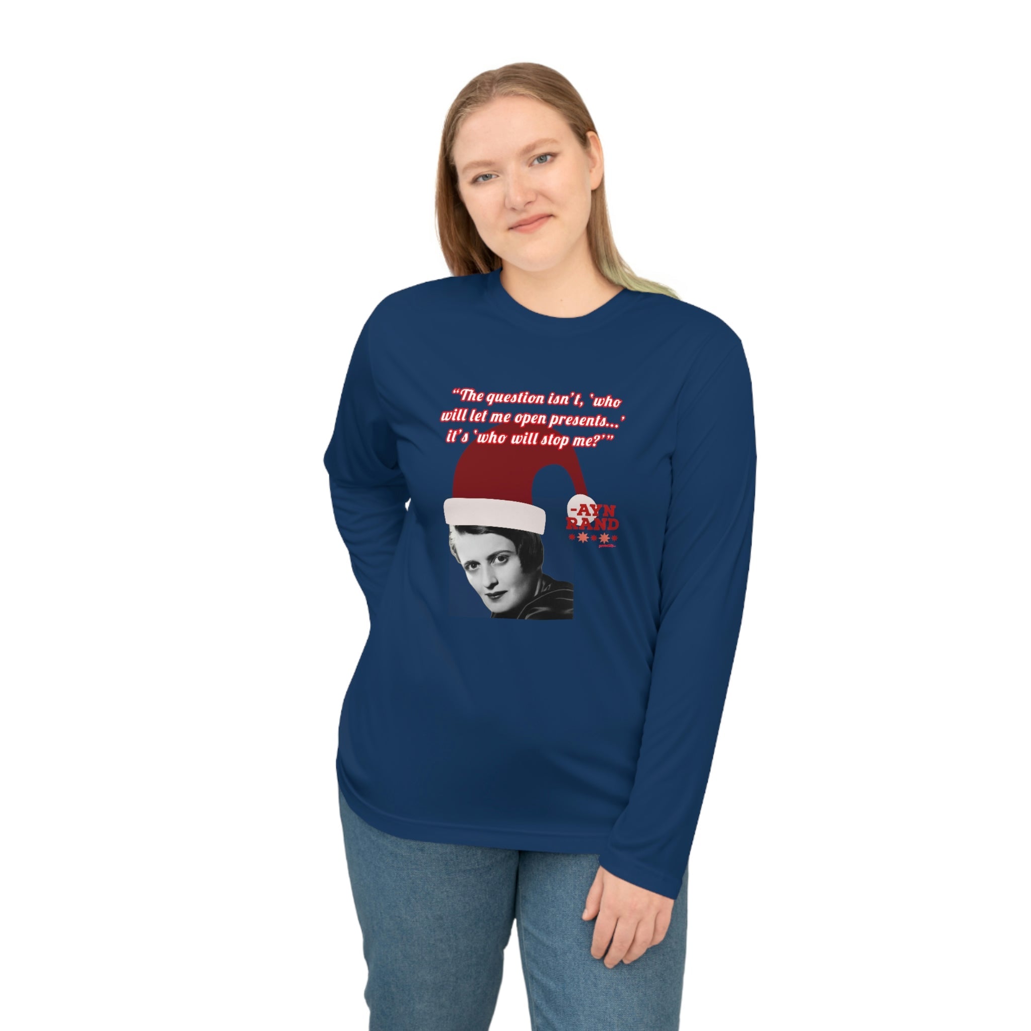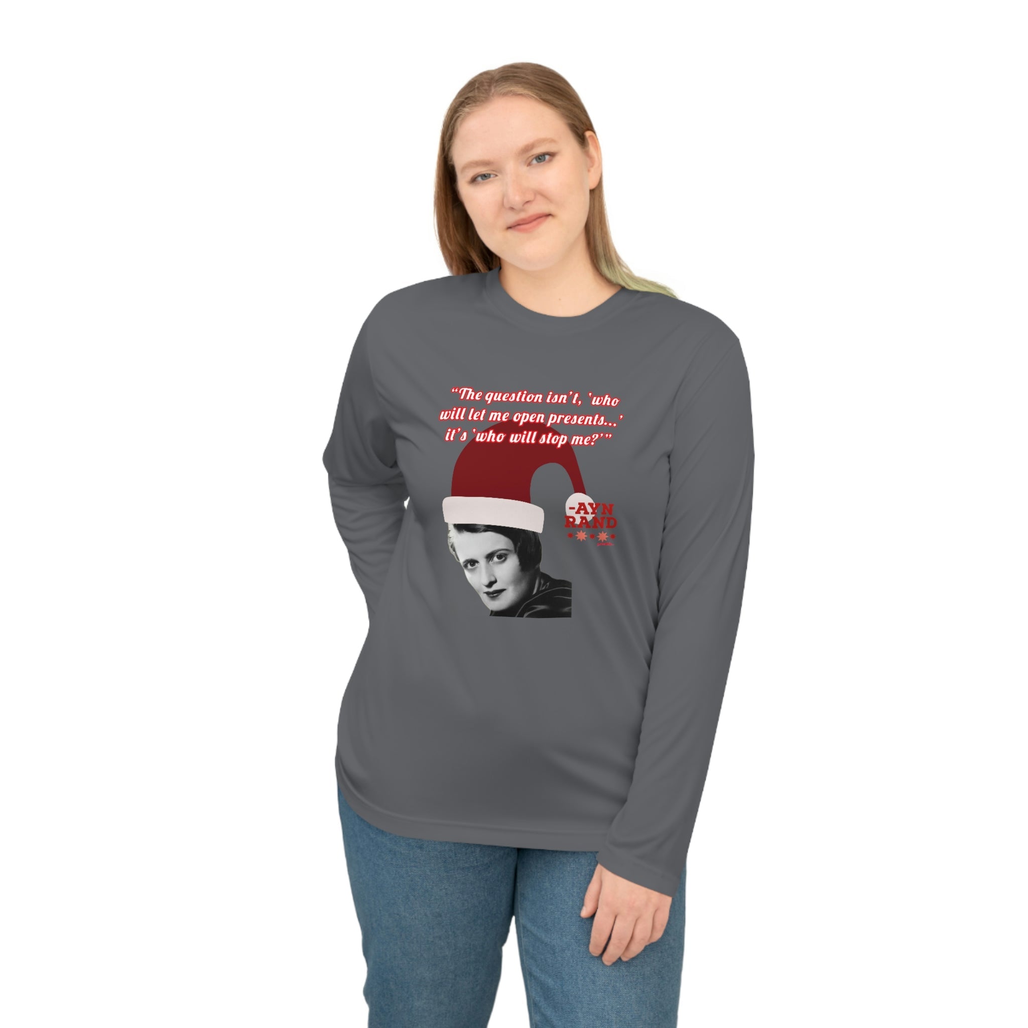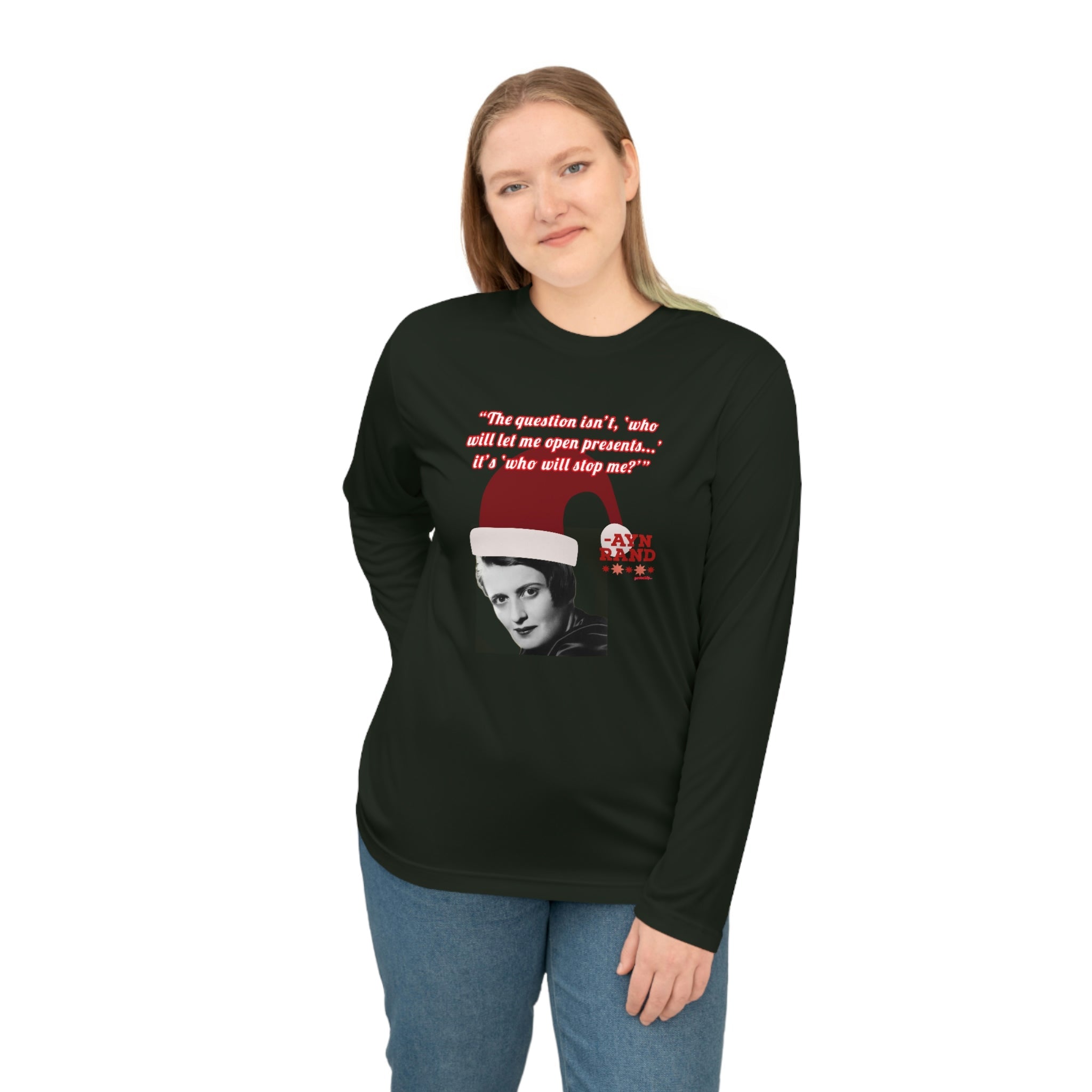 Whether you're attending a holiday party, hitting the gym, or just spreading libertarian philosophy during the festive season, this lightweight long-sleeve shirt combines comfort with clever political humor. Perfect for Ayn Rand fans, objectivists, and anyone who believes in rational self-interest.