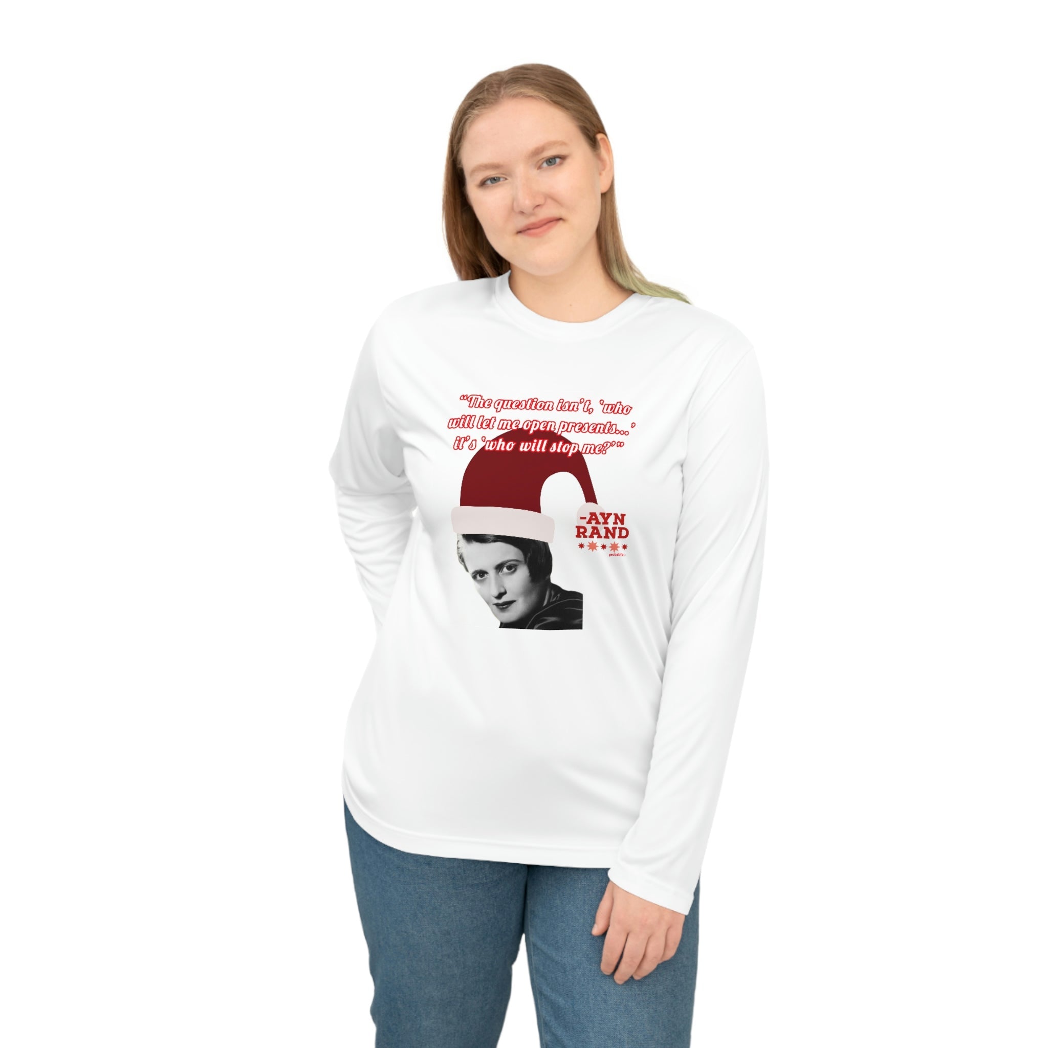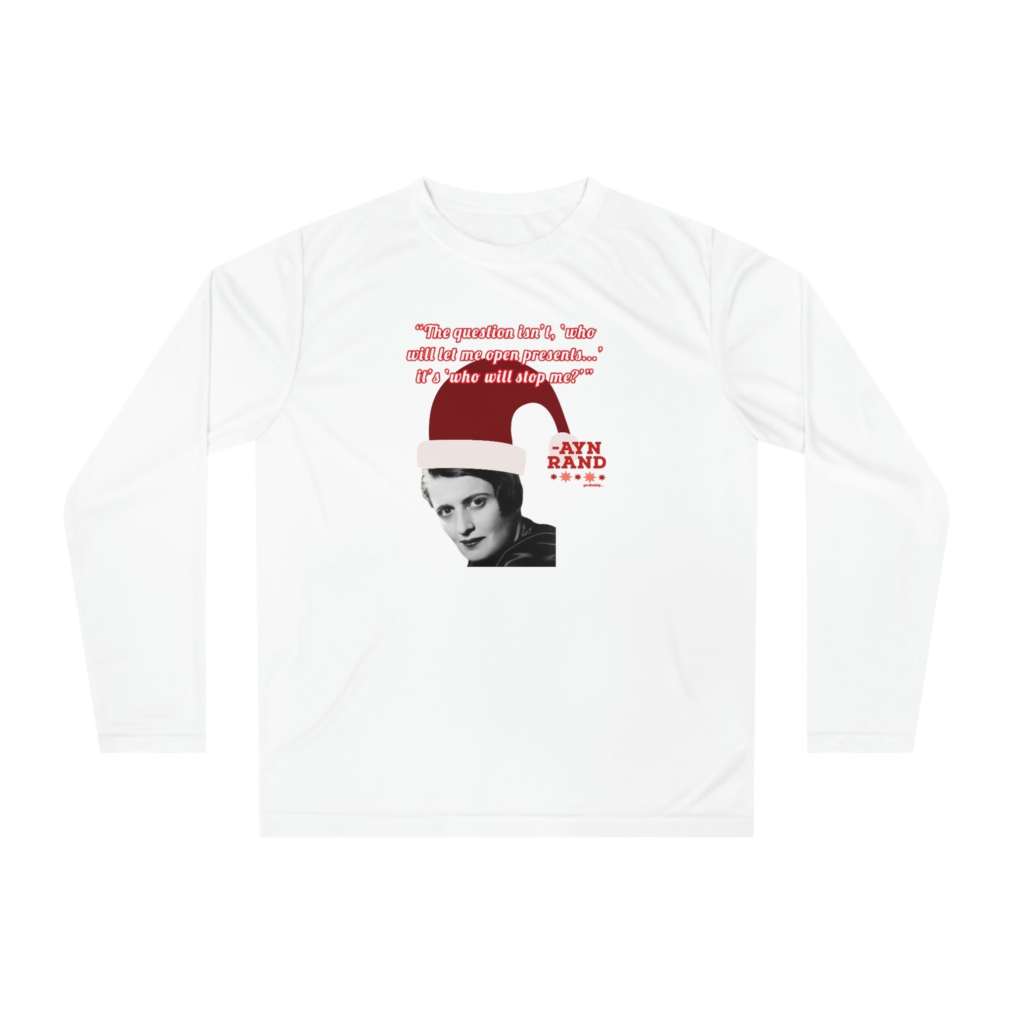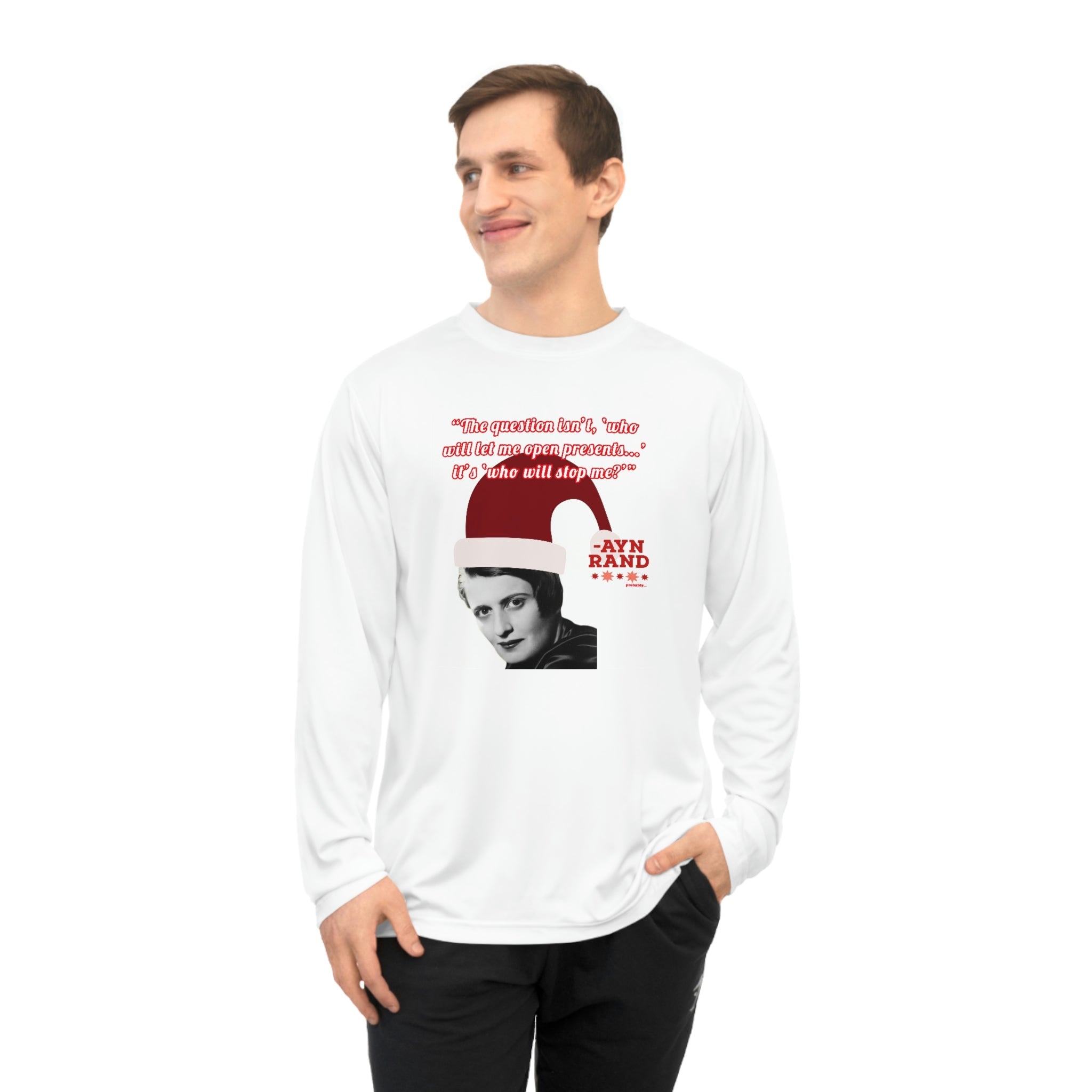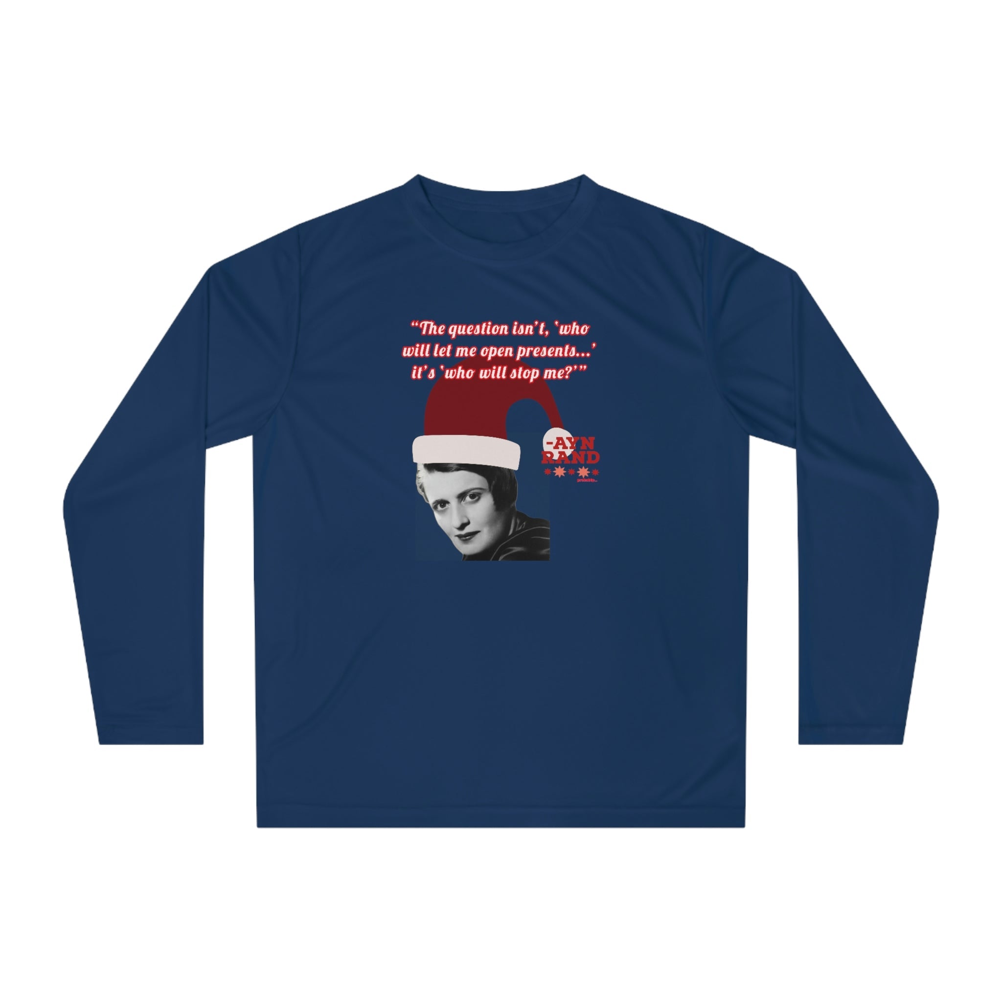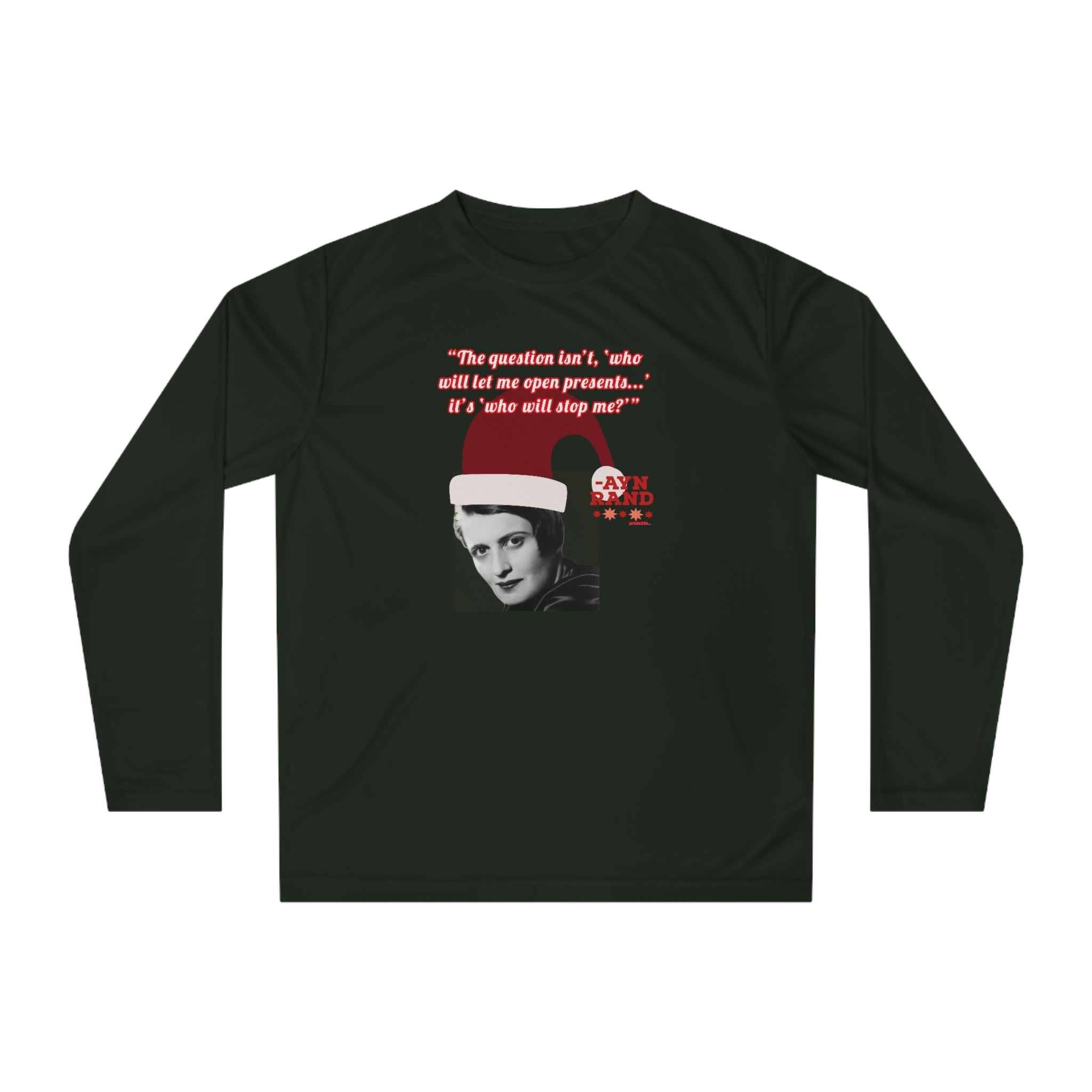 Whether you're attending a holiday party, hitting the gym, or just spreading libertarian philosophy during the festive season, this lightweight long-sleeve shirt combines comfort with clever political humor. Perfect for Ayn Rand fans, objectivists, and anyone who believes in rational self-interest.