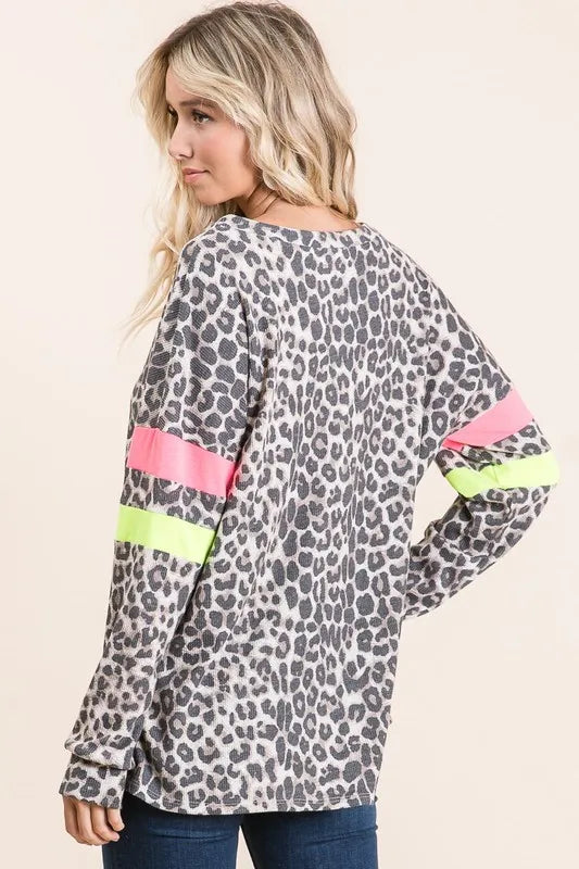 BiBi Leopard Thermal Top with Contrast Color Block ‐ N.PINK/N.GREEN / L