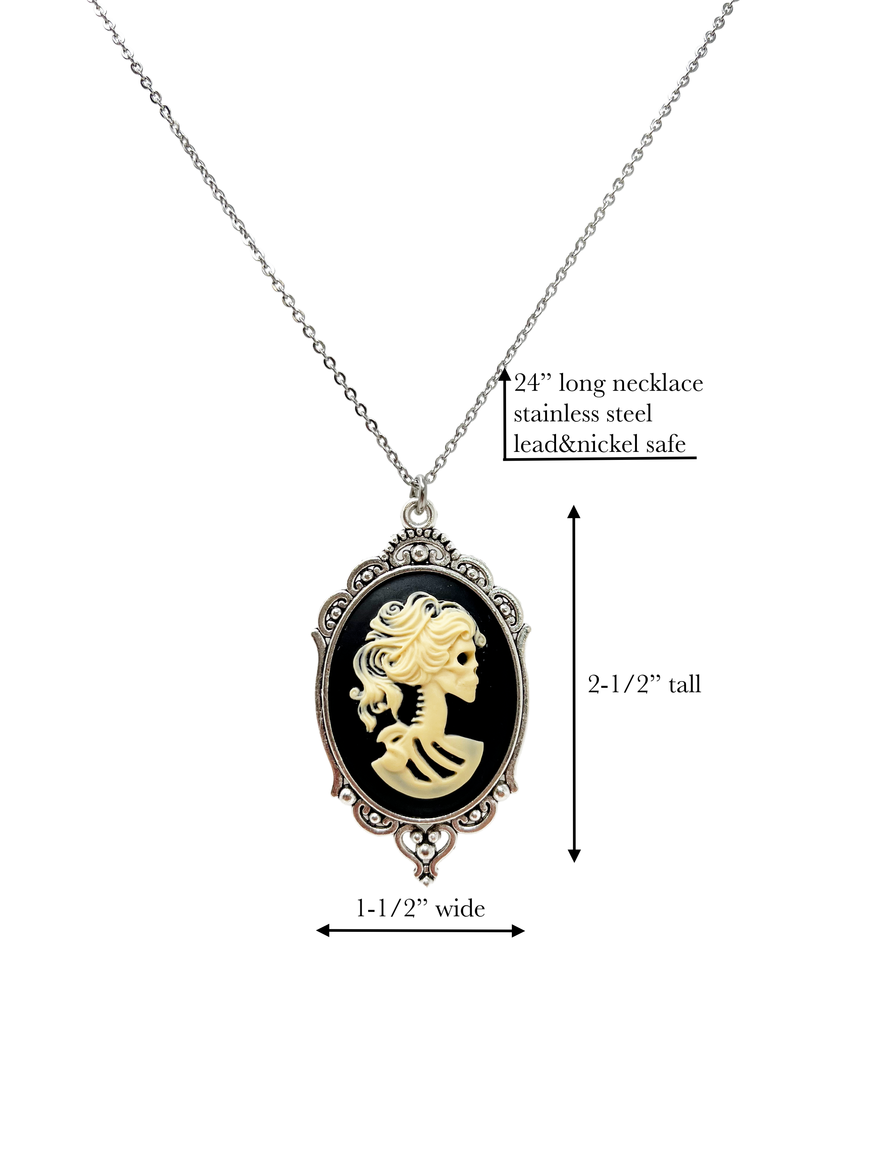- antique silver, goth style pendant setting is about 2" x 1-1/2" ivory lady skeleton over black cabochon