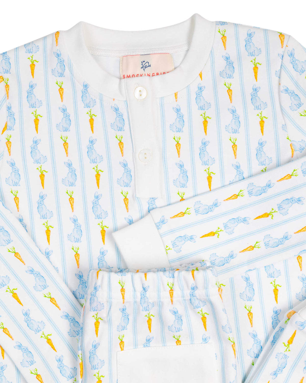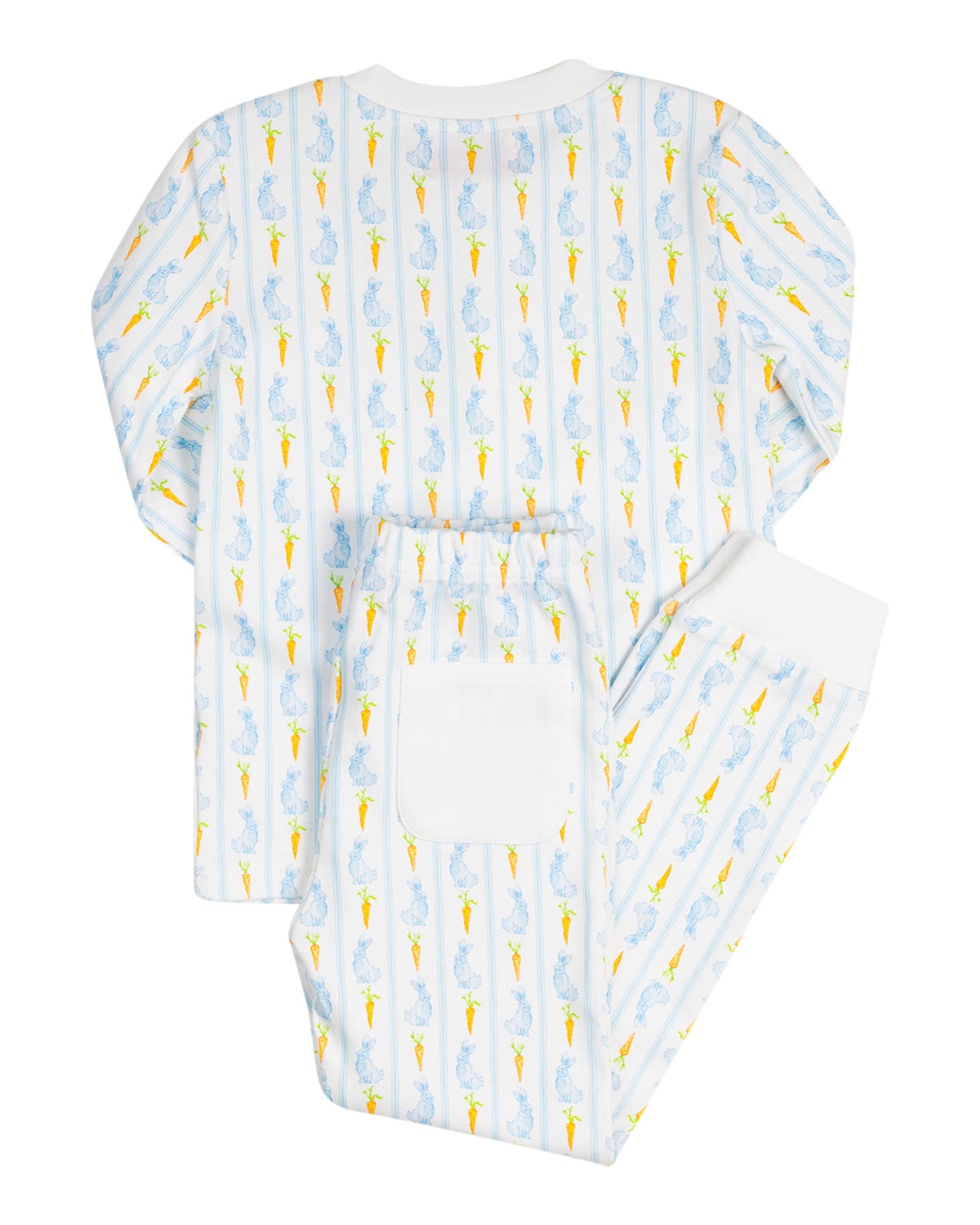 Hop into comfort with our Blue Bunny Knit Pajamas! Perfect for Easter and beyond, these cozy kids’ pajamas feature an adorable blue bunny design that your little ones will love. Crafted from soft, breathable knit fabric, these pajamas ensure a restful night’s sleep, making them a must-have for Easter celebrations, cozy spring nights, or everyday comfort. Let your child experience the joy of snuggling up in these playful pajamas! Add a monogram or name to the back pocket for a personal touch.