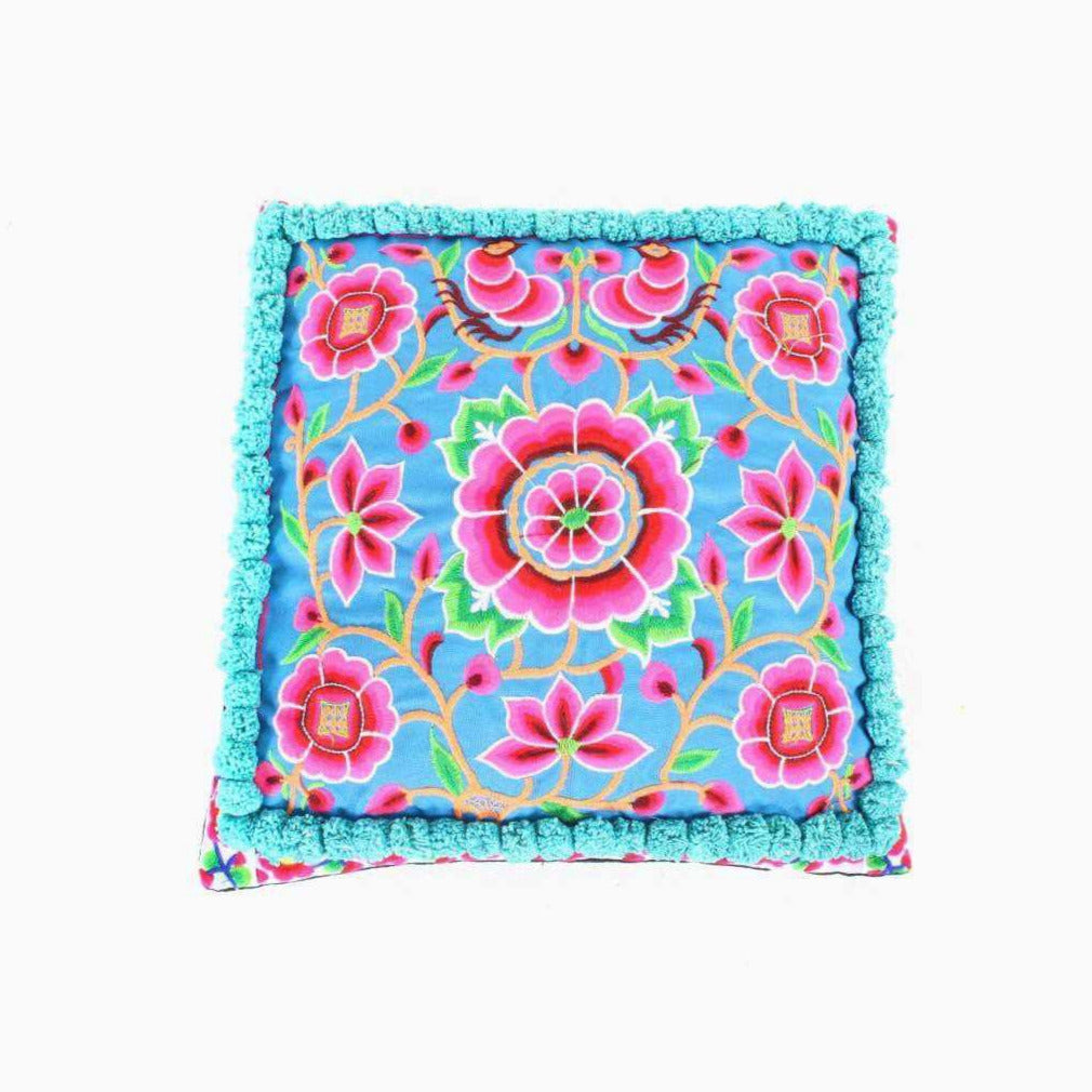 Blue Lagoon Floral Embroidered Pom Pom Cushion Cover - Thailand