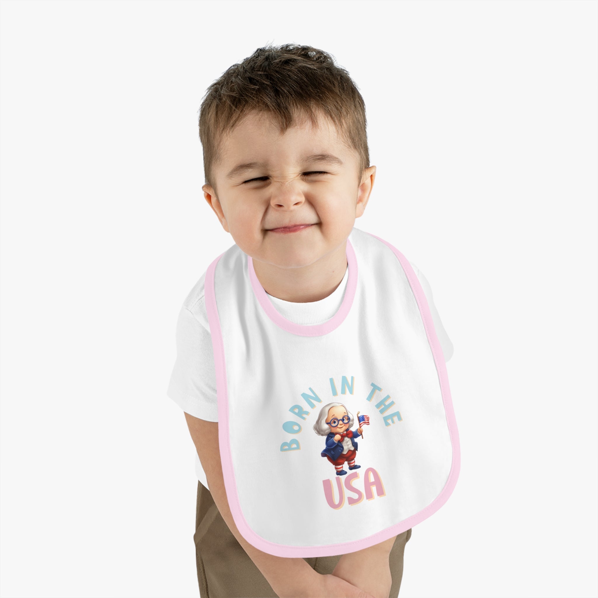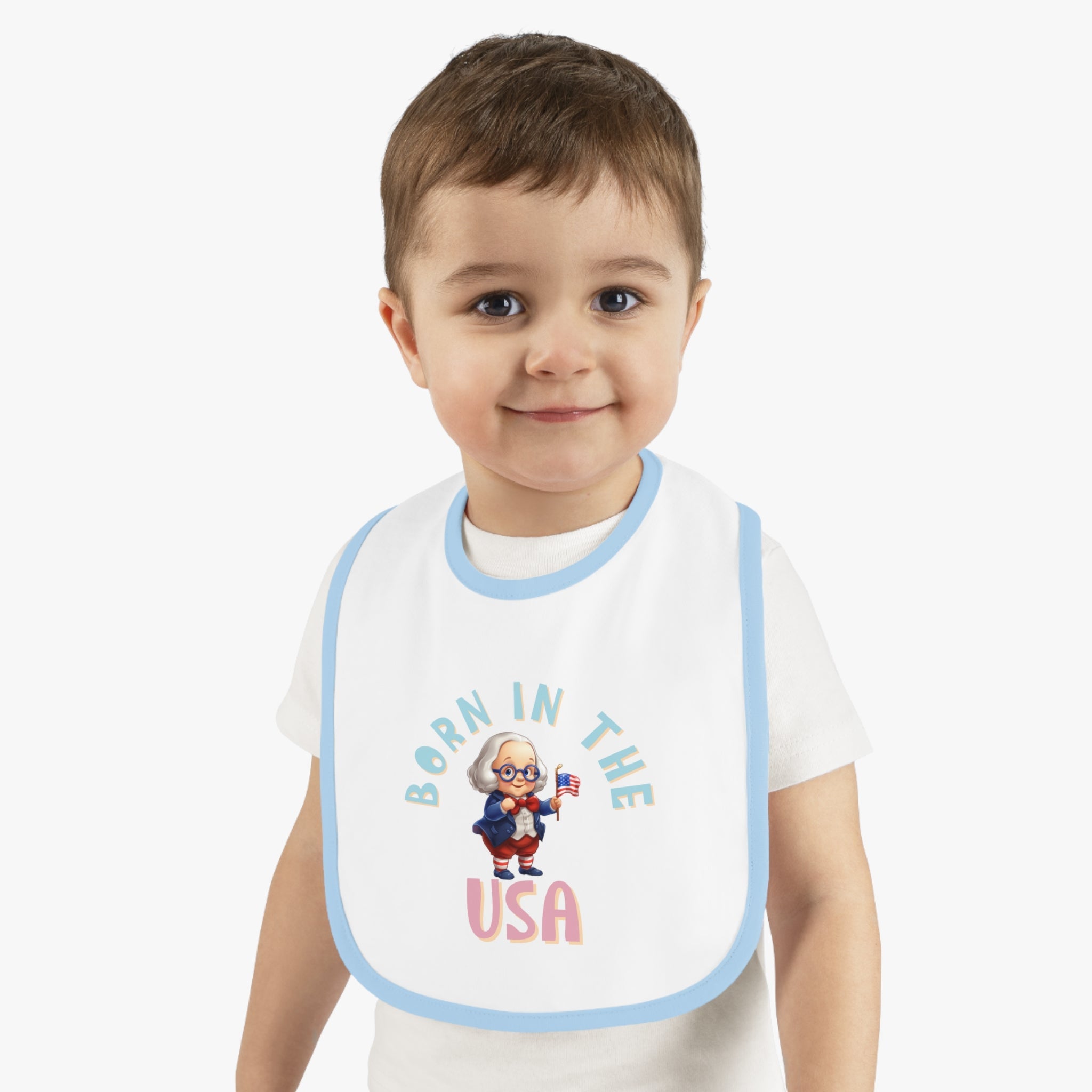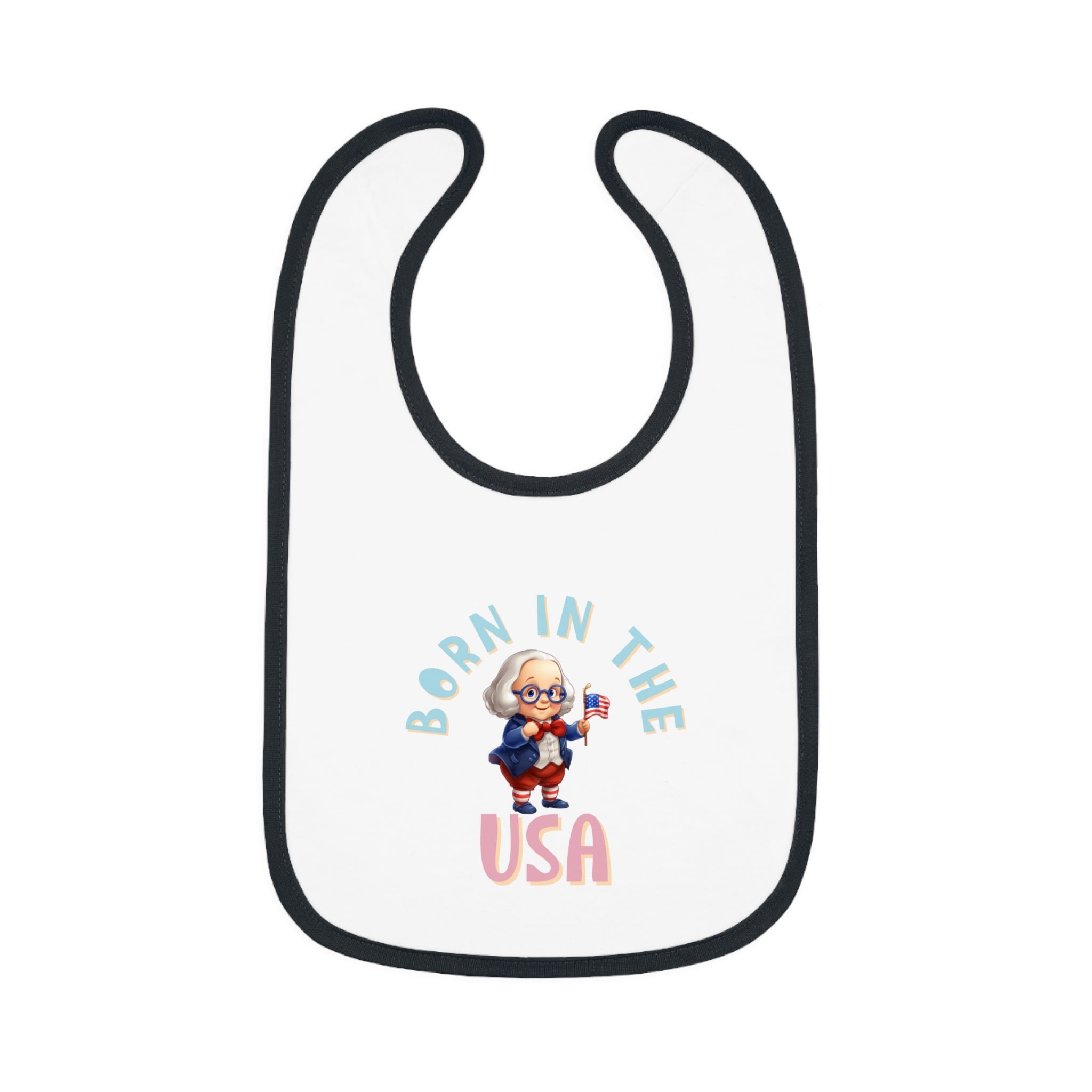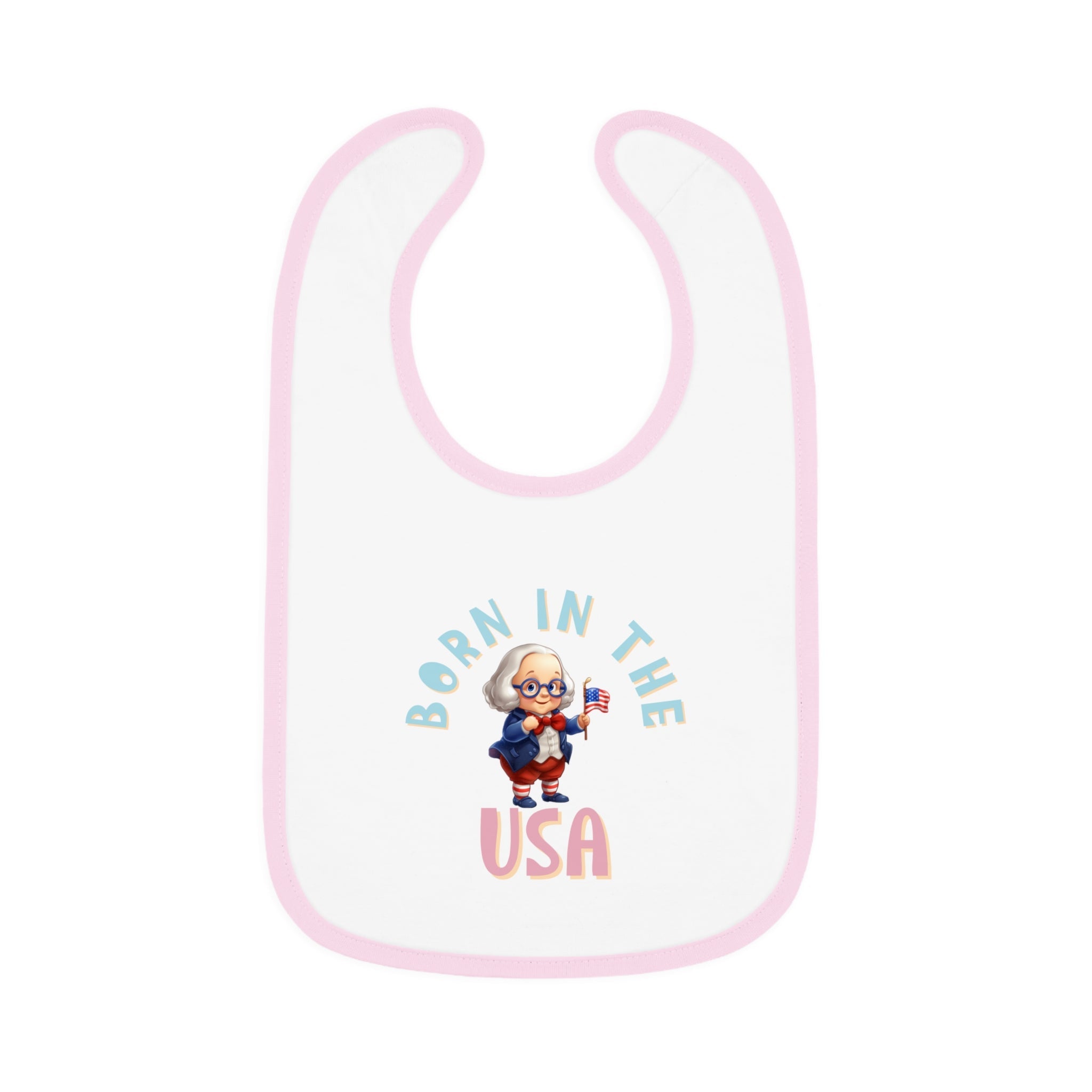 Introducing our "Born in the USA" Baby Bib featuring Benjamin Franklin! This patriotic bib combines cuteness with American pride. Let your little one shine as they enjoy meals and display their patriotic spirit with this charming bib!