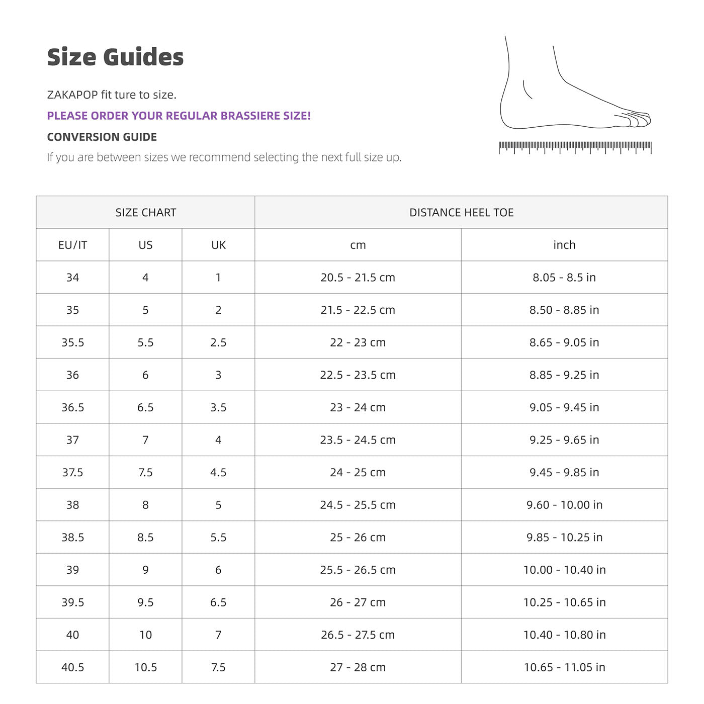 👠 For all styles, the following chart will help you decide which size to buy. Simply measure the length of your foot from heel to toe, with your heel flush against a wall.
