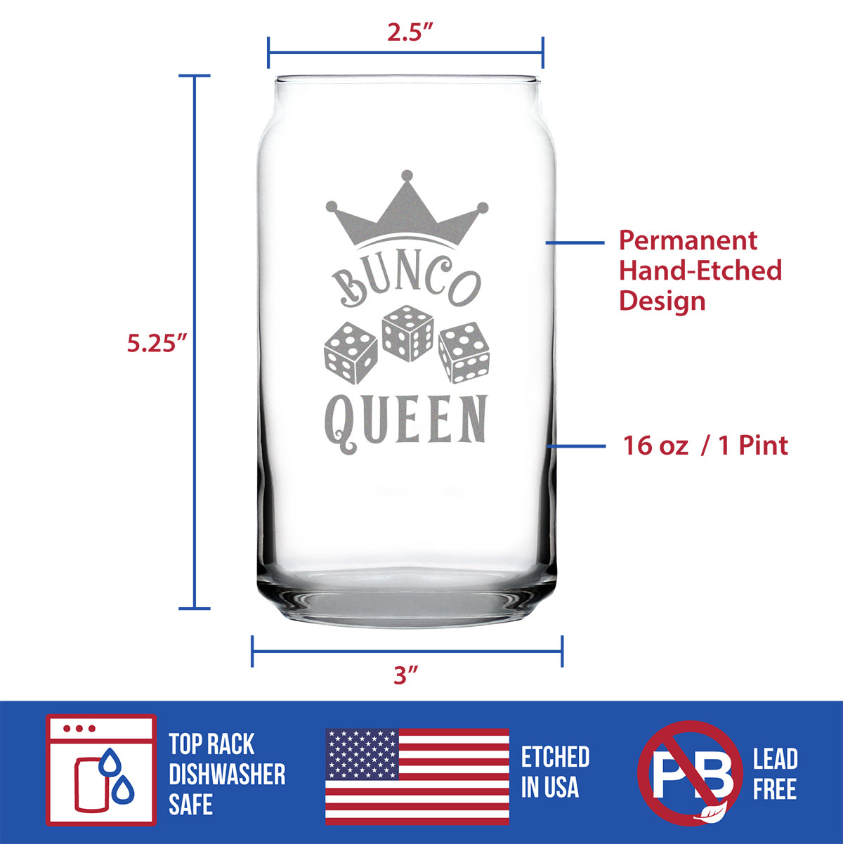 Bunco Queen Beer Can Pint Glass - Bunco Decor and Bunco Gifts for Women - 16 Oz Glasses