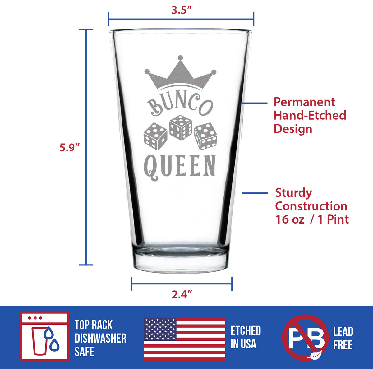 Bunco Queen Pint Glass for Beer - Bunco Decor and Bunco Gifts for Women - 16 Oz Glasses