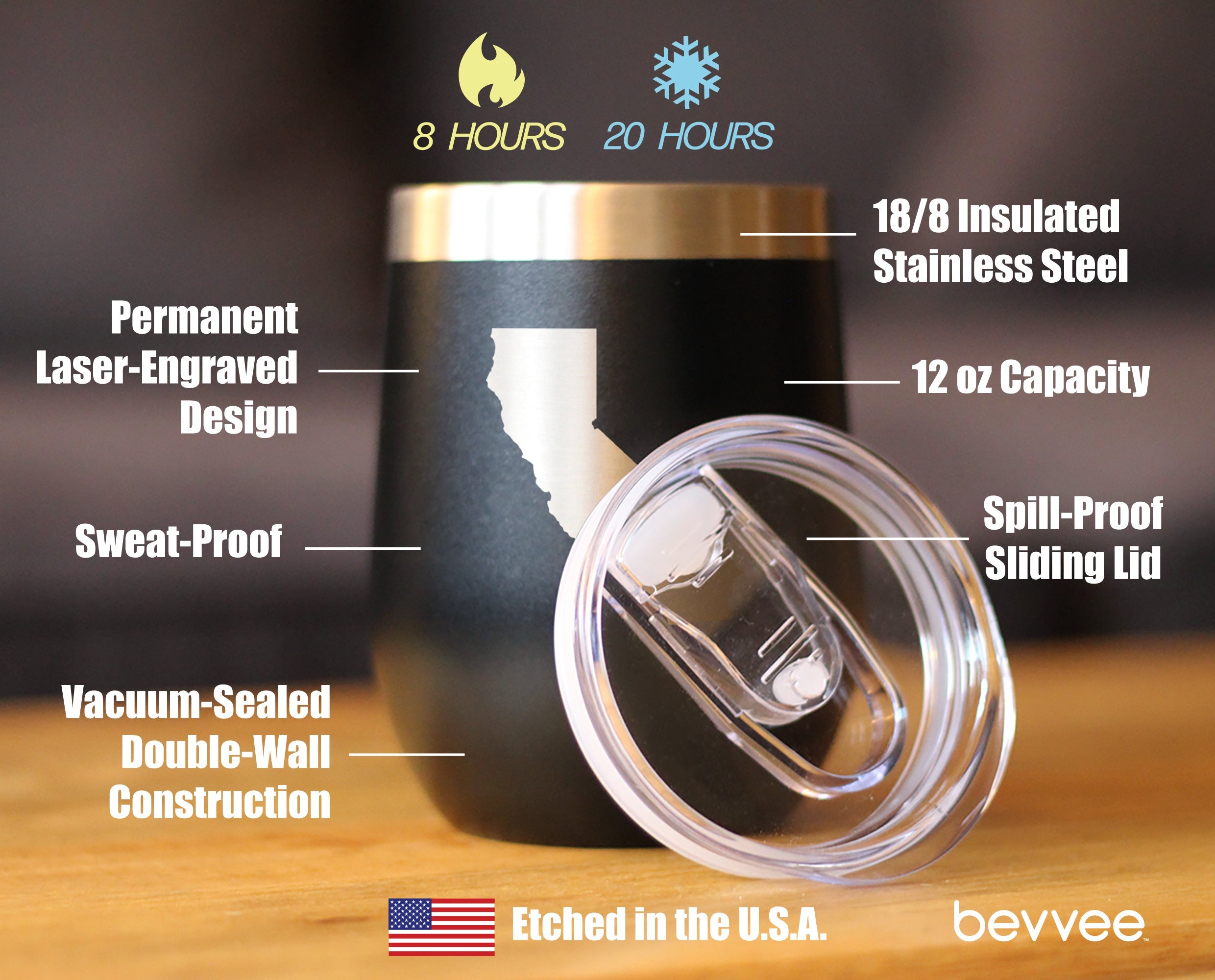 Our 12oz. stemless wine tumblers with sliding lids feature stainless steel double-wall construction, vacuum insulated for 2X cold and heat retention compared to glass or plastic containers! Etched in America.