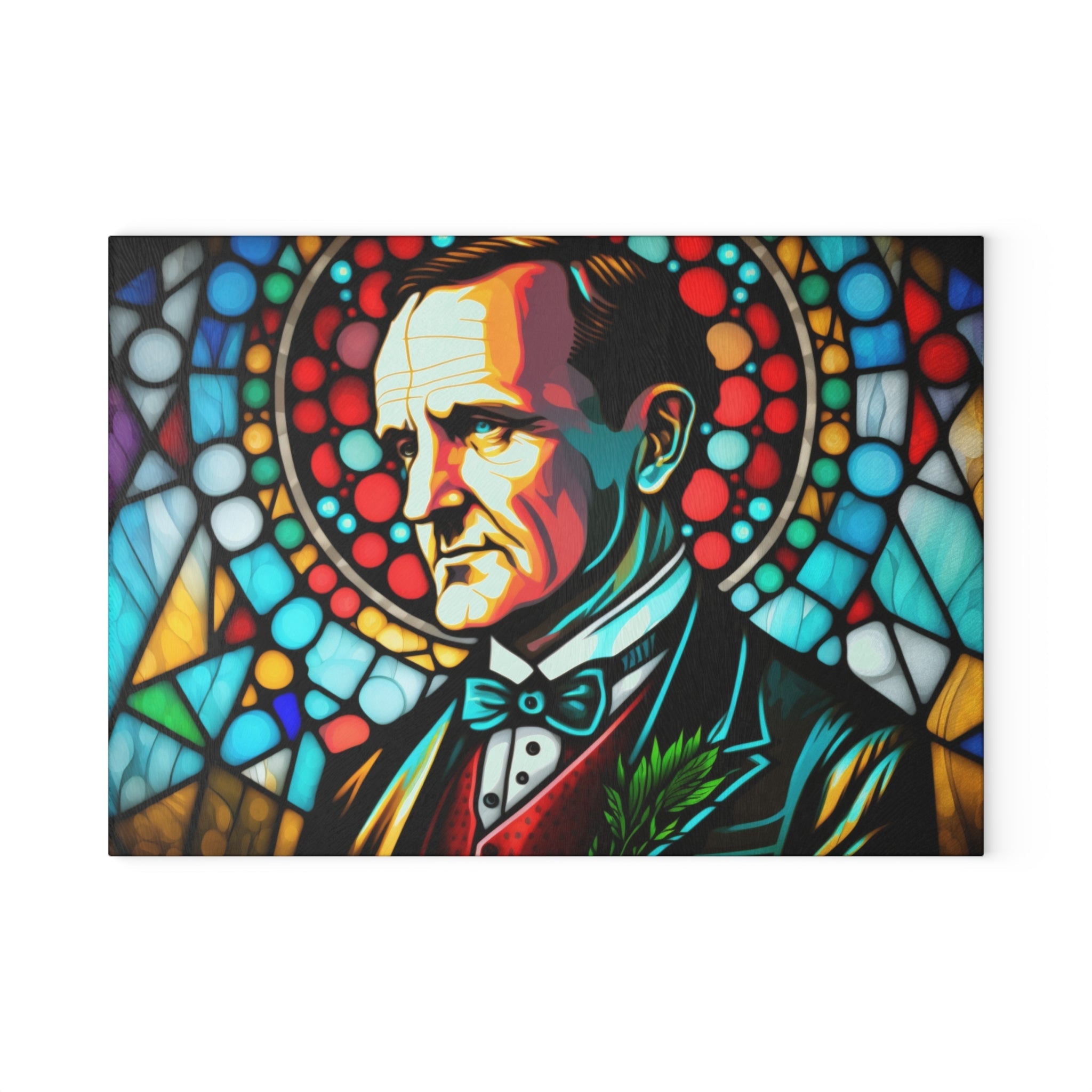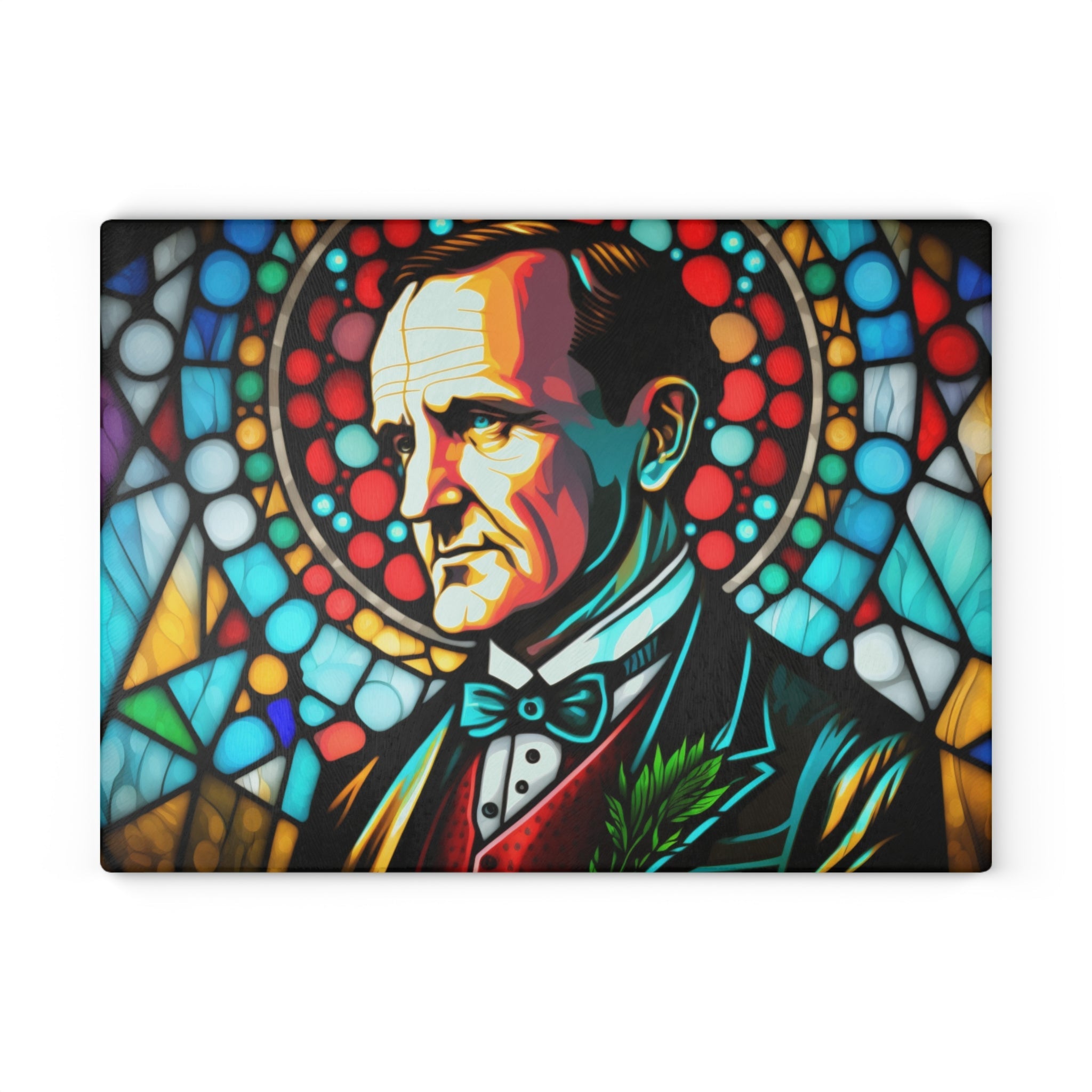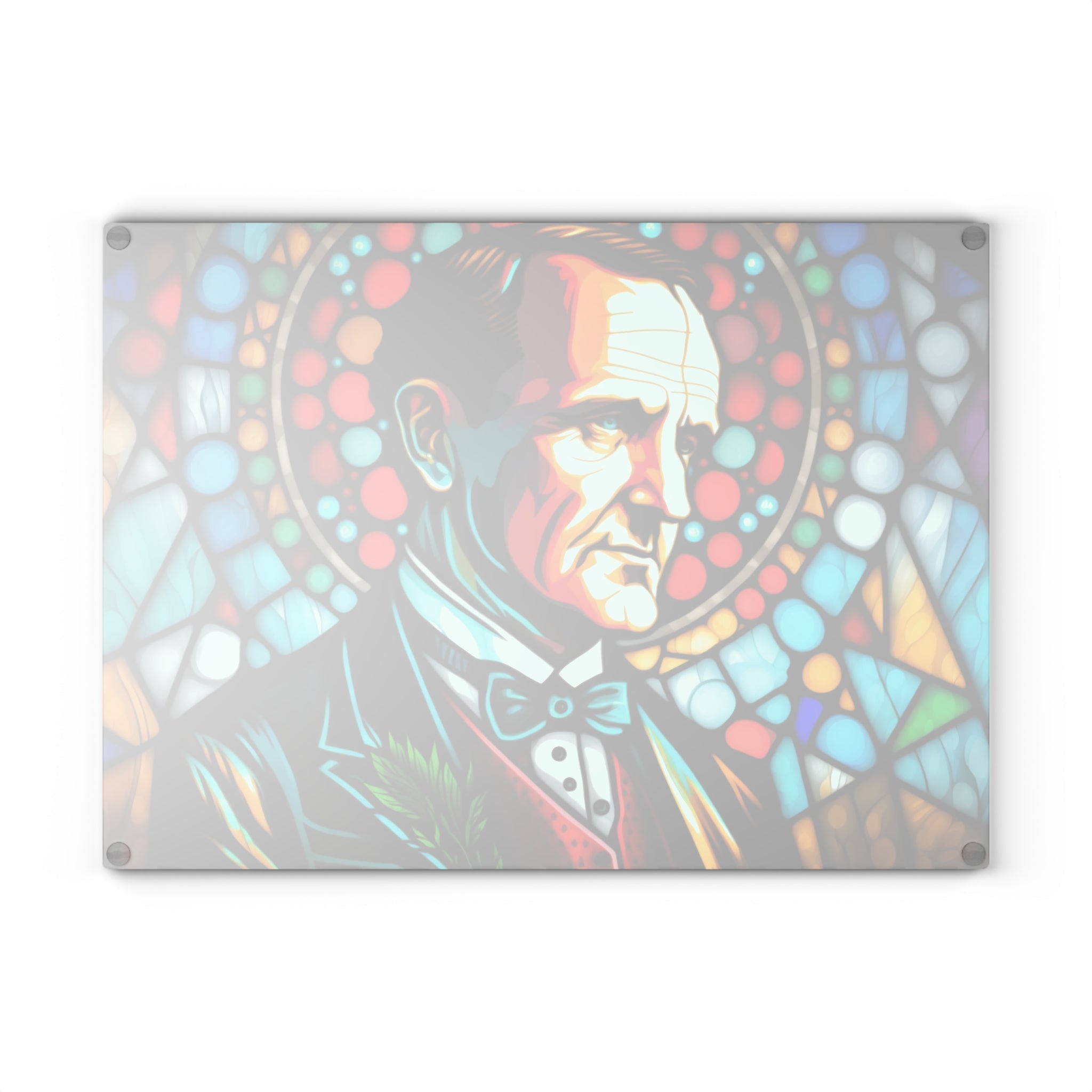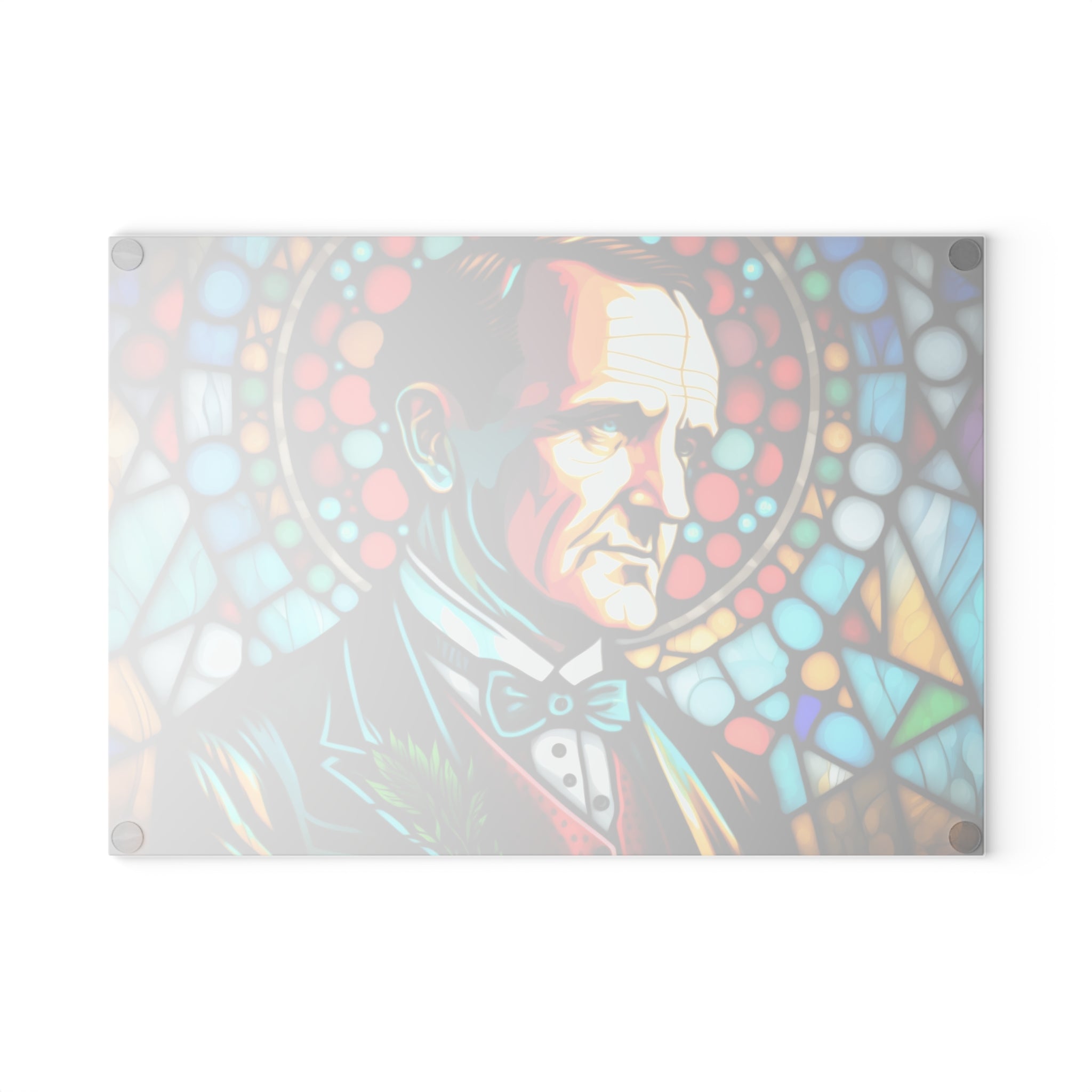 Discover an exquisite glass cutting board, elegantly adorned with a stained glass design featuring President Calvin Coolidge, affectionately known as "Silent Cal." This beautifully crafted piece merges historical reverence with artistic charm, making it a unique collector's item for conservatives, libertarians, and admirers of Coolidge's legacy of quiet dignity and fiscal responsibility.