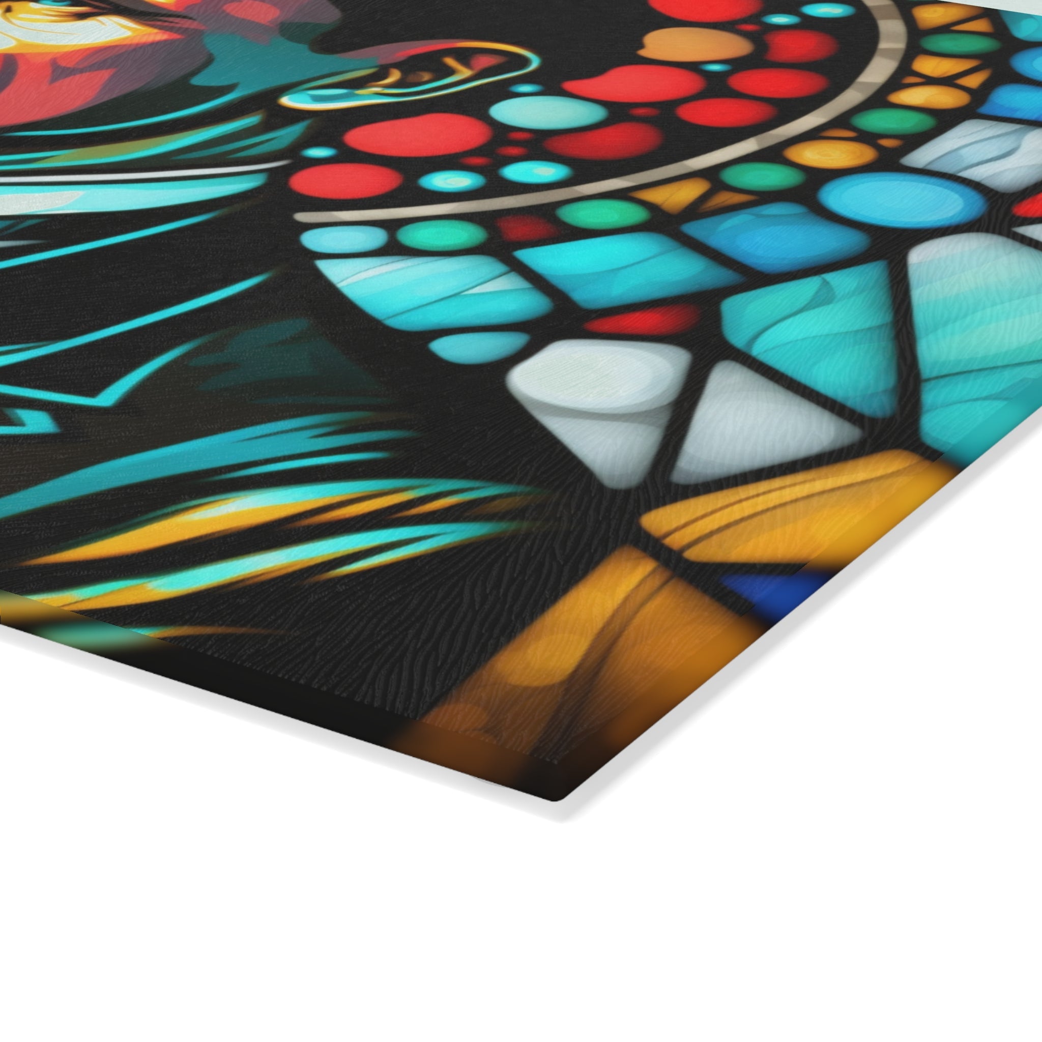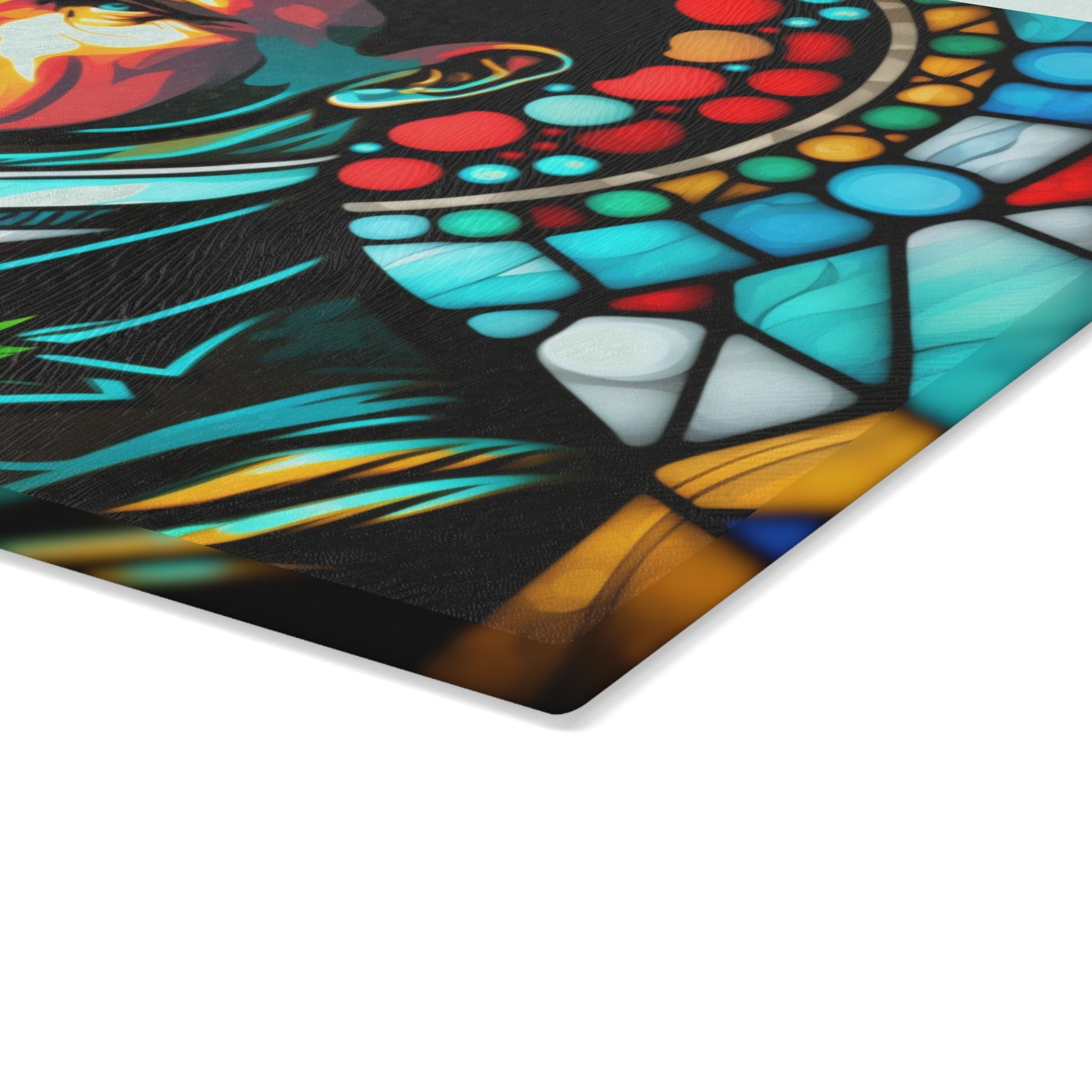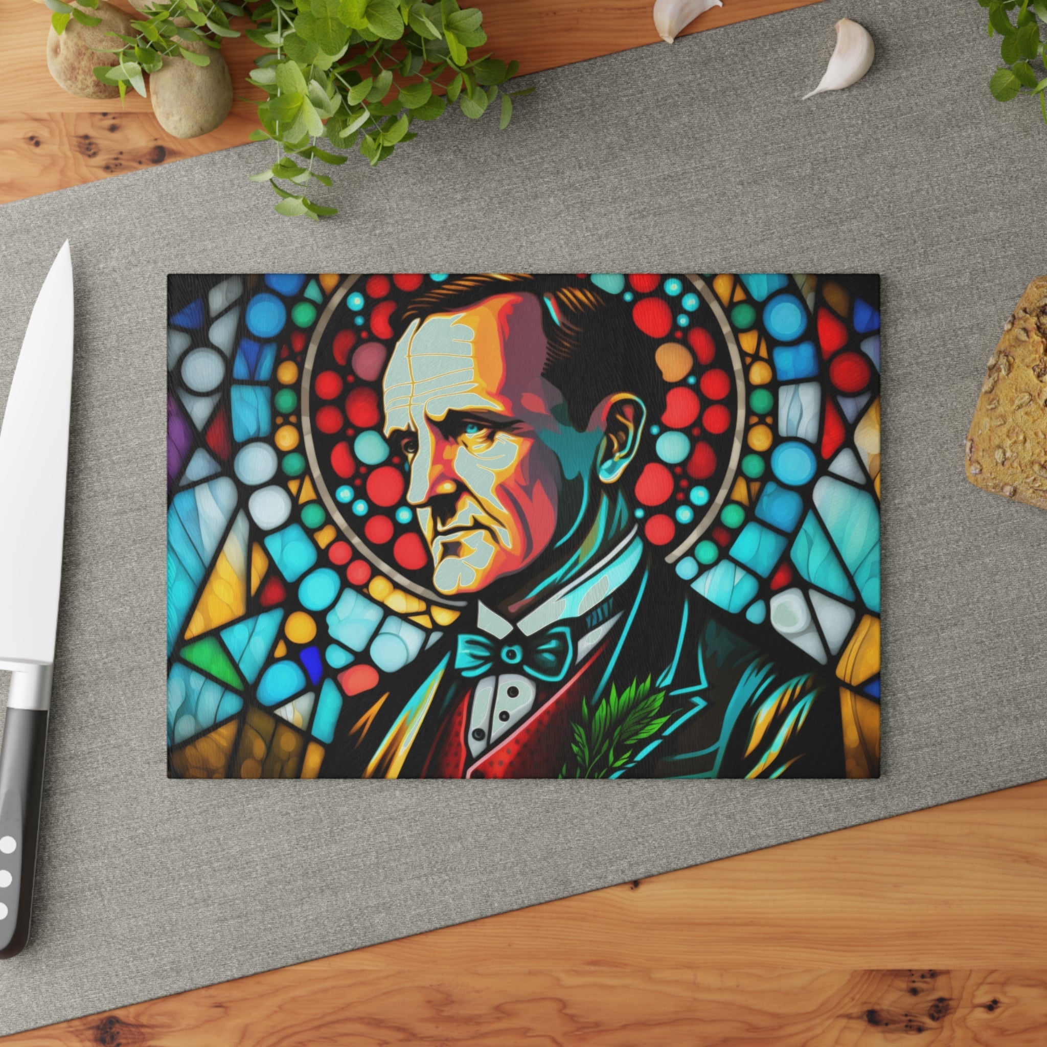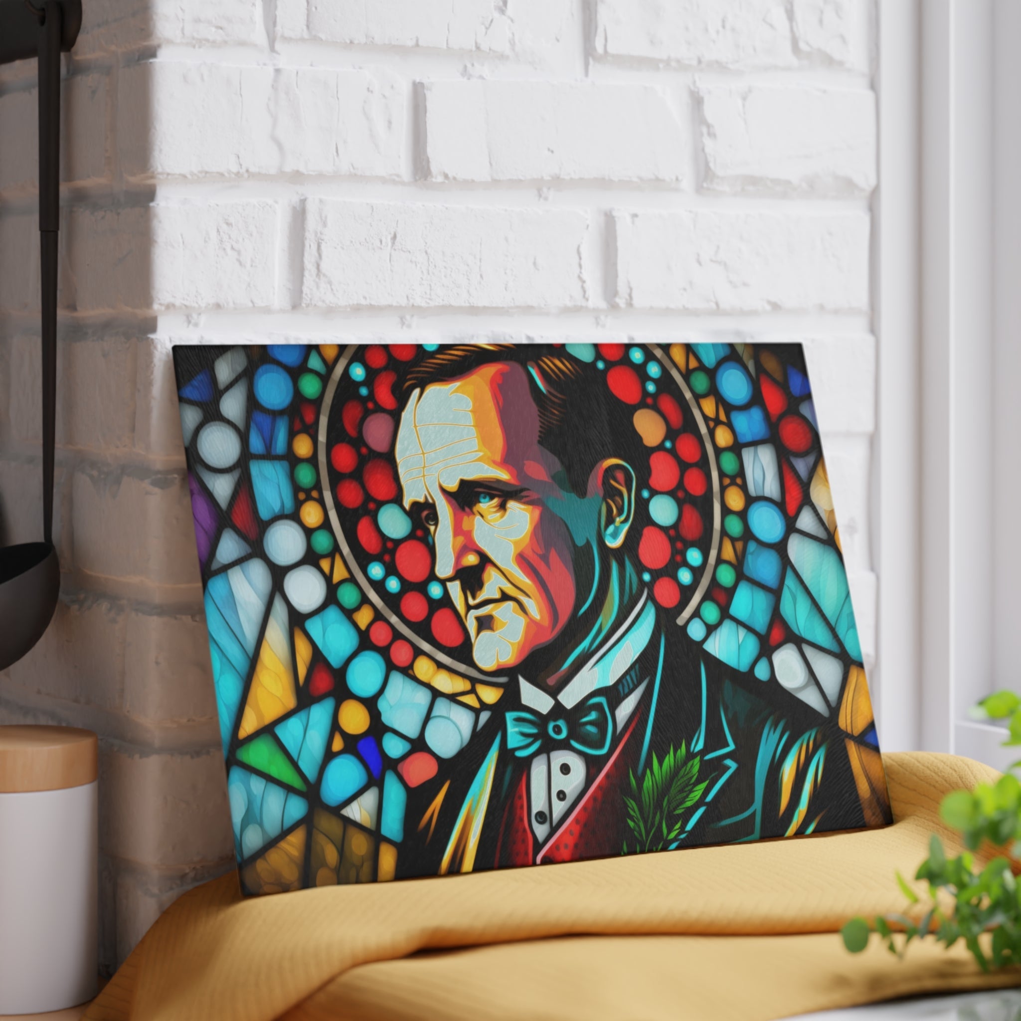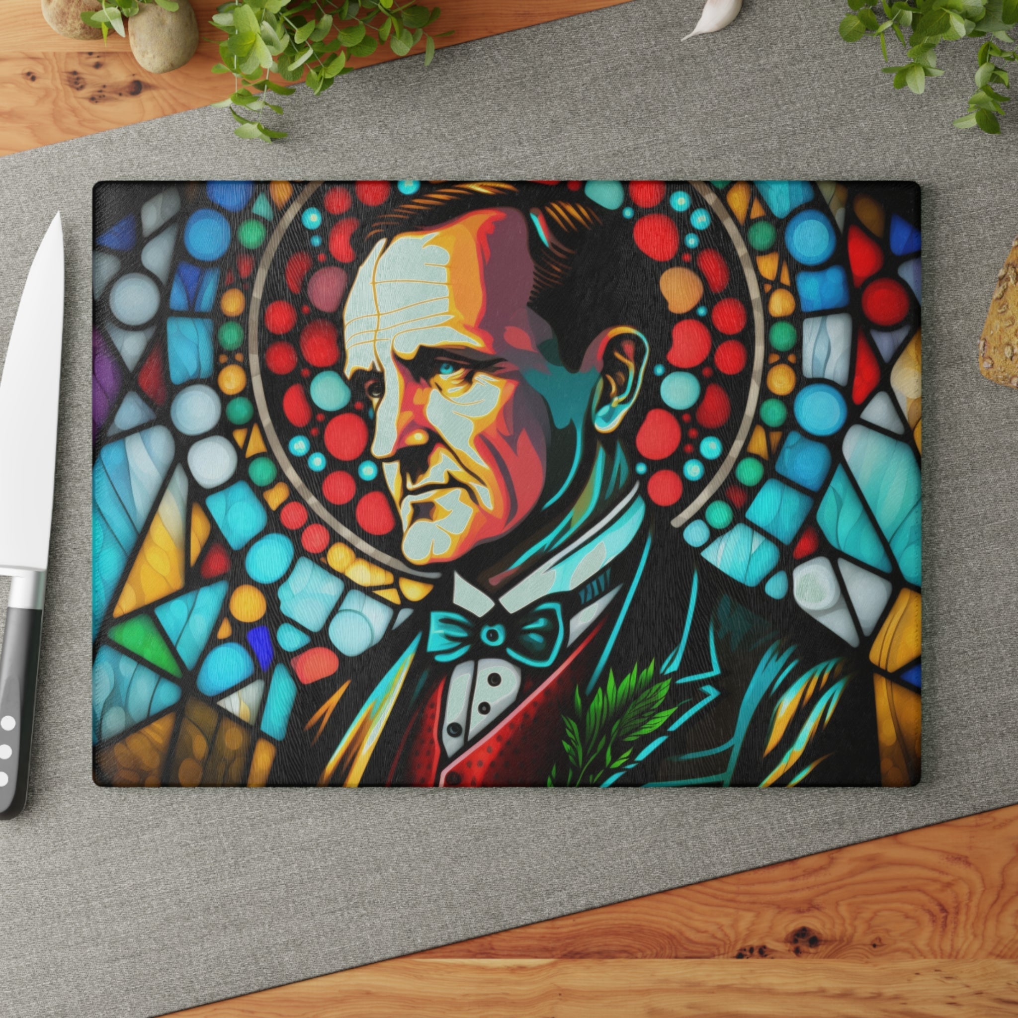 Discover an exquisite glass cutting board, elegantly adorned with a stained glass design featuring President Calvin Coolidge, affectionately known as "Silent Cal." This beautifully crafted piece merges historical reverence with artistic charm, making it a unique collector's item for conservatives, libertarians, and admirers of Coolidge's legacy of quiet dignity and fiscal responsibility.