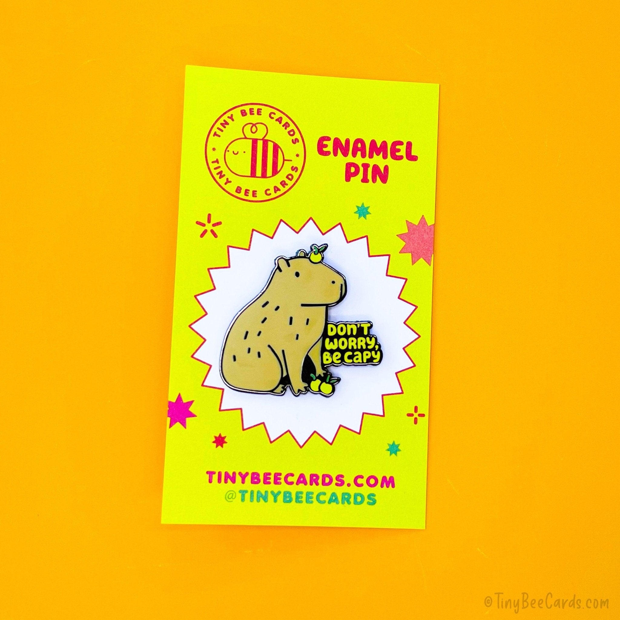 Don't worry, you can be capy too! Just relax and enjoy your surroundings, like this cute capybara, whether that includes a yuzu fruit on your head or not! This awesome enamel lapel pin makes a perfect stocking stuffer, gift, favor, and are so fun to collect and wear. Design features a cute hand illustrated capybara with some yuzu and funny pun text "Don't worry, be capy."