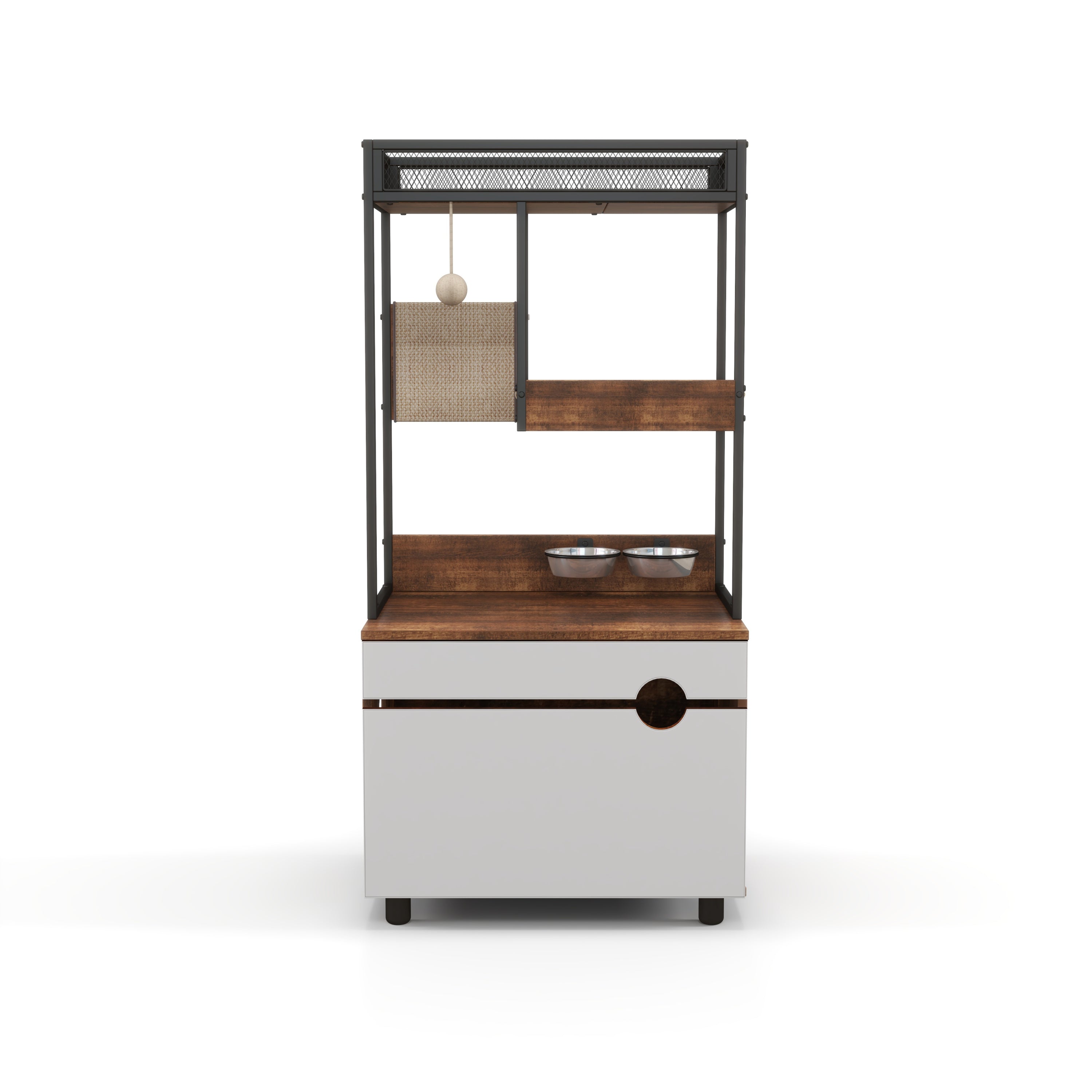 Made of P2 grade particle board and thickened metal frame. This cat tree is perfect to be a combination of a cat house, cat feeding station cat scratching pads and storage space, suitable for living room, bedroom, study, etc