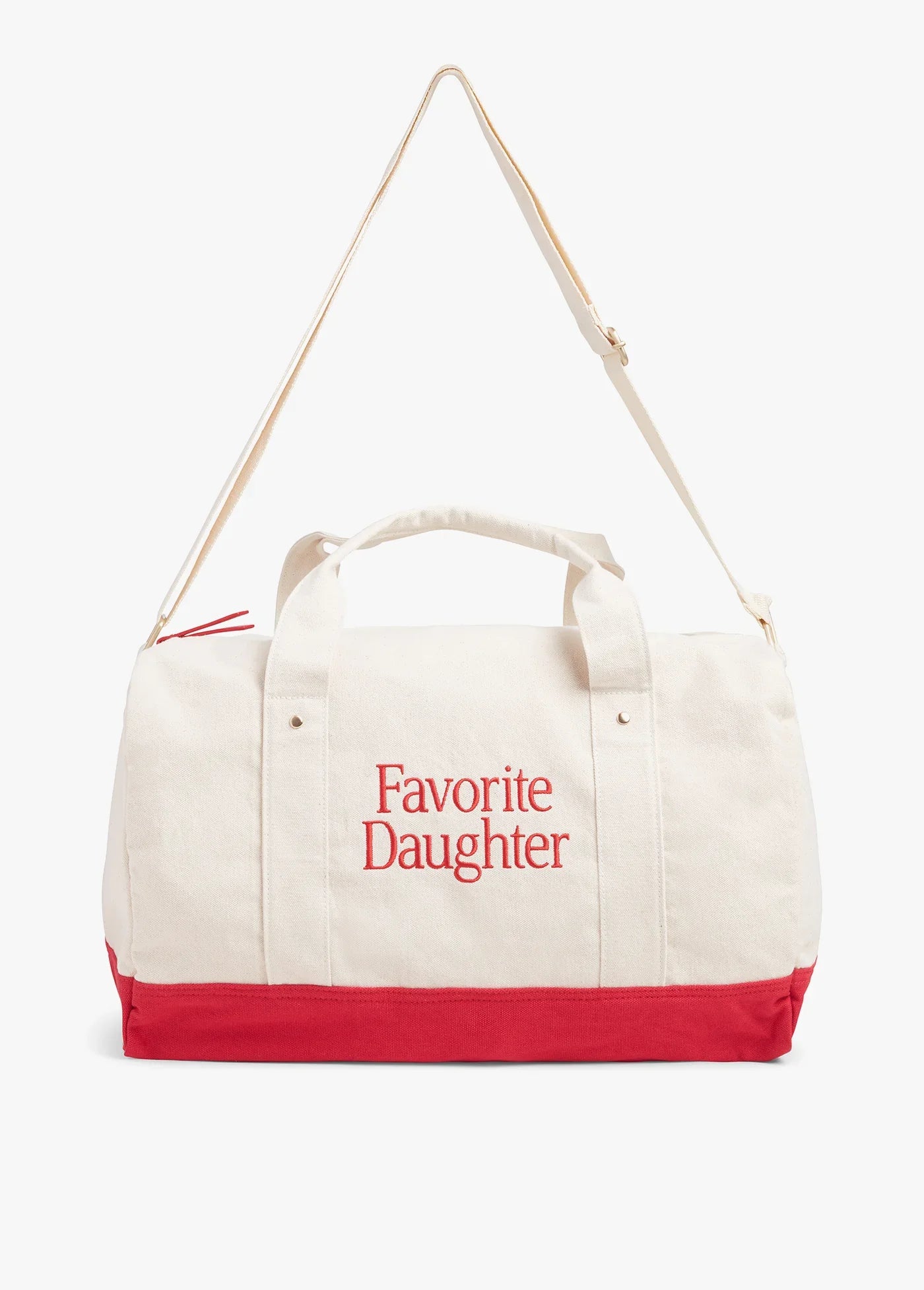Durably crafted from cotton canvas with an adjustable strap and a distinctive green base, this duffle bag is your perfect weekend companion. Featuring the Favorite Daughter logo, it blends classic style with practicality, making it ideal for family reunions or any getaway. Reliable and stylish, it’s designed to keep up with wherever your weekend adventures lead.