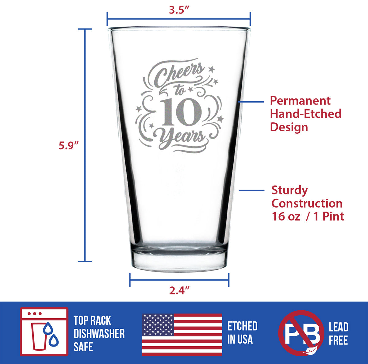 Cheers to 10 Years - Pint Glass for Beer - Gifts for Women & Men - 10th Anniversary Party Decor - 16 Oz Glass