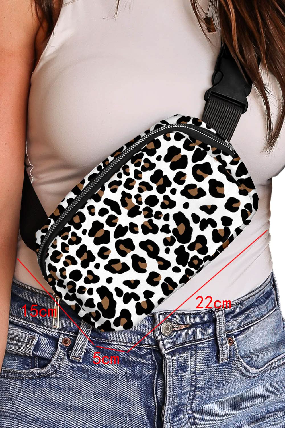 Dimensions: 22 cm (L) x 15 cm (H) x 5 cm (D). Material: high-quality nylon. Color: white with cheetah print. Closure: secure zipped closure.