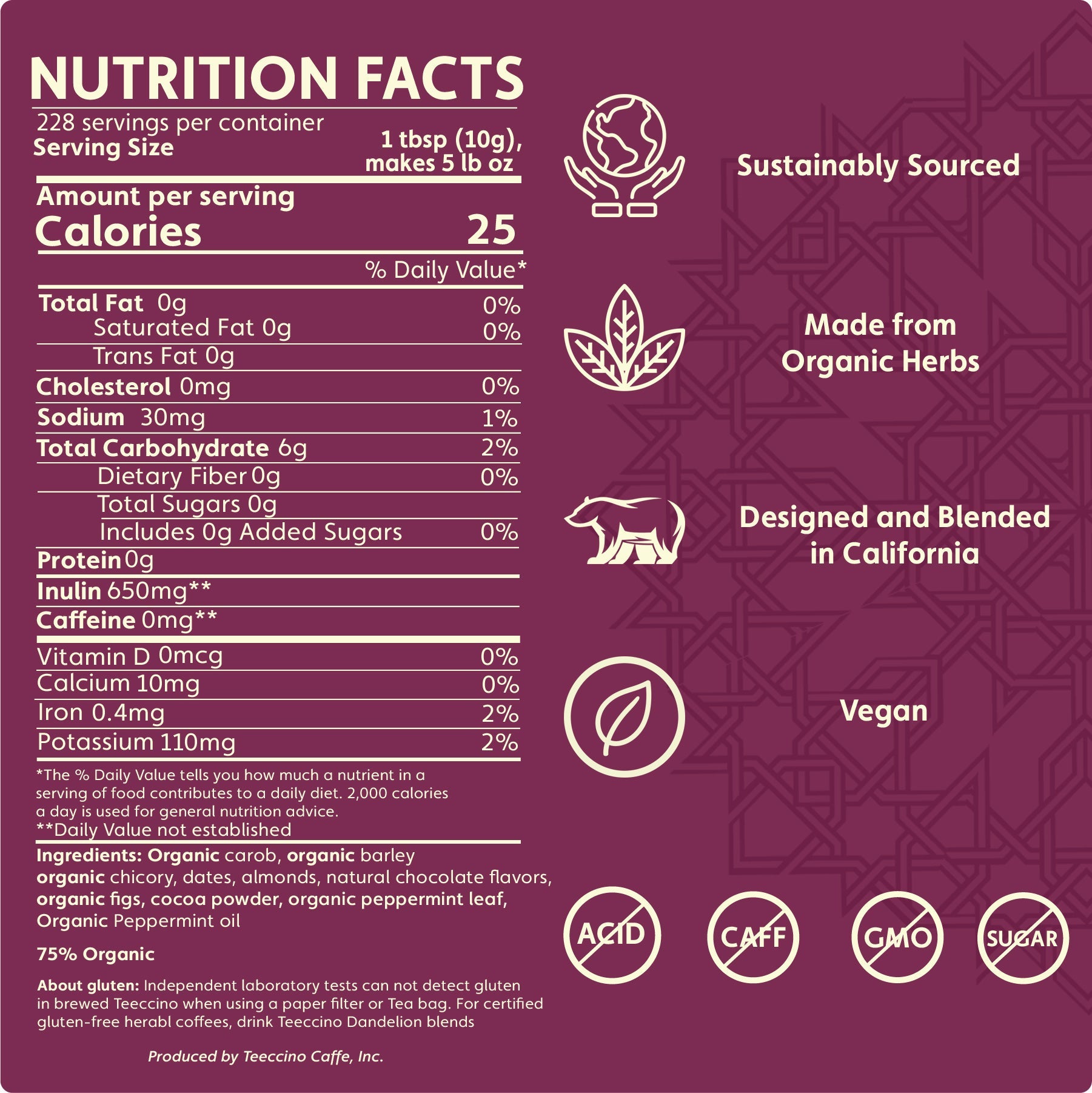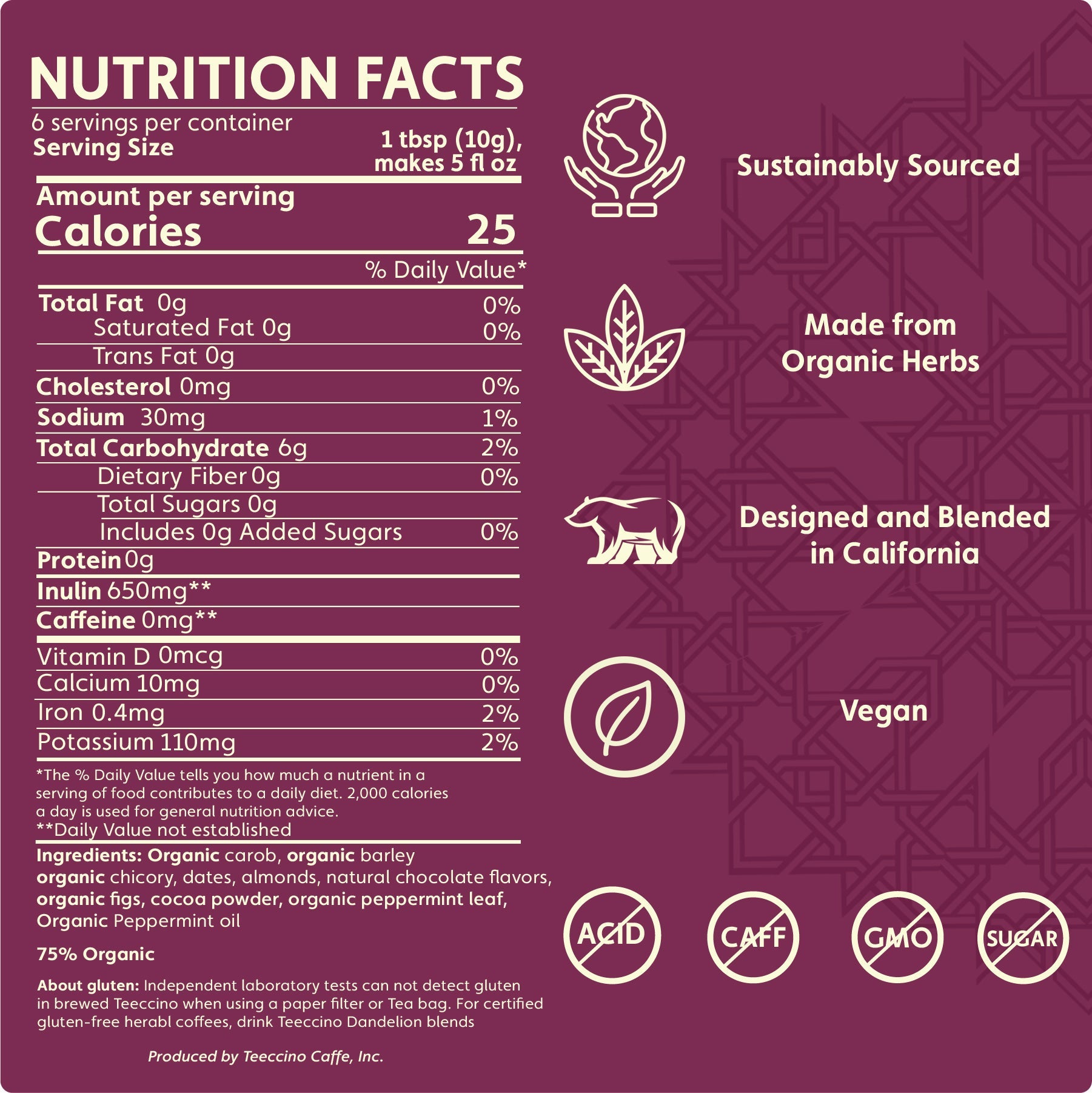 The coolness of green peppermint accents ultra-rich cocoa in a fruity, bright body, slightly sweetened by dates and figs. Perfect for making iced Teeccino.