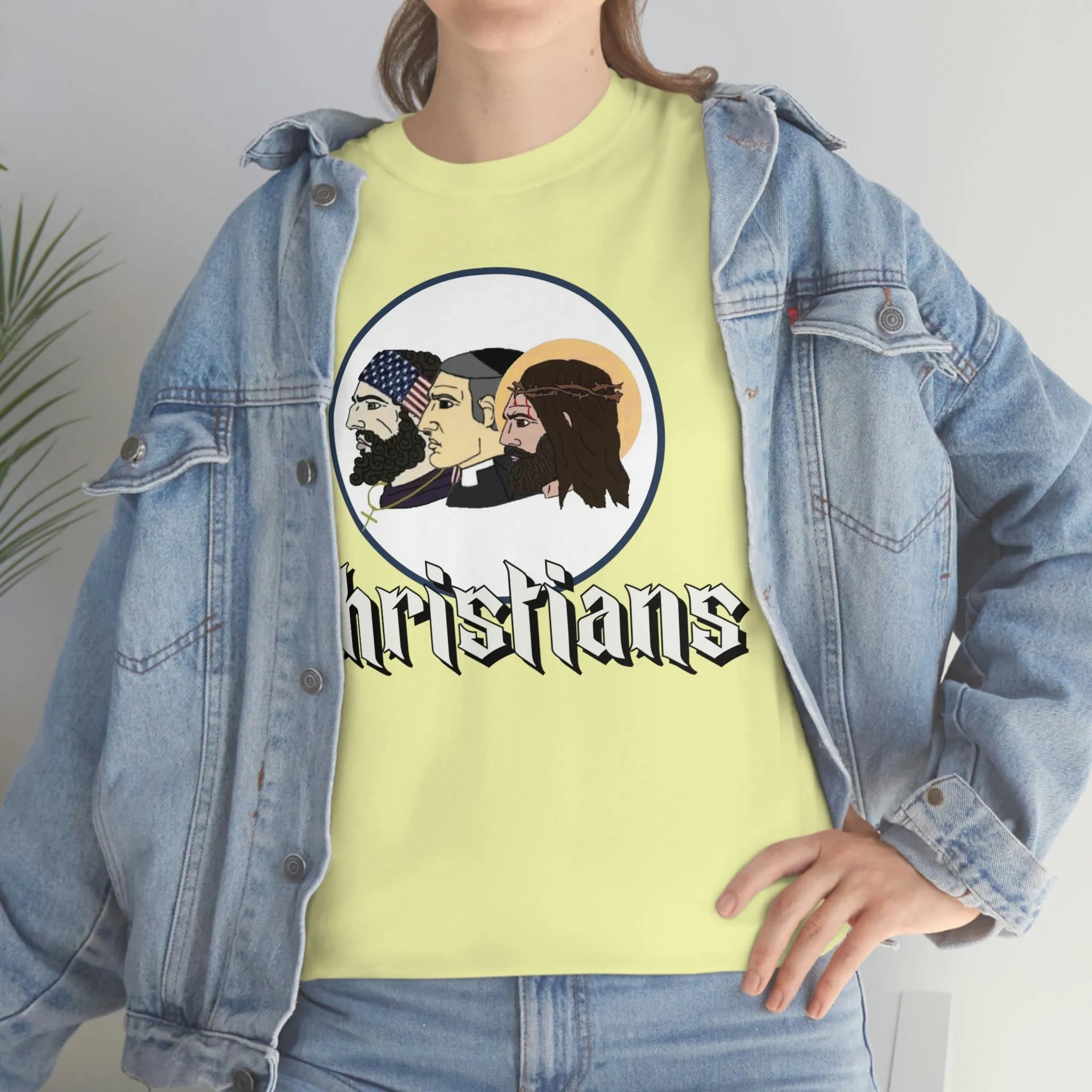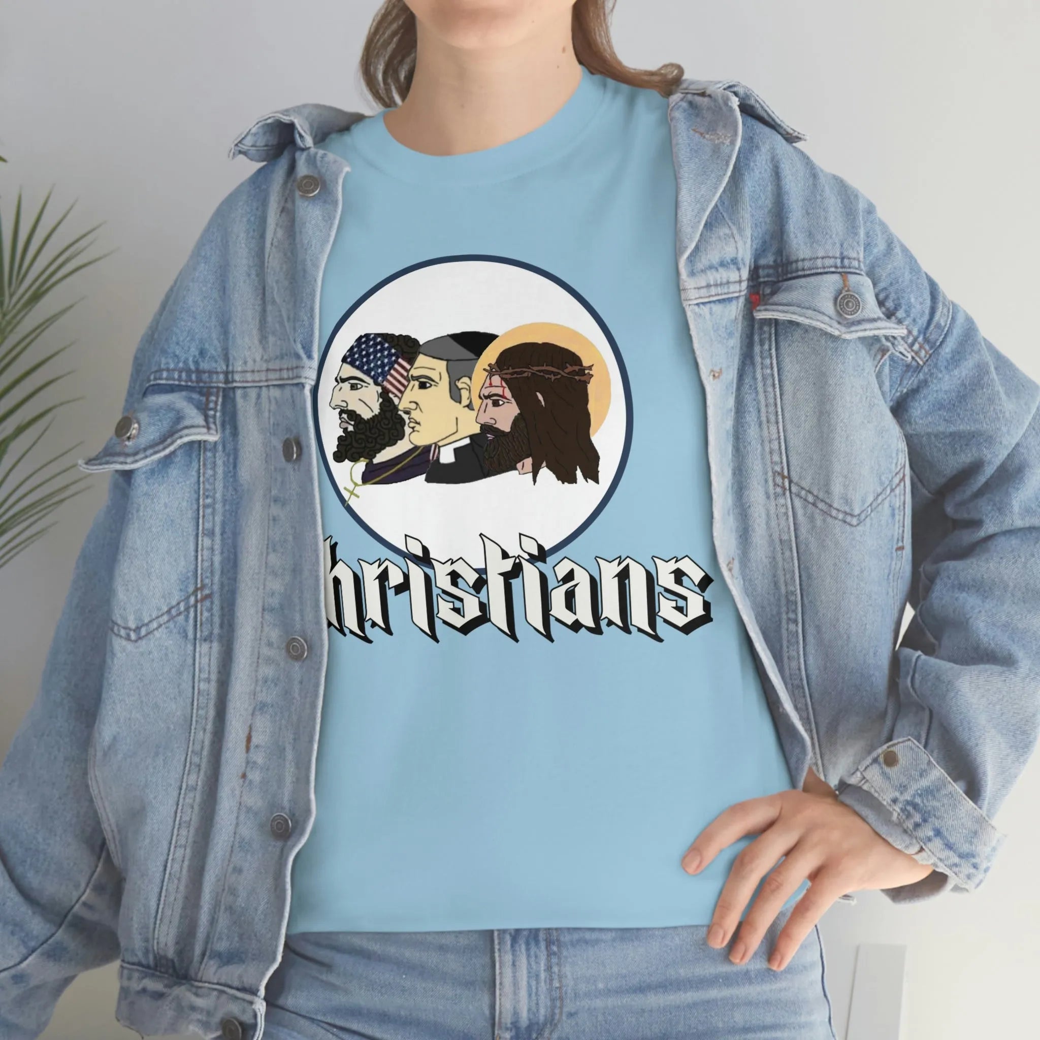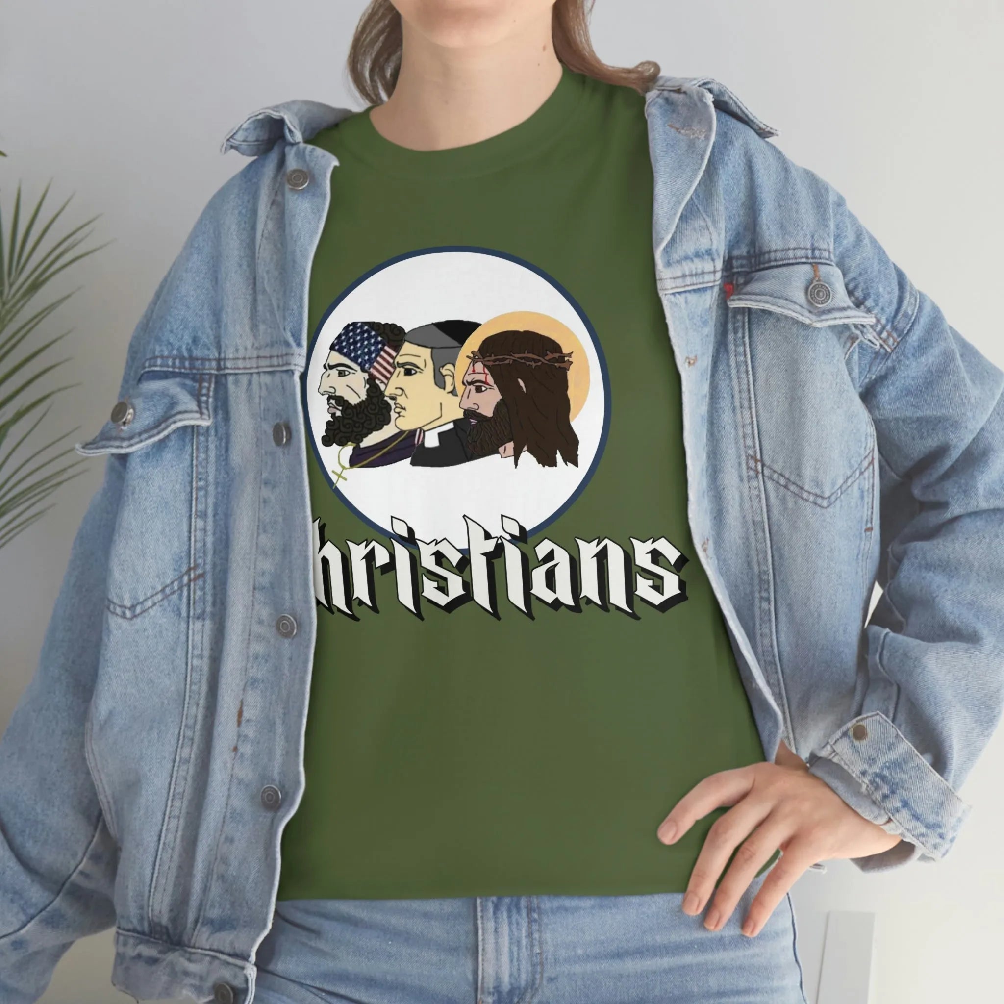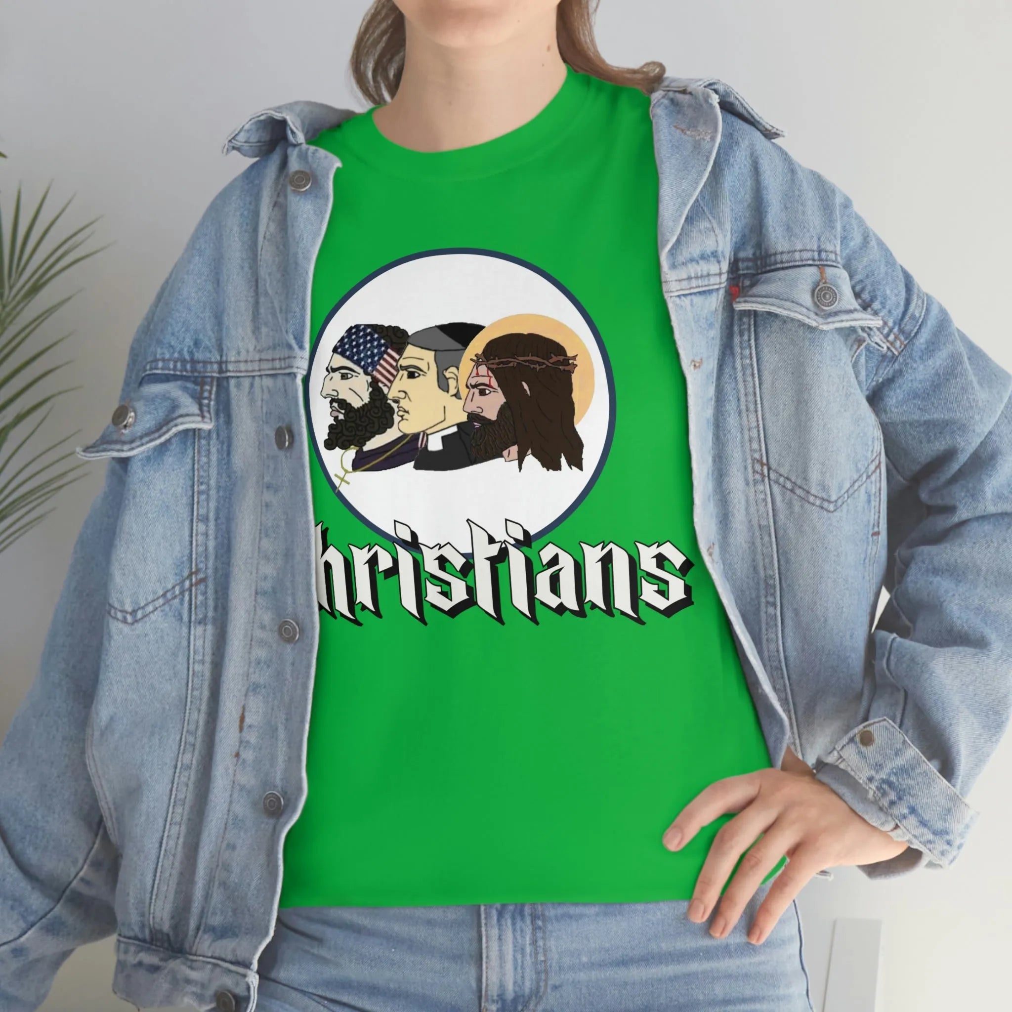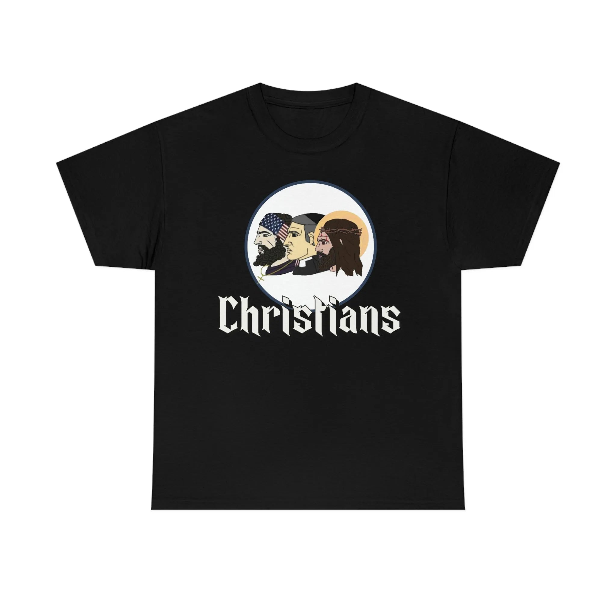 Looking for a shirt that combines your love for memes and sports? Look no further than our "Christian Chad" shirt! This shirt features the iconic Chad meme as a team logo featuring the Chad priest, the Chad American fundie, and the original son of God himself, Jesus Christ! Featuring the logo "Christians" underneath it, taking a humorous jab at the controversial "Redskins" logo.