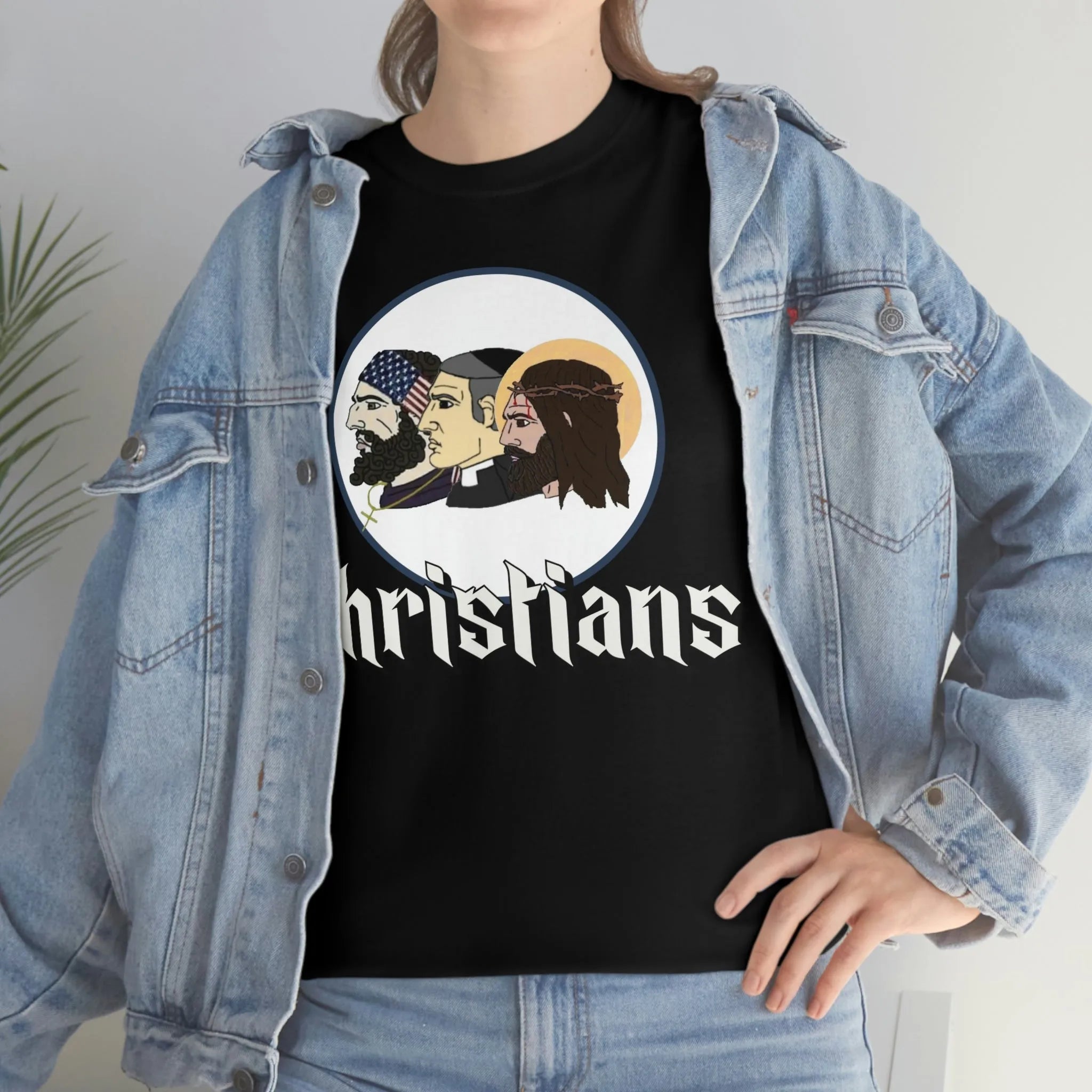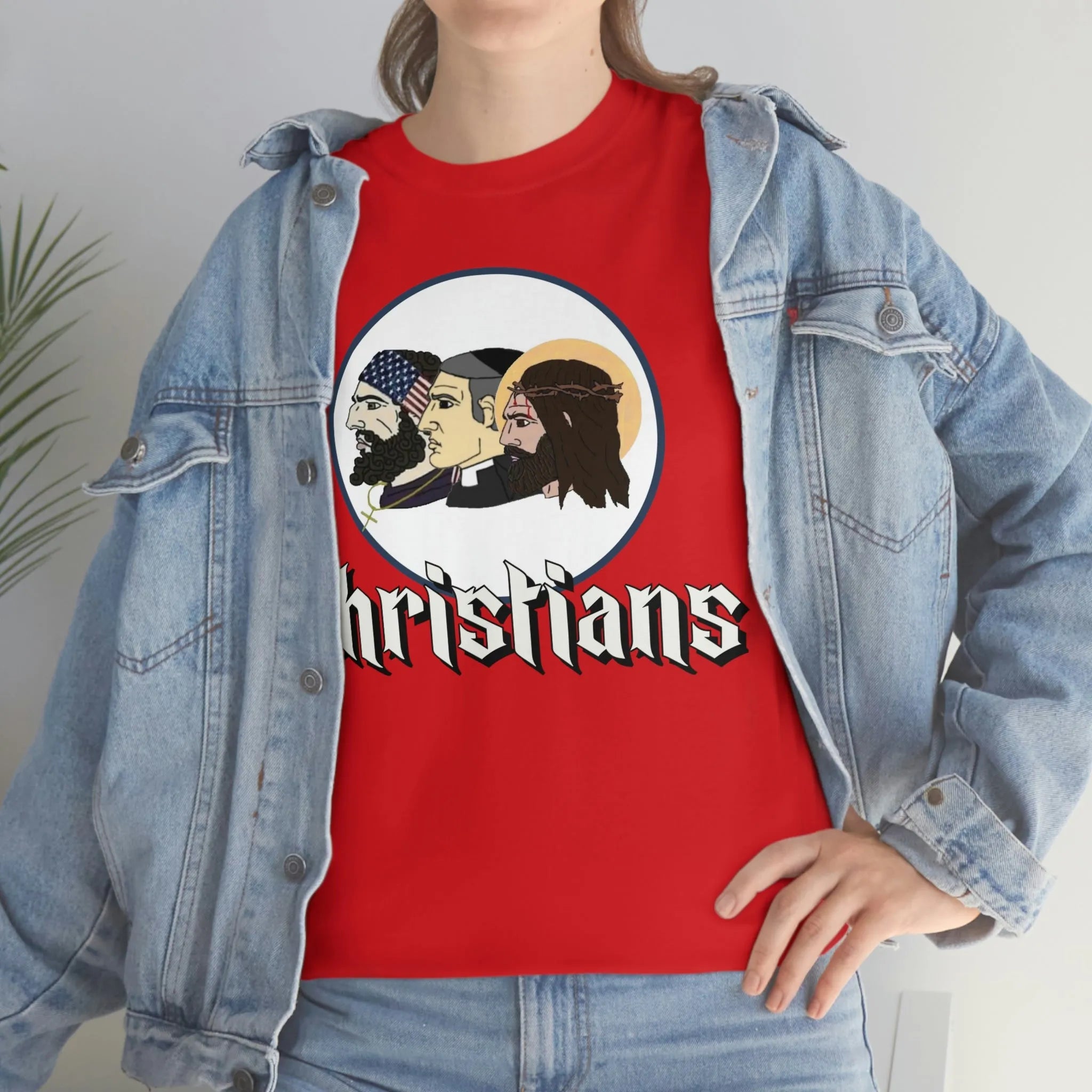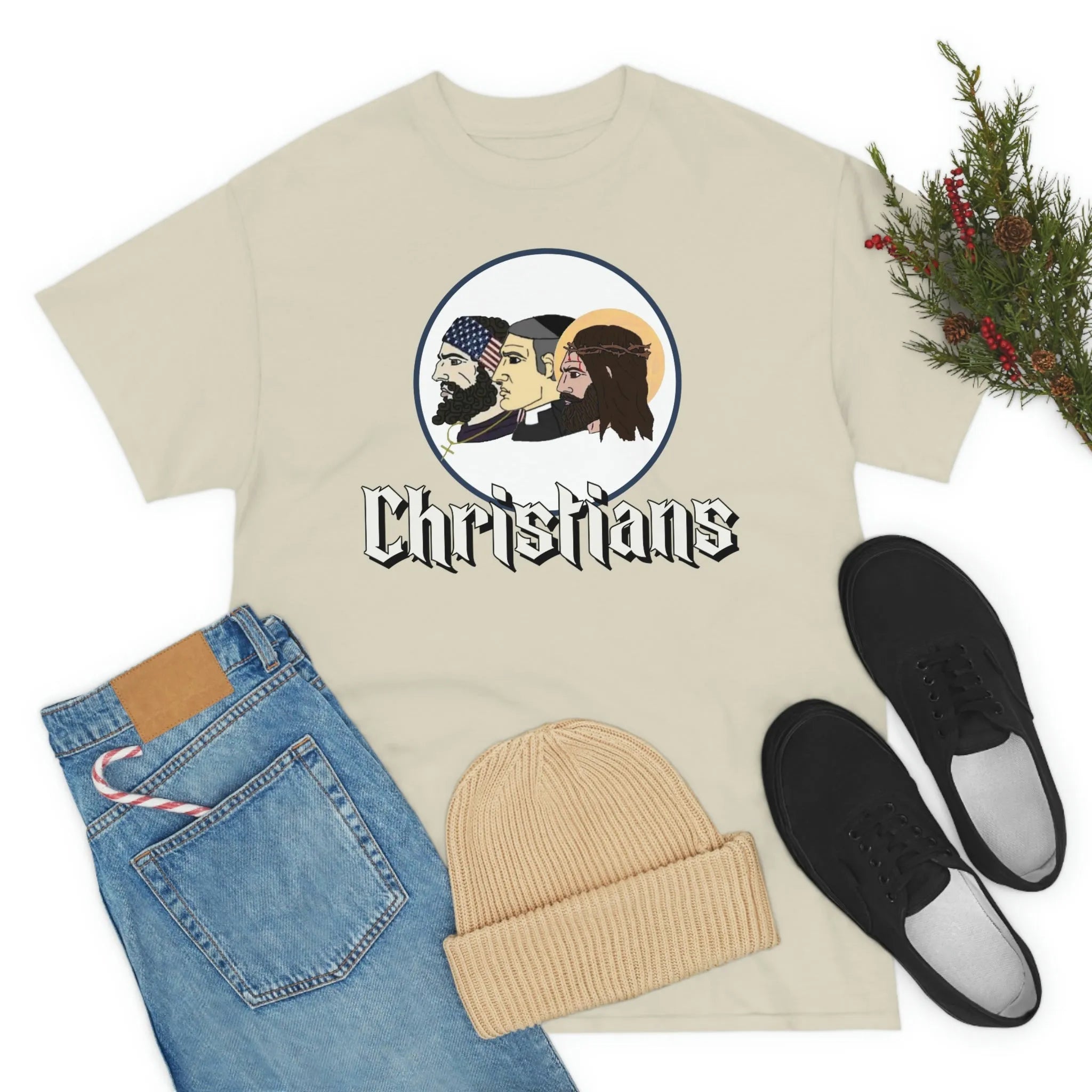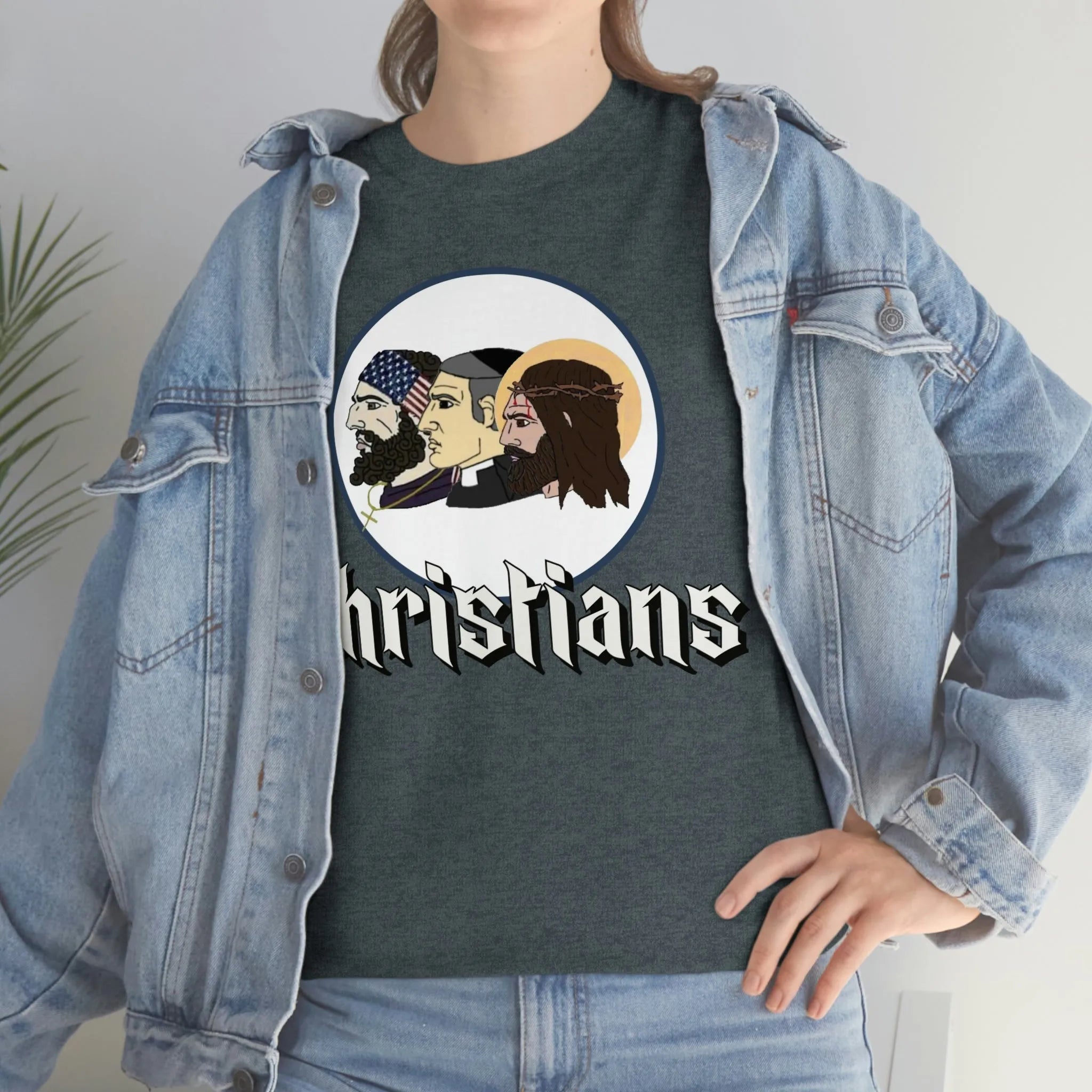 Looking for a shirt that combines your love for memes and sports? Look no further than our "Christian Chad" shirt! This shirt features the iconic Chad meme as a team logo featuring the Chad priest, the Chad American fundie, and the original son of God himself, Jesus Christ! Featuring the logo "Christians" underneath it, taking a humorous jab at the controversial "Redskins" logo.