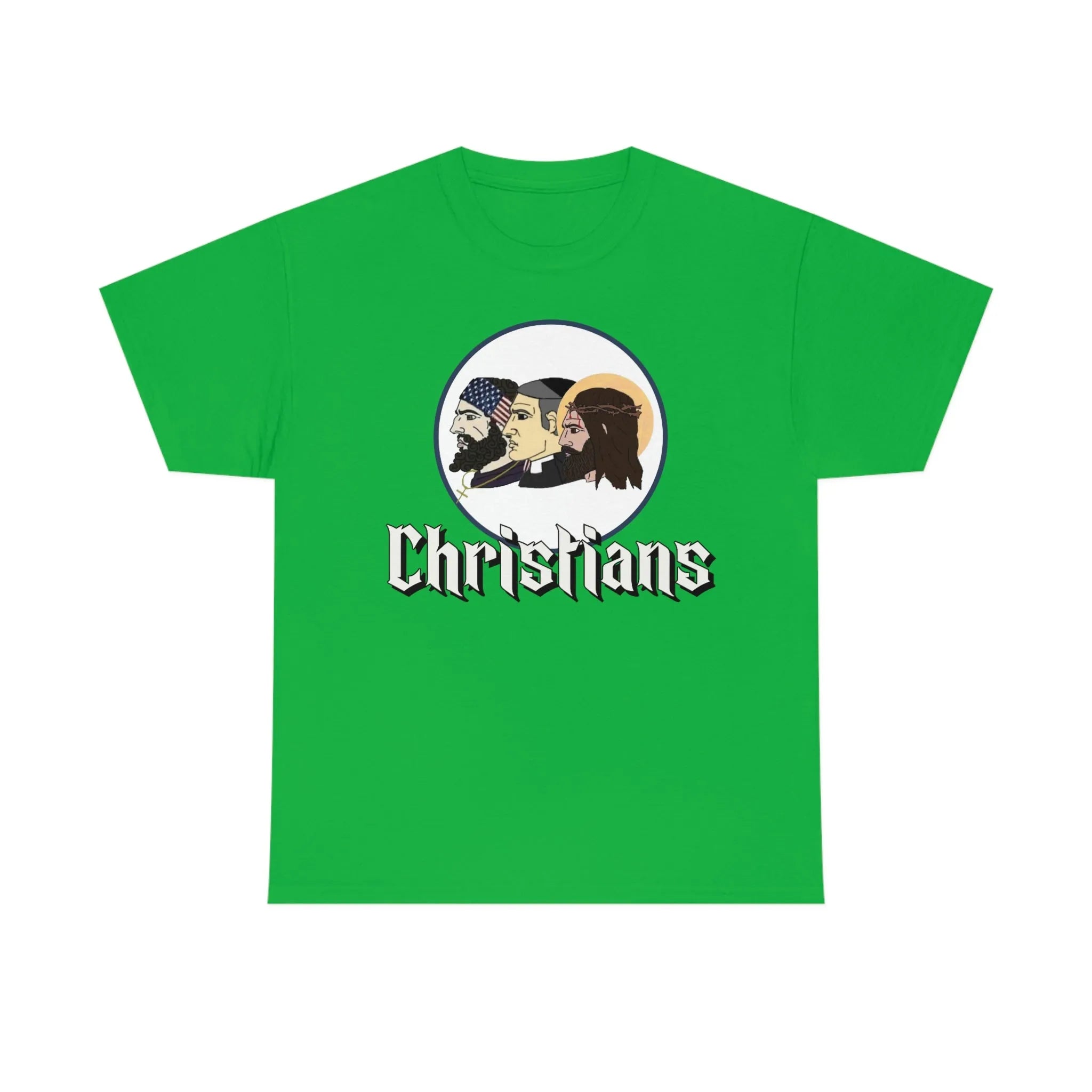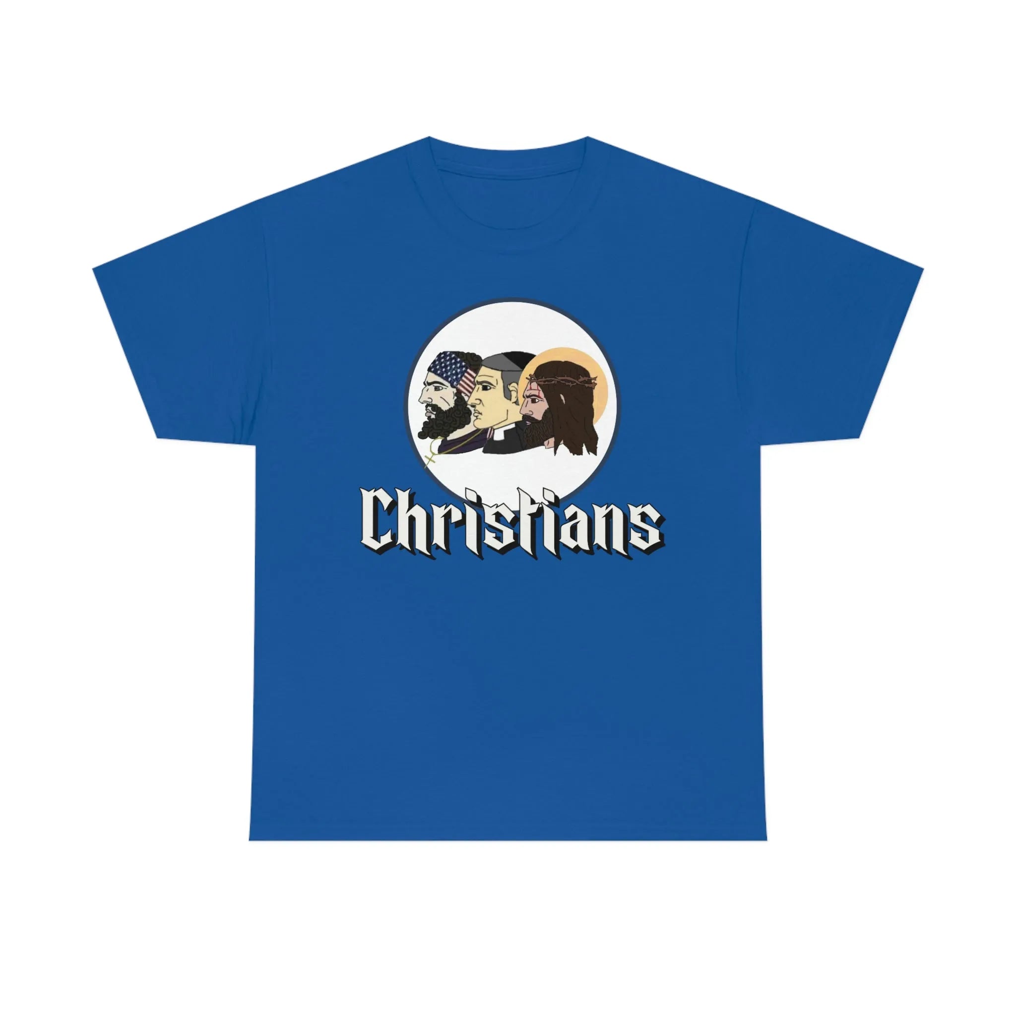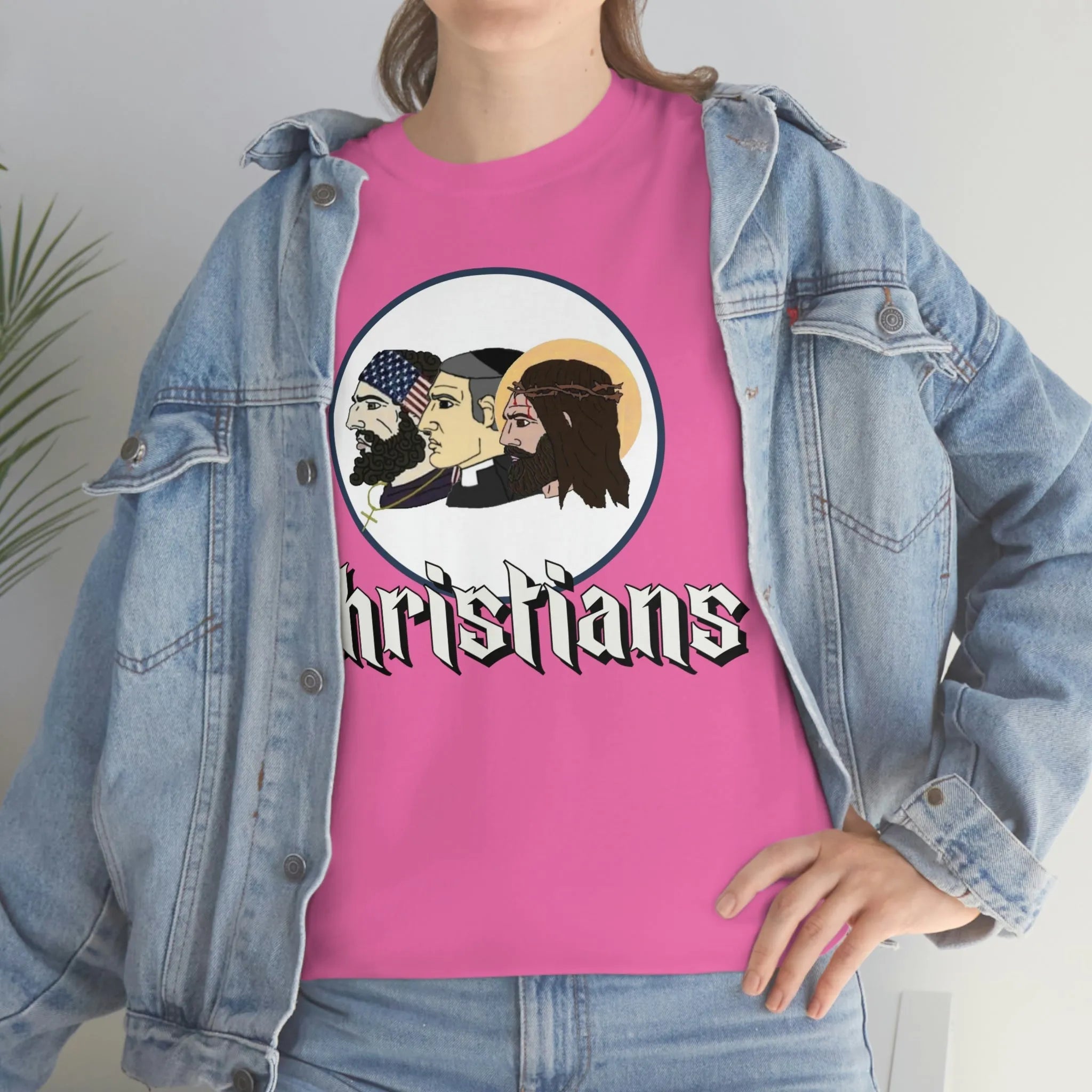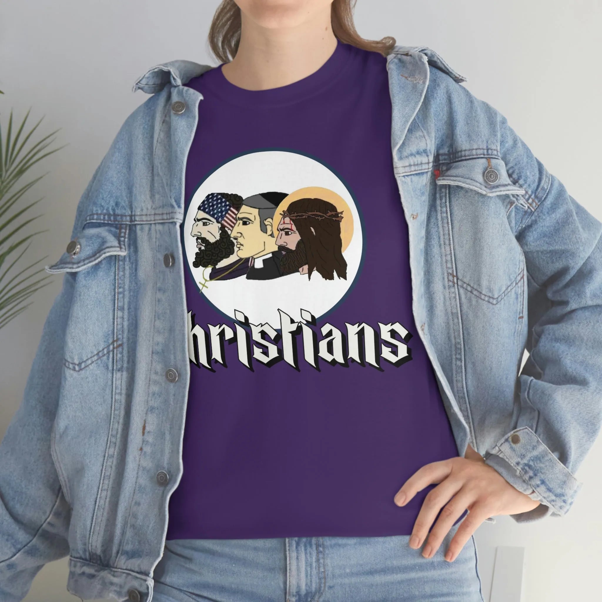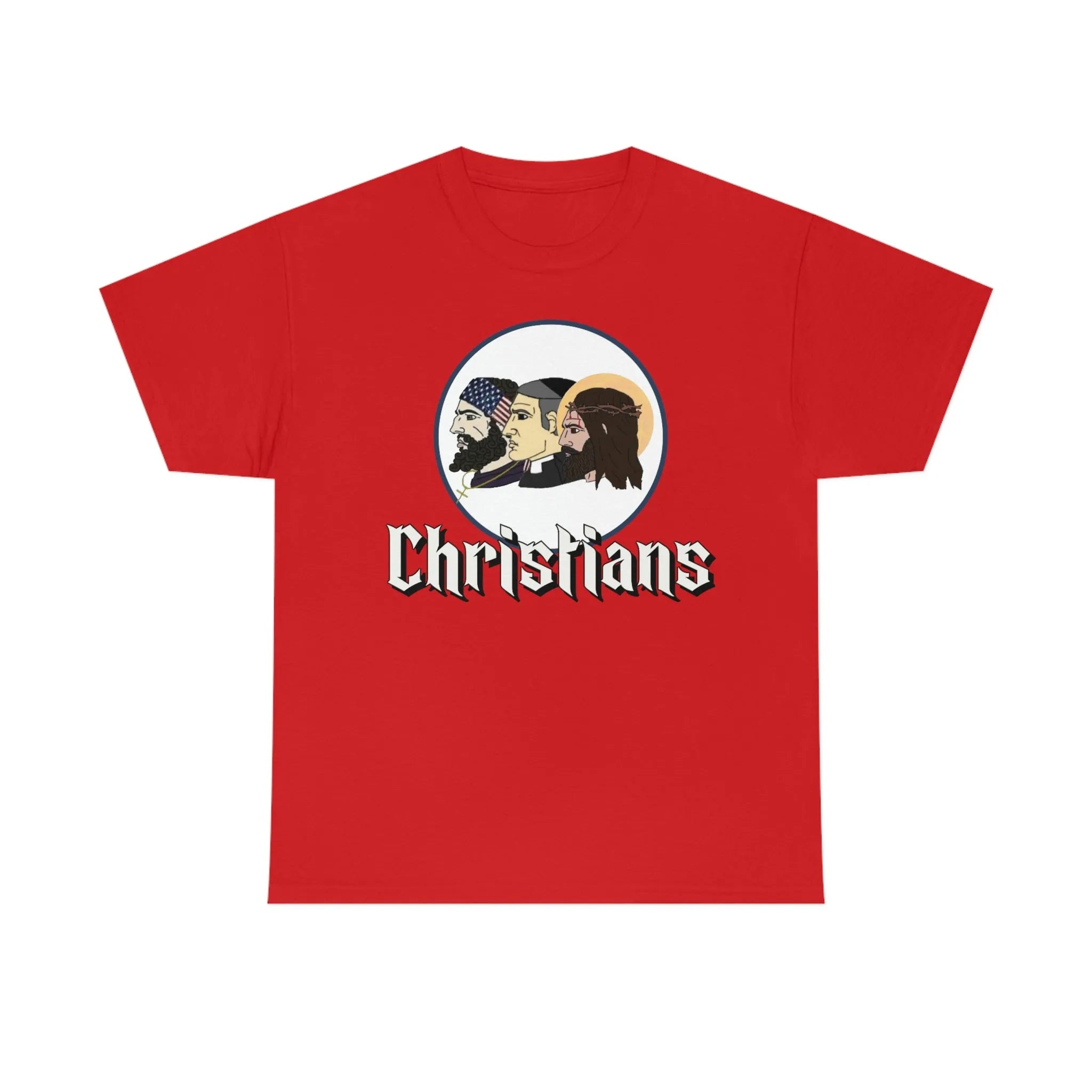 Looking for a shirt that combines your love for memes and sports? Look no further than our "Christian Chad" shirt! This shirt features the iconic Chad meme as a team logo featuring the Chad priest, the Chad American fundie, and the original son of God himself, Jesus Christ! Featuring the logo "Christians" underneath it, taking a humorous jab at the controversial "Redskins" logo.