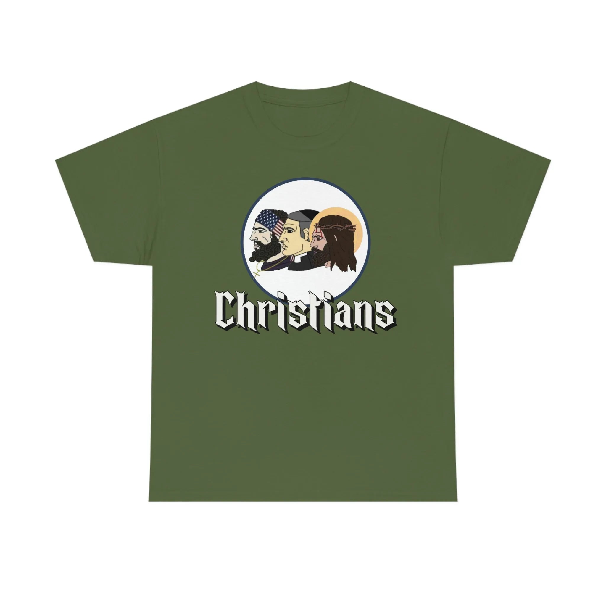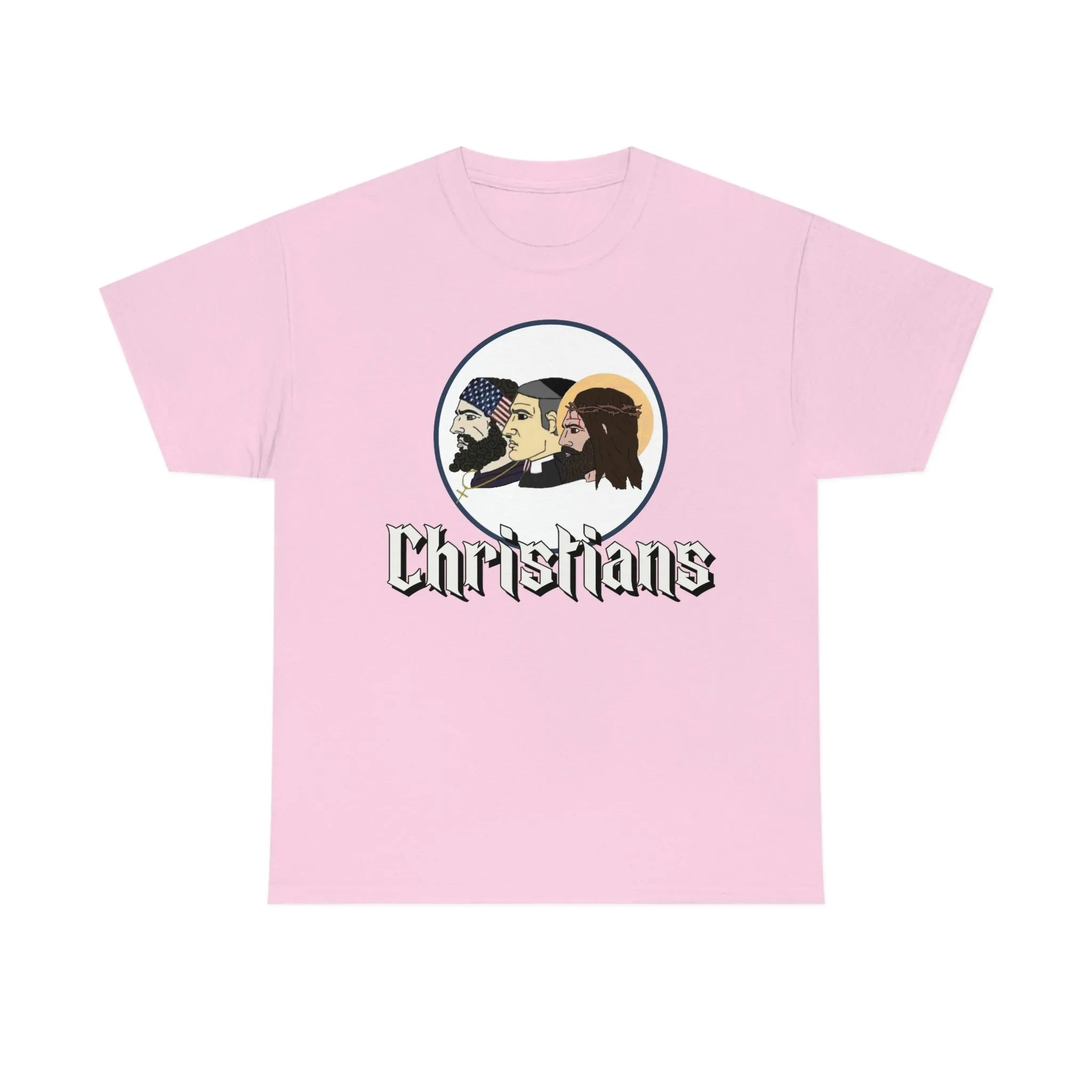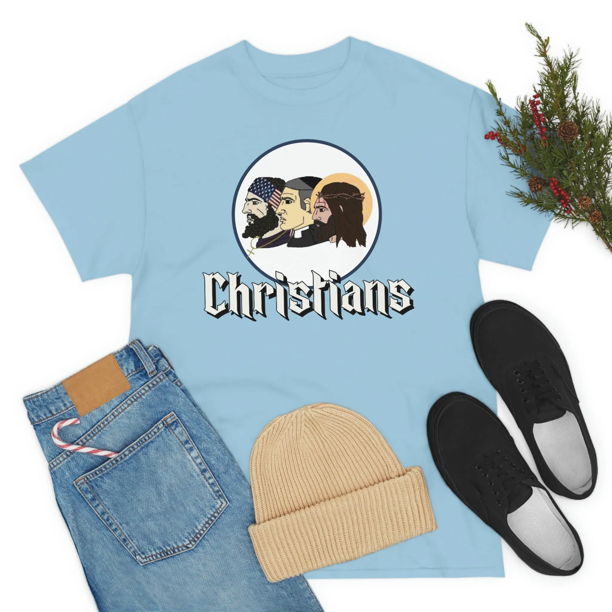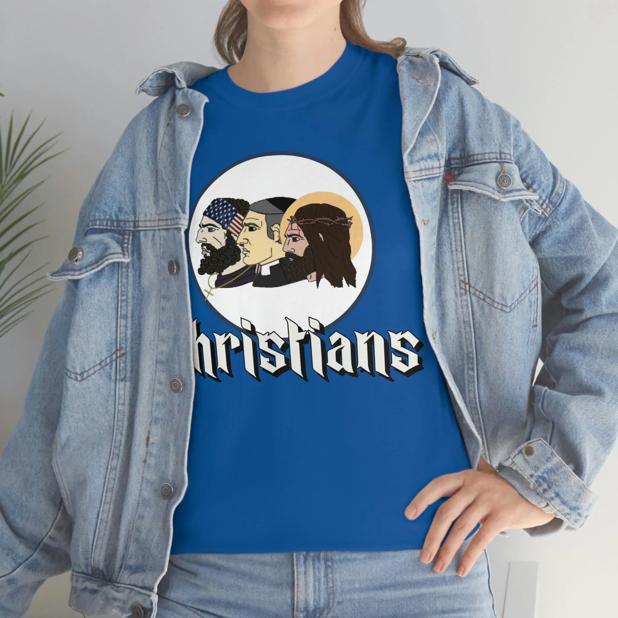 Looking for a shirt that combines your love for memes and sports? Look no further than our "Christian Chad" shirt! This shirt features the iconic Chad meme as a team logo featuring the Chad priest, the Chad American fundie, and the original son of God himself, Jesus Christ! Featuring the logo "Christians" underneath it, taking a humorous jab at the controversial "Redskins" logo.