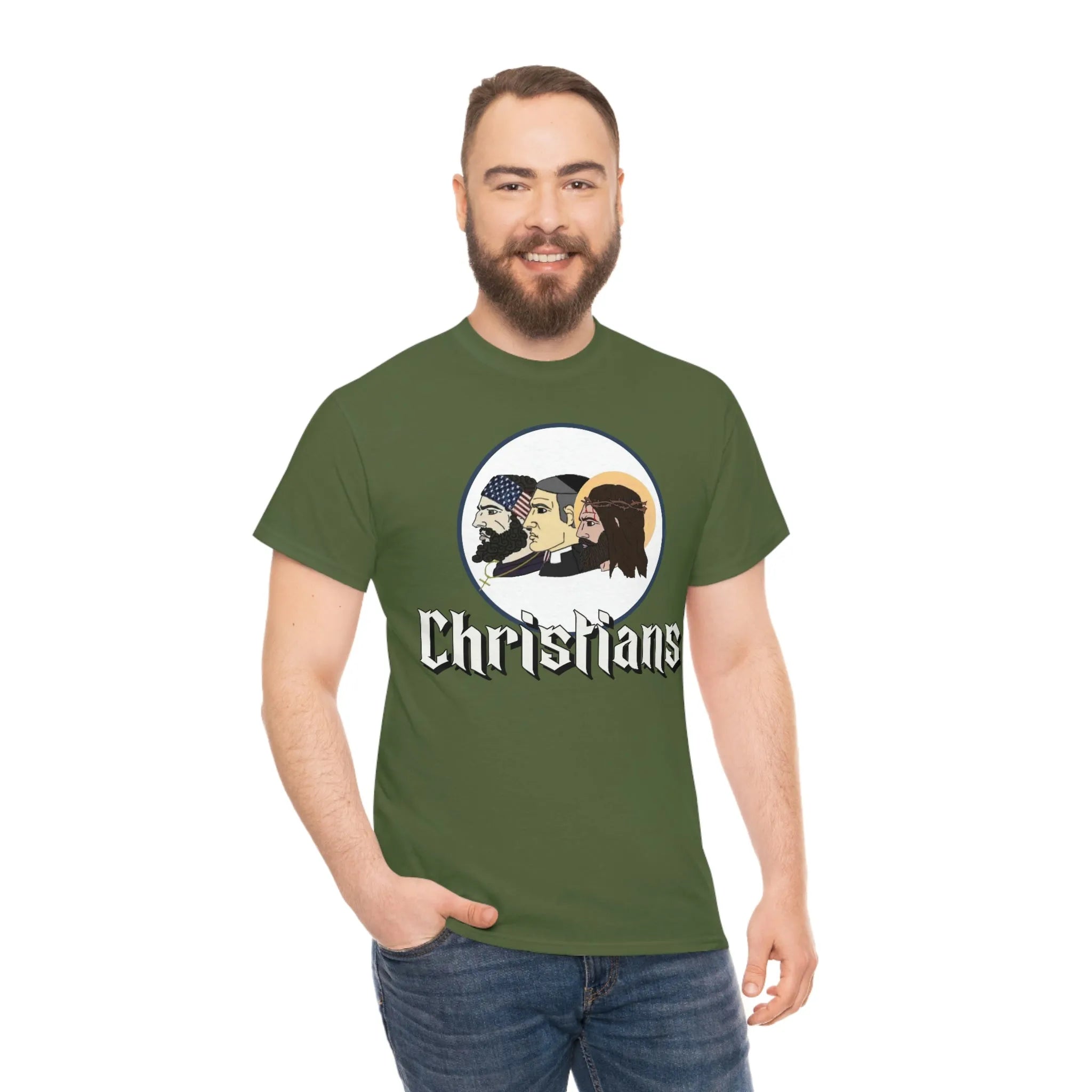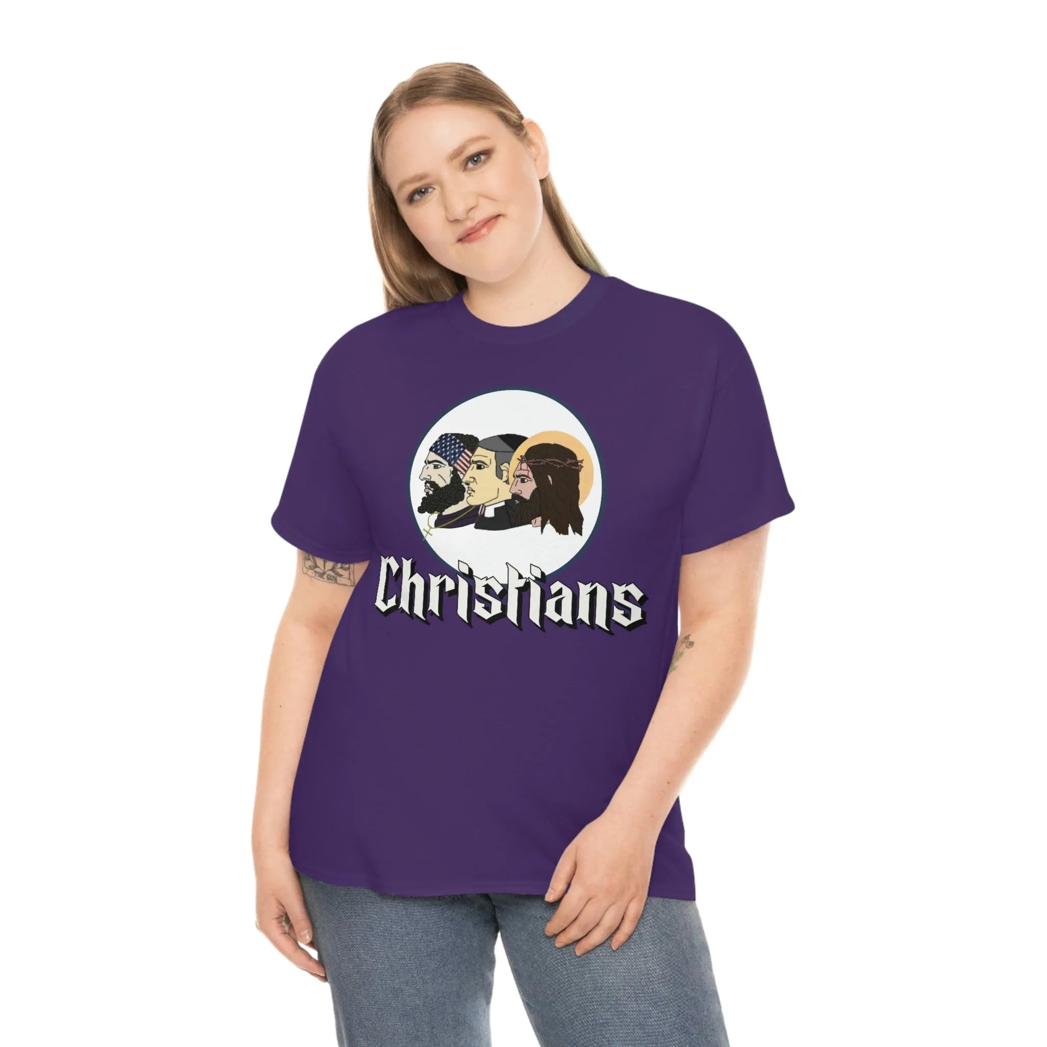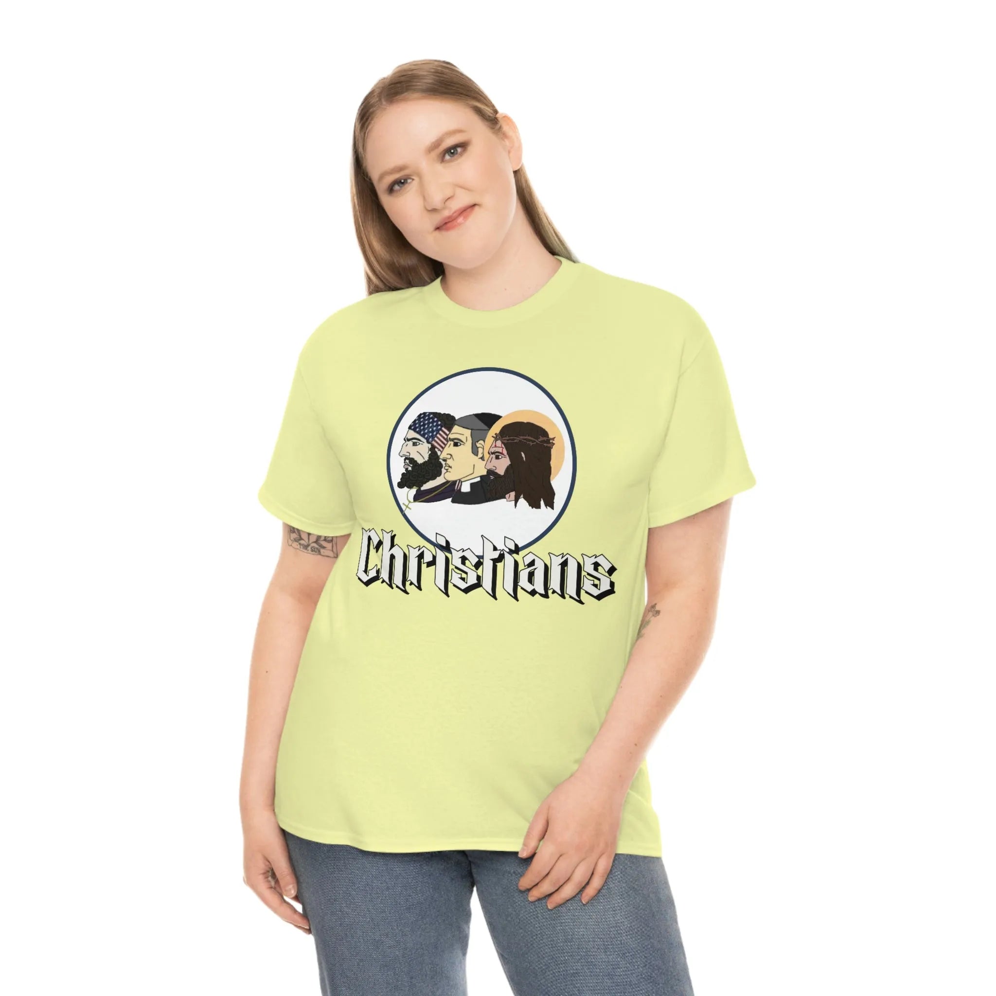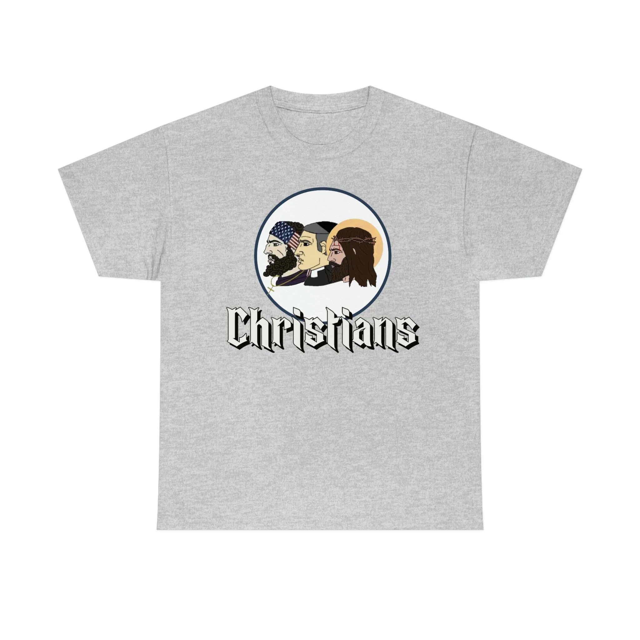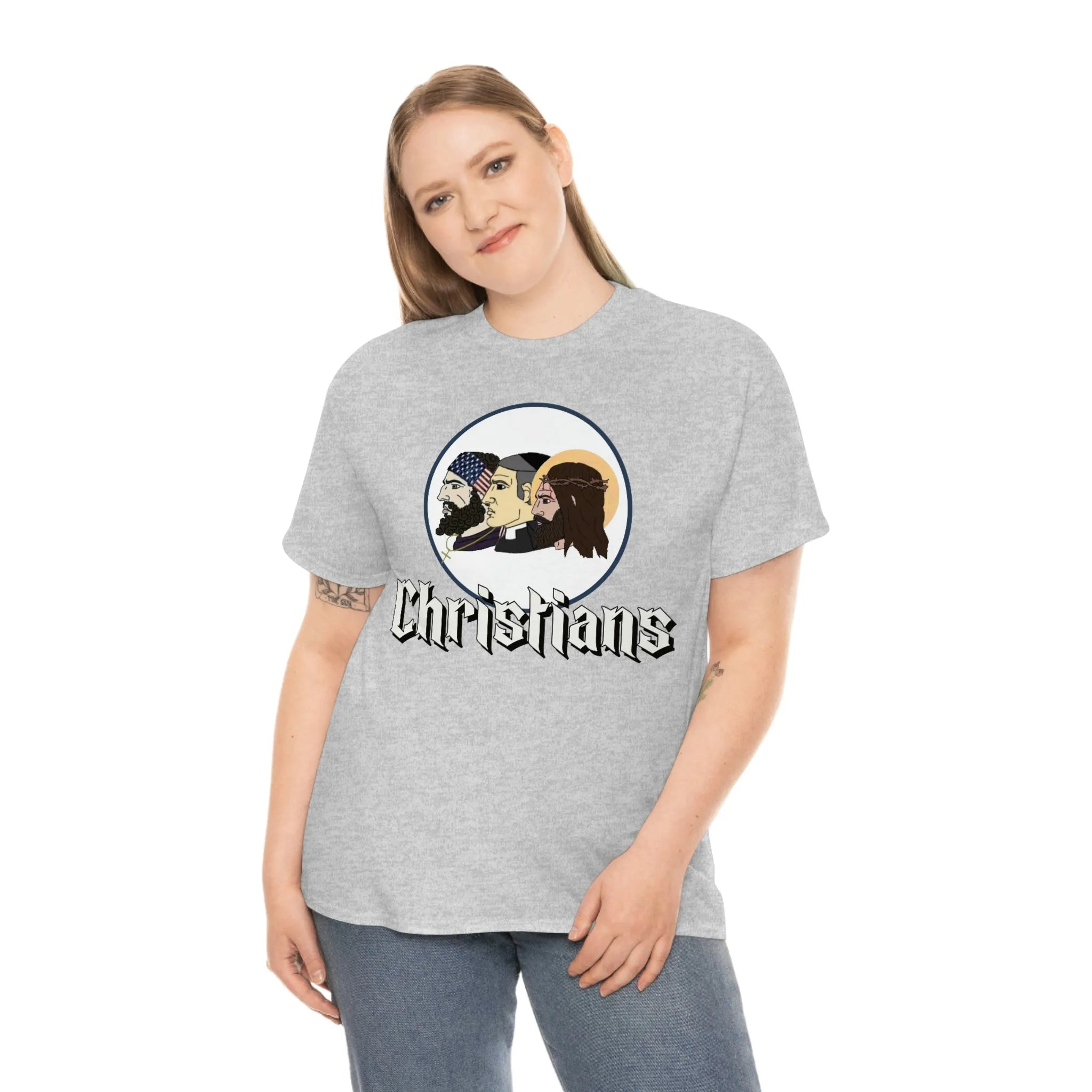 Looking for a shirt that combines your love for memes and sports? Look no further than our "Christian Chad" shirt! This shirt features the iconic Chad meme as a team logo featuring the Chad priest, the Chad American fundie, and the original son of God himself, Jesus Christ! Featuring the logo "Christians" underneath it, taking a humorous jab at the controversial "Redskins" logo.