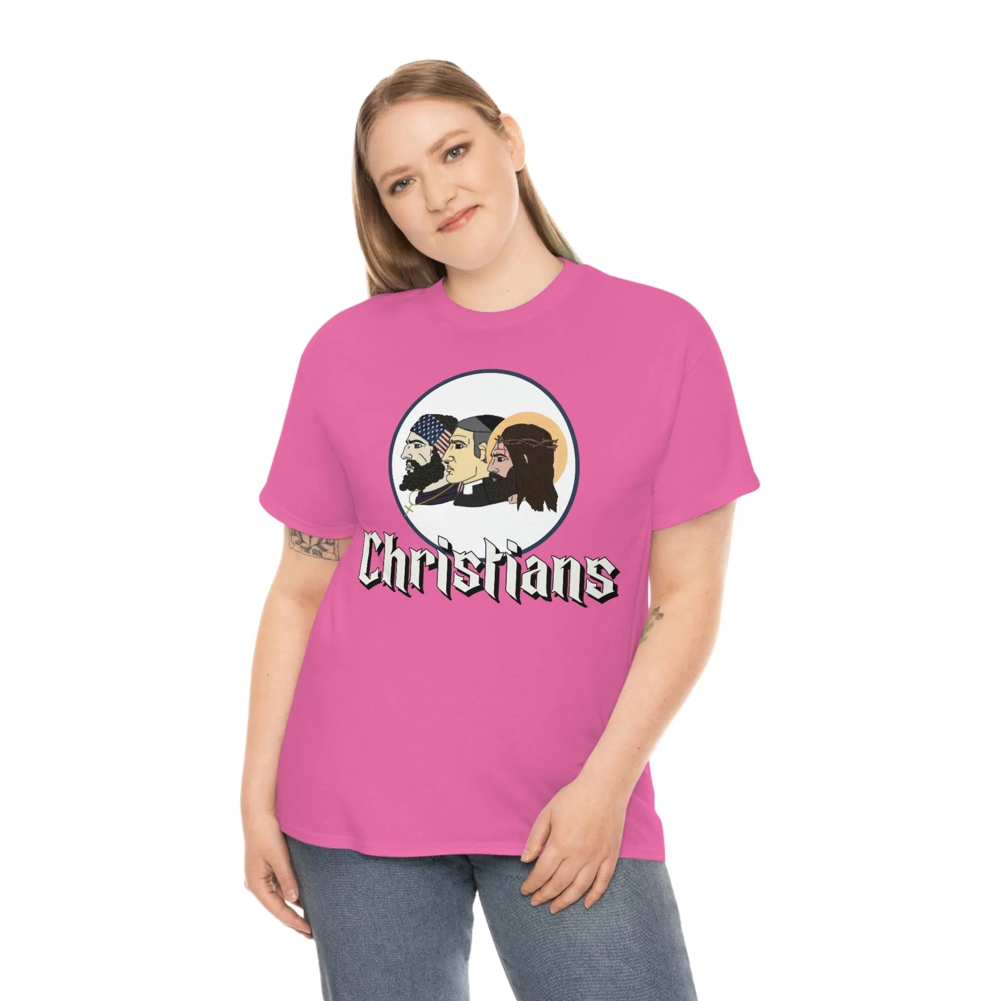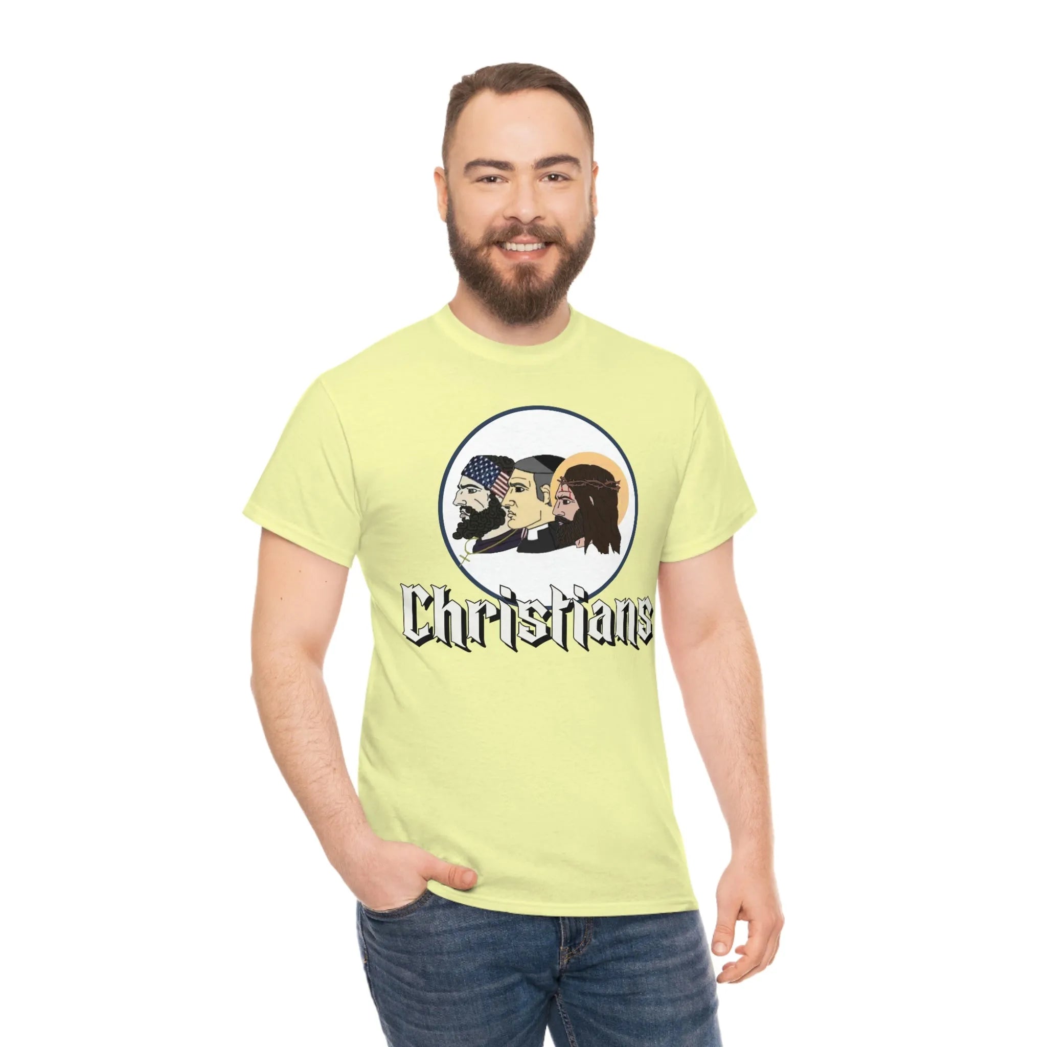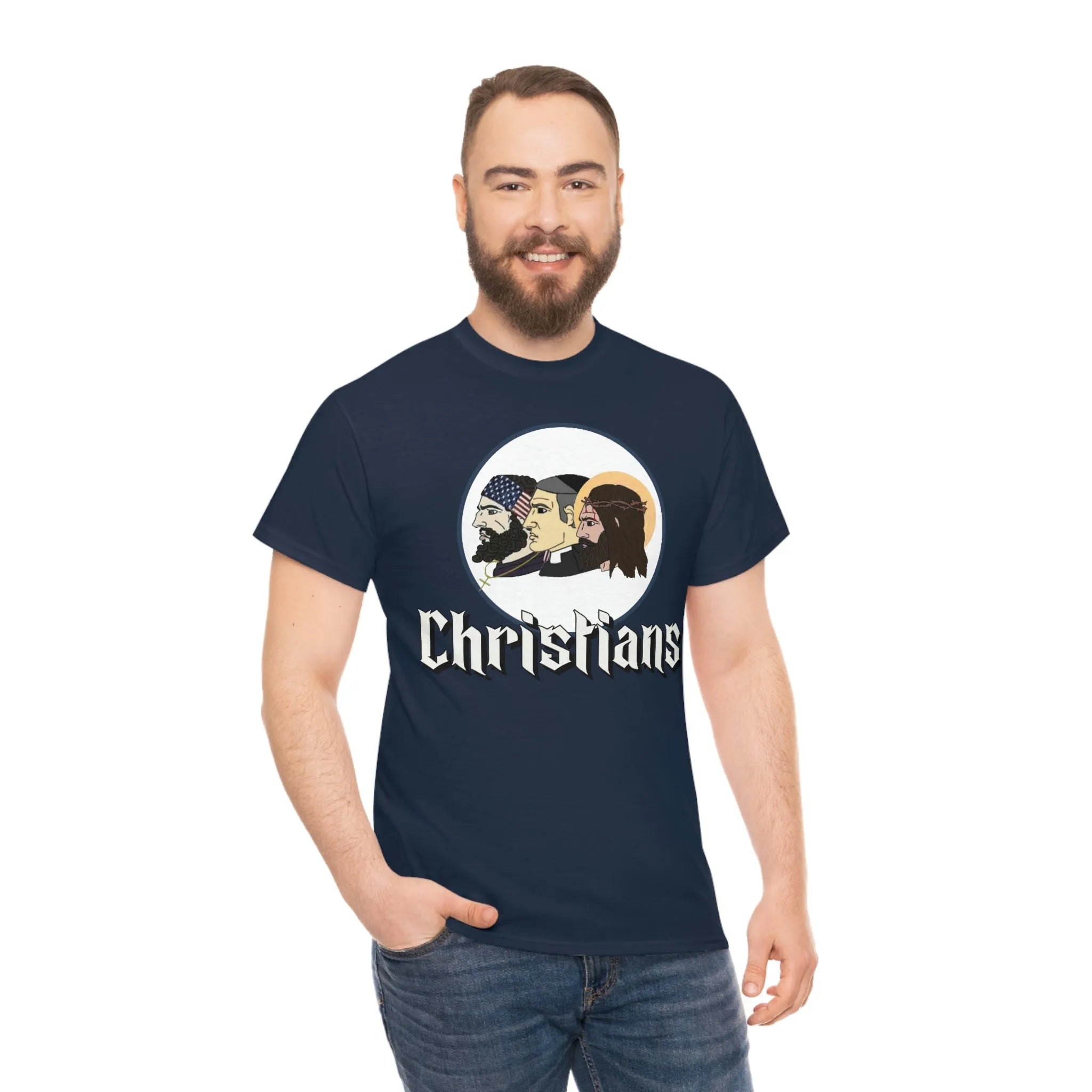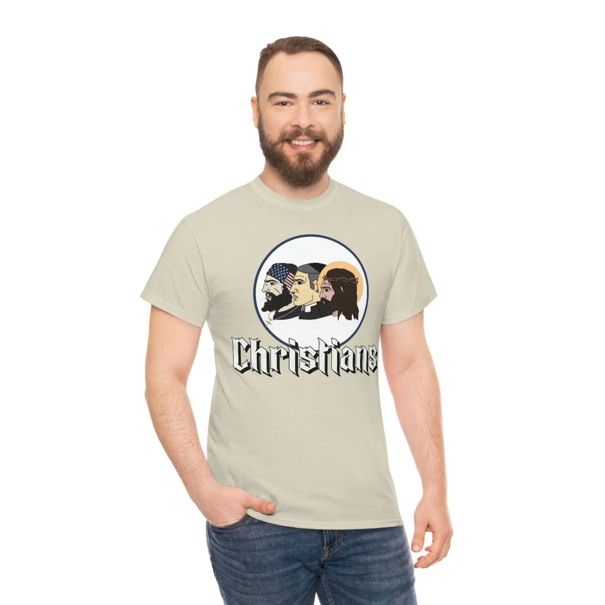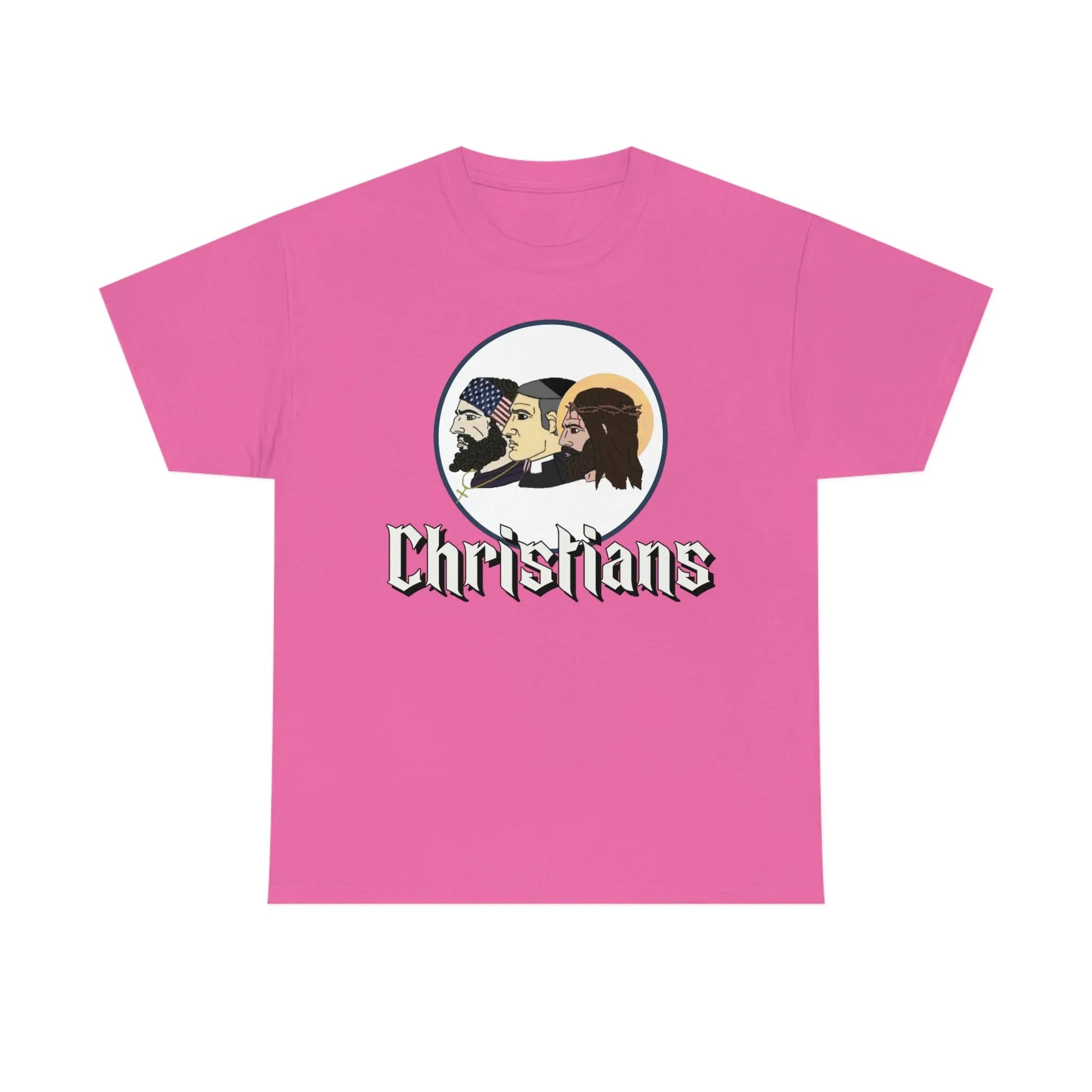 Looking for a shirt that combines your love for memes and sports? Look no further than our "Christian Chad" shirt! This shirt features the iconic Chad meme as a team logo featuring the Chad priest, the Chad American fundie, and the original son of God himself, Jesus Christ! Featuring the logo "Christians" underneath it, taking a humorous jab at the controversial "Redskins" logo.