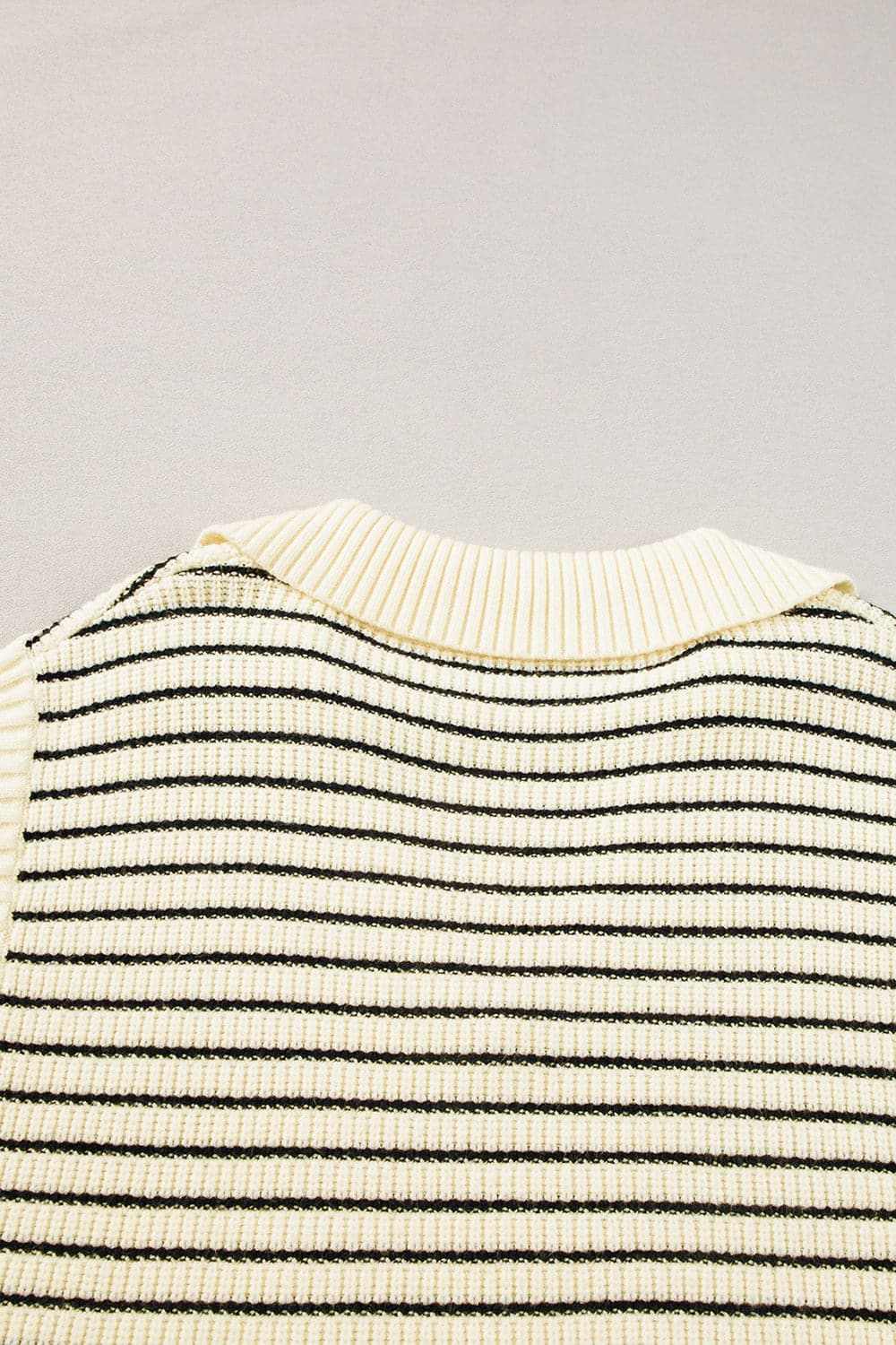 Elevate your wardrobe with this collared striped knit tank top. The design features a refined collar and a V-neckline, paired with a classic horizontal stripe pattern in a cream and black palette. The slightly sheer knit adds contemporary texture while remaining versatile for layering. A subtle stretch ensures a comfortable fit through daily wear, and the soft fabric drapes smoothly over the torso.