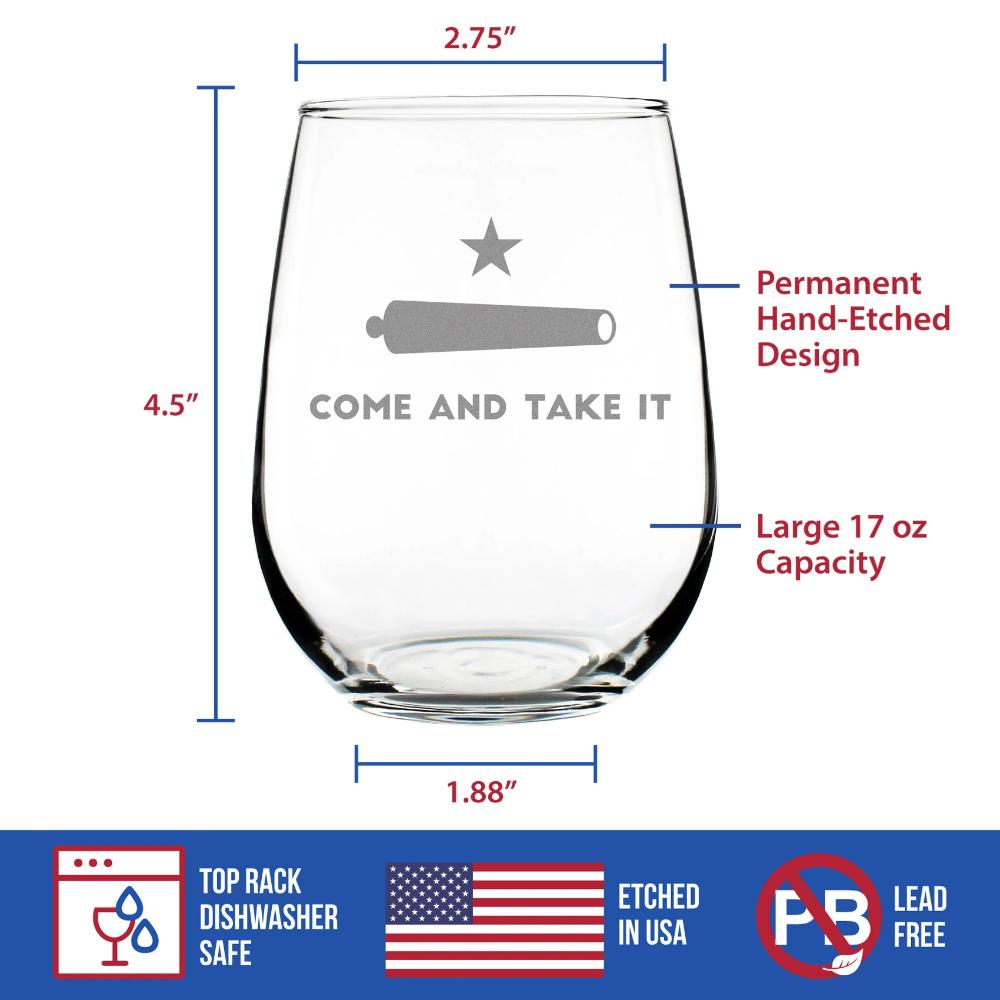 Come and Take It Texas Flag Stemless Wine Glass - Large 17 oz - Unique Engraved Glassware Art Gifts for Texans